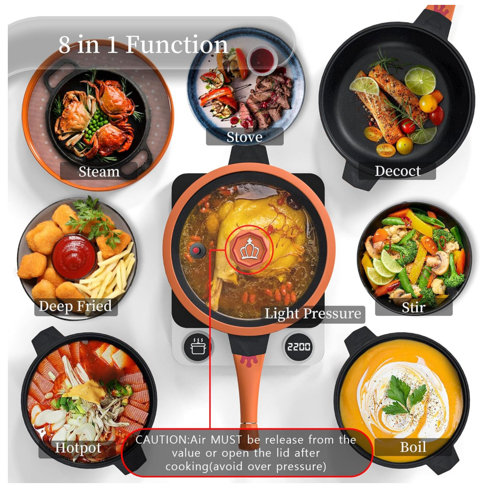 Esta panela antiaderente versátil é perfeita para frituras, cozimento sob pressão leve, vapor, ensopado, fervura, decocção, cozimento, mexer e ensopado, além de poder ser usada para fazer arroz. Ela pode substituir fritadeira, vaporizador, frigideira, panela de pressão leve, caçarola e assadeira, tornando se ideal para uma cozinha minimalista de uma panela. A superfície da panela é revestida de titânio, o que a torna definitivamente antiaderente e não tóxica, permitindo que você possa cozinhar sem óleo ou manteiga. Além disso, ela possui 5 camadas de placa de aço de indução para distribuição rápida e uniforme do calor de ponta a ponta, funcionando em todos os cooktops, incluindo fogões de indução, e é segura para forno até 260C. A frigideira funda antiaderente com tampa vem com uma microválvula de pressão de 10 KPA na borda, o que acelera o tempo de cozimento em comparação com o wok chinês tradicional. Ela é adequada para presentear seus parentes e amigos em diversas ocasiões, como feriados, casamentos, chás de panela, aniversários, festas de inauguração de casa para casais, dia das mães ou aniversário de um melhor amigo. A alça da panela do chef adota um parafuso invisível, o que a torna fácil de desmontar durante a lavagem, sem ferramentas necessárias, sem ferrugem, economizando espaço de armazenamento. A panela tem 4,66 litros, é muito funda, então você não precisa se preocupar com respingos de óleo em todos os lugares. O pacote inclui 1 x 4,66 litros All In One Pan, 1 x caixa de embalagem, 1 x tampa da panela, 1 x espátula de silicone, 1 x grade antiaderente para vapor wok, 1 x almofada de silicone antiaderente e 1 x guias de receitas do usuário. É importante lembrar que as panelas não suportam cozimento a seco por longo prazo e que é necessário verificar os alimentos na panela a tempo. Para a limpeza, use água morna e evite usar bolas de limpeza de aço inoxidável.