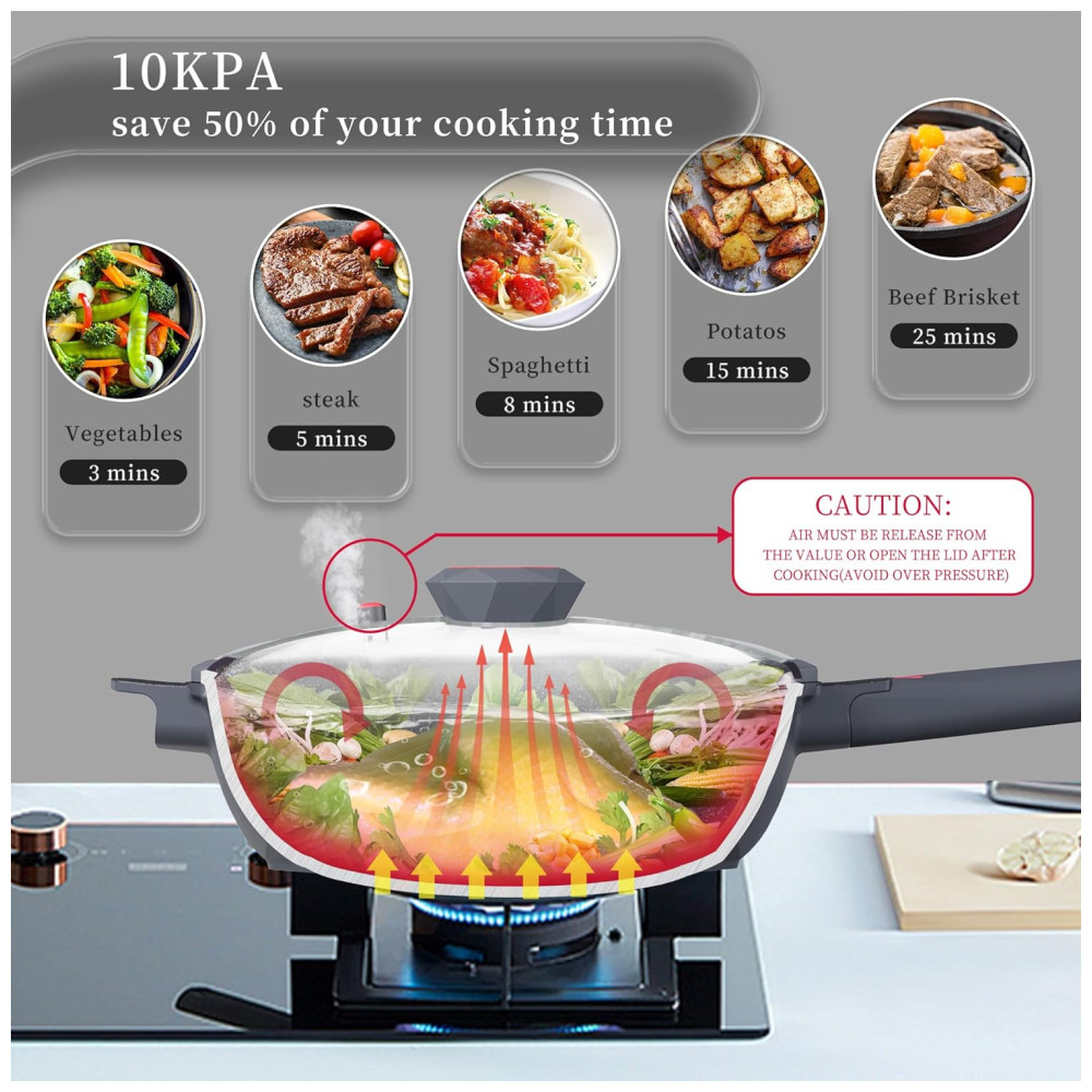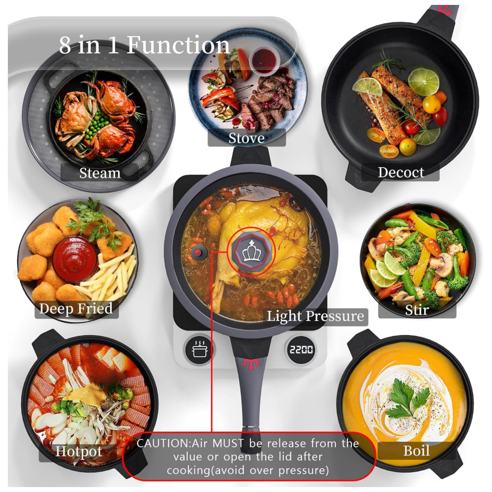 Esta panela antiaderente versátil é perfeita para várias funções na cozinha, como frituras, cozimento sob pressão leve, vapor, ensopados, fervura, decocção, cozimento, mexer e ensopado quente. Além disso, ela também pode ser usada para fazer arroz. Com a capacidade de substituir fritadeiras, vaporizadores, frigideiras, panelas de pressão leve, caçarolas e assadeiras, ela é ideal para uma cozinha minimalista de uma panela. O revestimento antiaderente é livre de substâncias tóxicas e a superfície da panela é revestida de titânio, permitindo que você cozinhe sem óleo ou manteiga. Além disso, a panela é fácil de limpar, sem rebites e pode ser lavada na máquina de lavar louça. Aprovada pela SGS, ela é livre de PTFE, PFOA, PFAS, chumbo e cádmio, tornando a segura para você e sua família. Com a frigideira funda antiaderente com tampa, você economiza tempo de cozimento, pois ela vem com uma microválvula de pressão de 10 KPA na borda que acelera a cocção. Além disso, ela é resistente ao forno e funciona em todos os cooktops, incluindo fogões de indução. O design exclusivo da frigideira wok foi projetado por um arquiteto interno e é adequado para presentear seus parentes e amigos em feriados, casamentos, chás de panela, aniversários, festas de inauguração de casa para casais, Dia das Mães ou aniversário de um melhor amigo. A alça removível da panela do chef é muito ergonômica e possui um indicador de temperatura que muda de vermelho para branco após aquecimento quando a temperatura do óleo é 150, permitindo que você saiba exatamente quando o wok está pronto. A tampa de vidro de silicone é resistente ao calor e a quebras, evitando respingos, e a junta de borracha na tampa tem um bom ajuste de segurança e não escorrega quando transferida. A panela tem 4,66 litros, é muito funda e é um bom tamanho para 4 , 6 pessoas na família. O pacote inclui 1 x 4,66 litros All In One Pan, 1 x caixa de embalagem, 1 x tampa da panela, 1 x espátula de silicone, 1 x grade antiaderente para vapor wok, 1 x almofada de silicone antiaderente e 1 x guias de receitas do usuário. É importante lembrar que a panela não suporta cozimento a seco por longo prazo e que é necessário verificar os alimentos na panela a tempo. Quando você receber a nova frigideira wok antiaderente de indução com tampa, use água morna para limpá-la e evite usar bolas de limpeza de aço inoxidável. Em seguida, limpe o corpo da panela com óleo para que o revestimento fique mais antiaderente.