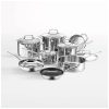 A tampa hermética de aço inoxidável 18/10 veda umidade e nutrientes para resultados mais saudáveis e saborosos durante o cozimento. Com dimensões de embalagem de 34,26 cm x 34,26 cm x 30,45 cm e peso de embalagem de 5,61 quilos, este conjunto é uma escolha robusta e elegante para qualquer cozinha.