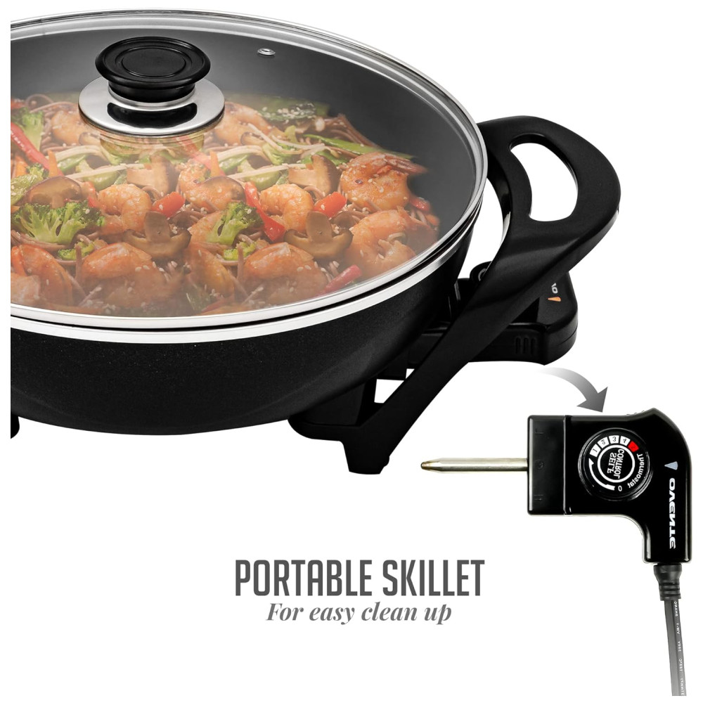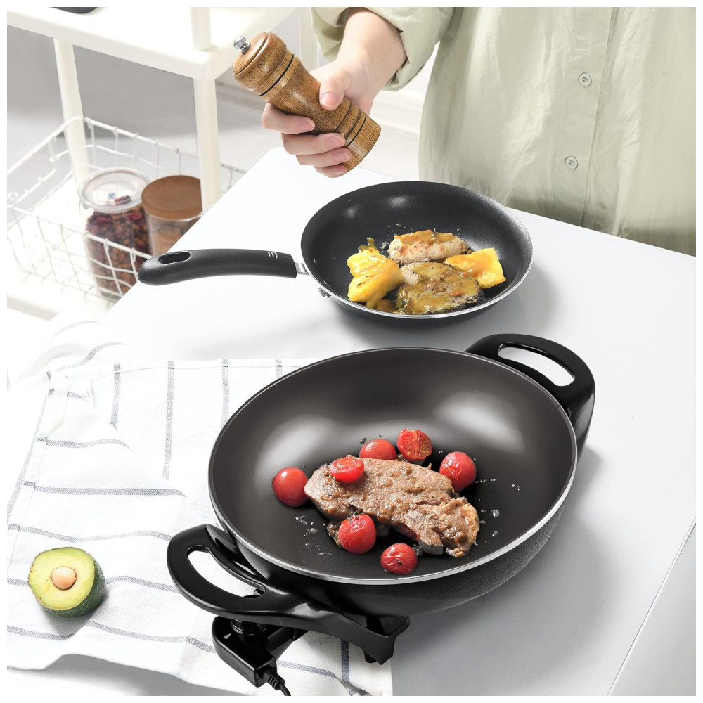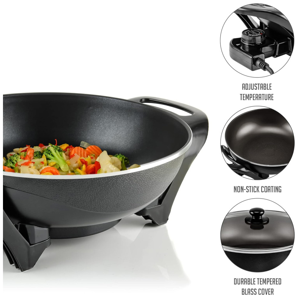 Prepare uma variedade de deliciosas receitas em casa com estilo profissional, sem precisar de um fogão. Com o Wok Elétrico OVENTE SK3113 Series, você pode fazer desde macarrão frito até carne com legumes picantes com facilidade. Esta panela elétrica possui uma base profunda que permite cozinhar qualquer tipo de carne, legume, arroz ou seus pratos favoritos sem bagunça. Feito de alumínio durável com tampa de vidro temperado, distribui o calor de forma uniforme para cozinhar as refeições de maneira rápida e homogênea. A sonda removível mantém a temperatura constante, garantindo refeições perfeitas, enquanto a tampa de vidro transparente facilita a monitoração do cozimento. Este item indispensável é o eletrodoméstico de bancada que todos deveriam possuir. Adicione mais sabor à sua culinária asiática moderna ou tradicional em ocasiões especiais. Possui luz indicadora para saber quando está ligado, pegadores com toque frio e tampa de vidro temperado. Permita que a chapa de aquecimento esfrie antes de limpar, depois é só passar um pano limpo e úmido, enquanto a tampa de vidro pode ser lavada na lava-louças. Ajuste a temperatura desejada facilmente e desfrute de refeições saudáveis e saborosas em instantes!