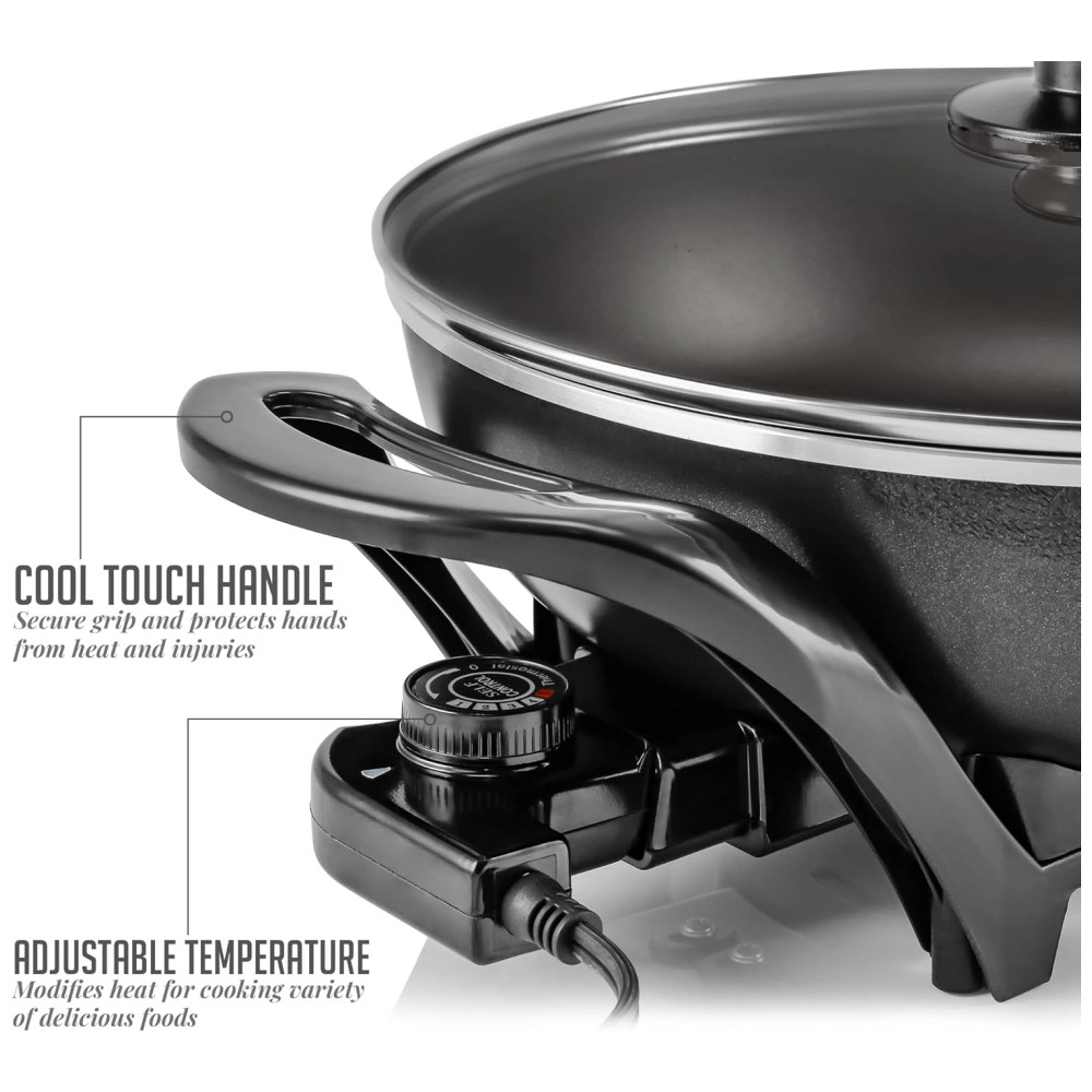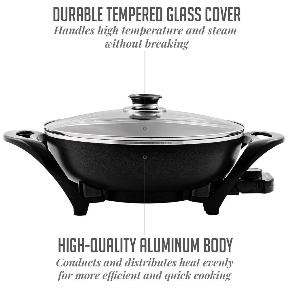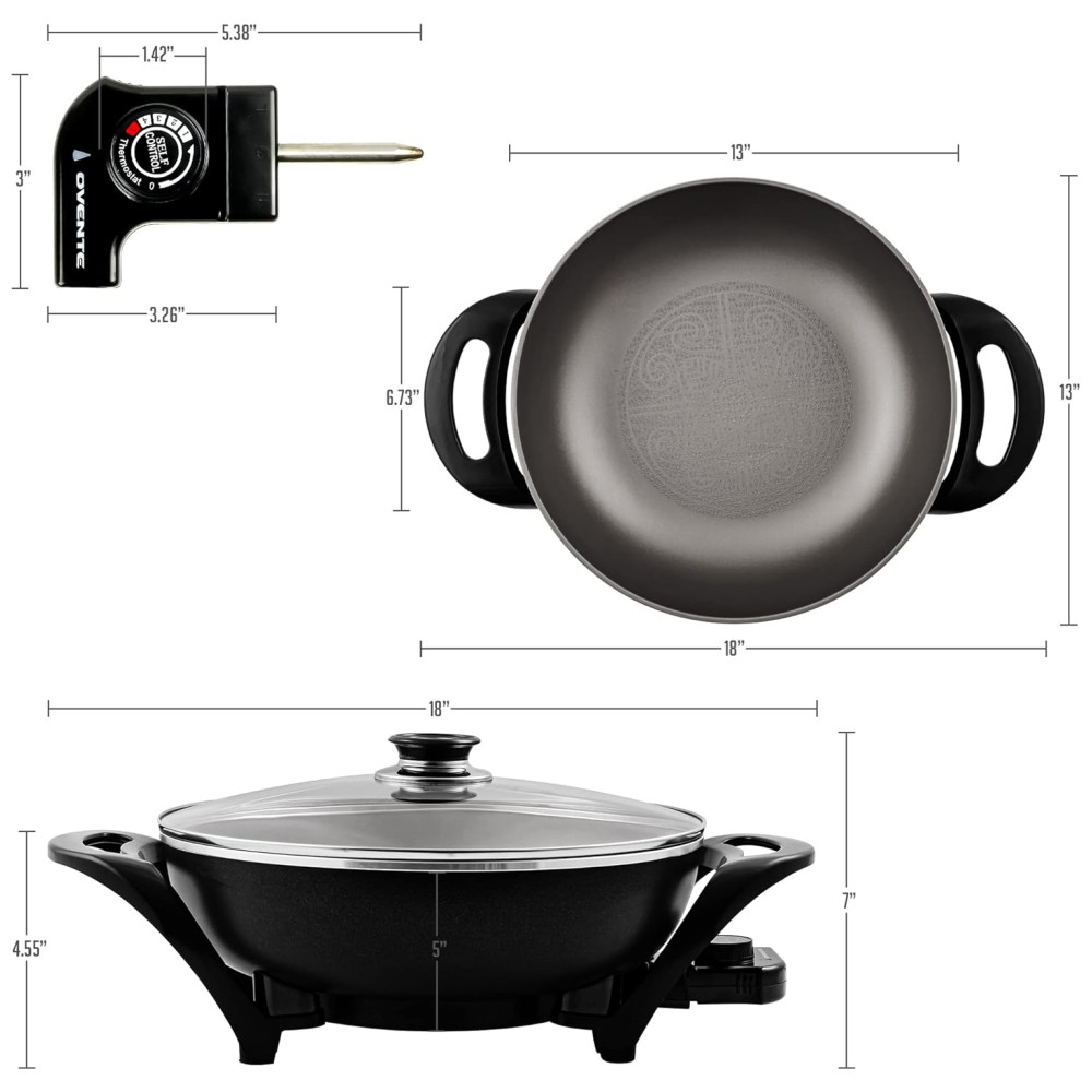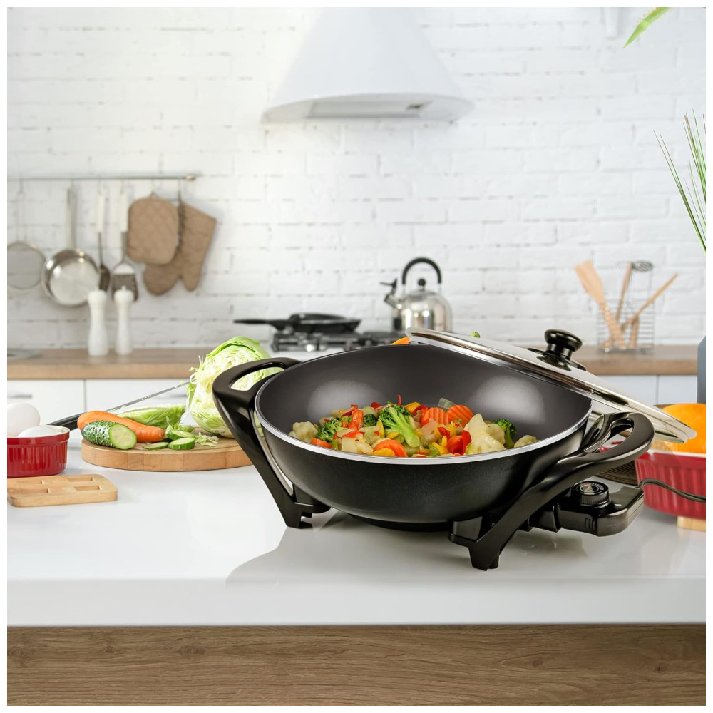 Panela Wok Elétrico OVENTE 33cm com Revestimento Antiaderente Ideal para Família 1400W de Potência Controle de Temperatura Tampa de Vidro Prático