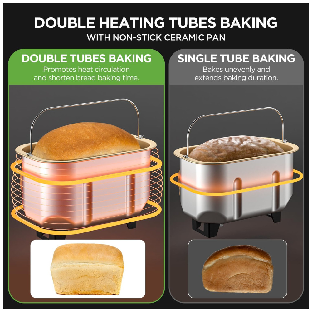 A máquina de alta potência de 850 W funciona com baixo ruído, menos de 40,0 DB, e conta com temporizador de atraso de 15 horas, 1 hora de manutenção automática de calor, funções de memória de interrupção de energia de 10 minutos e 360 tubos de aquecimento duplos que promovem a circulação de calor, permitindo que o usuário desfrute do pão caseiro mais fresco e saudável a qualquer momento. O dispensador automático de frutas e nozes adiciona ingredientes de maneira conveniente no momento certo durante o processo de cozimento, garantindo sabores distribuídos uniformemente por todo o pão.