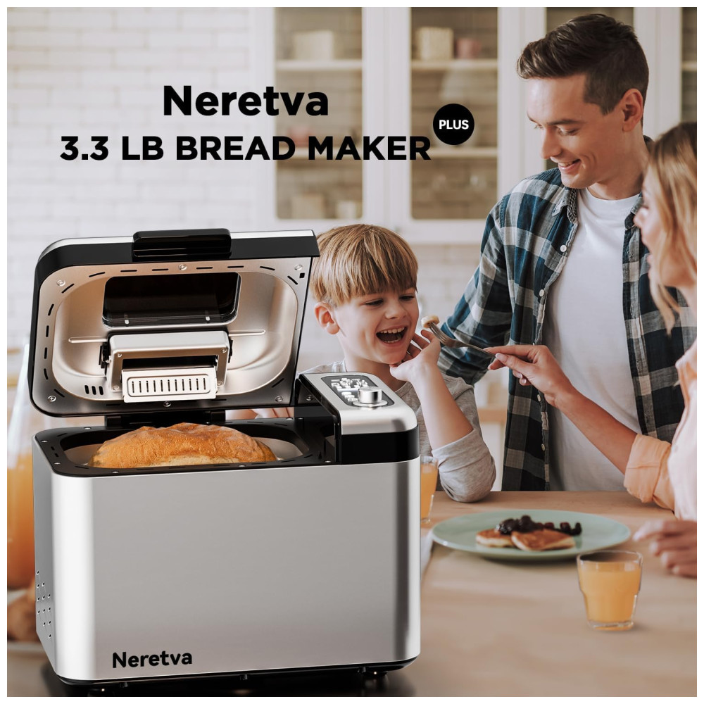 MÁQUINA DE FAZER PÃO Neretva com 15 programas automáticos personalizados, incluindo opções como BÁSICO, RÁPIDO, FRANCÊS, DOCE, INTEGRAL, SEM GLÚTEN, SEM AÇÚCAR, BOLO, MASSA DE PIZZA, GELEIA, IOGURTE, CASEIRO, entre outros. Com capacidades de pão de 1,0 Quilos e 1,37 Quilos, a máquina é capaz de servir 7 e 8 pessoas, respectivamente, e oferece 3 opções de cor de crosta clara, média ou escura.