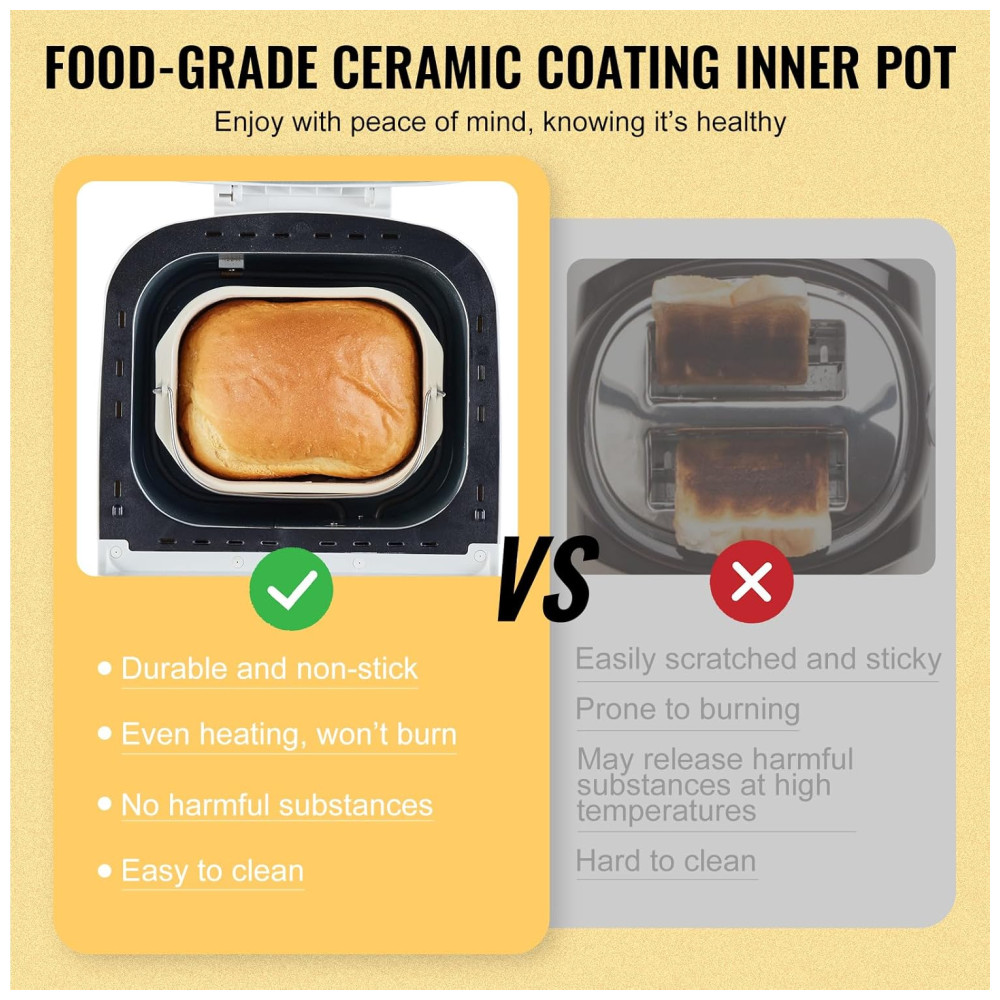 Com operação inteligente onekey, ela pode realizar tudo automaticamente, desde amassar, fermentar e finalizar, transformando iniciantes em master chefs instantaneamente. A máquina de fazer pão oferece três opções de capacidade e três cores de crosta, oferecendo uma variedade de sabores deliciosos. O pote interno de cerâmica FoodGrade é durável, antiaderente e resistente ao calor, garantindo que não queima mesmo após uso prolongado.