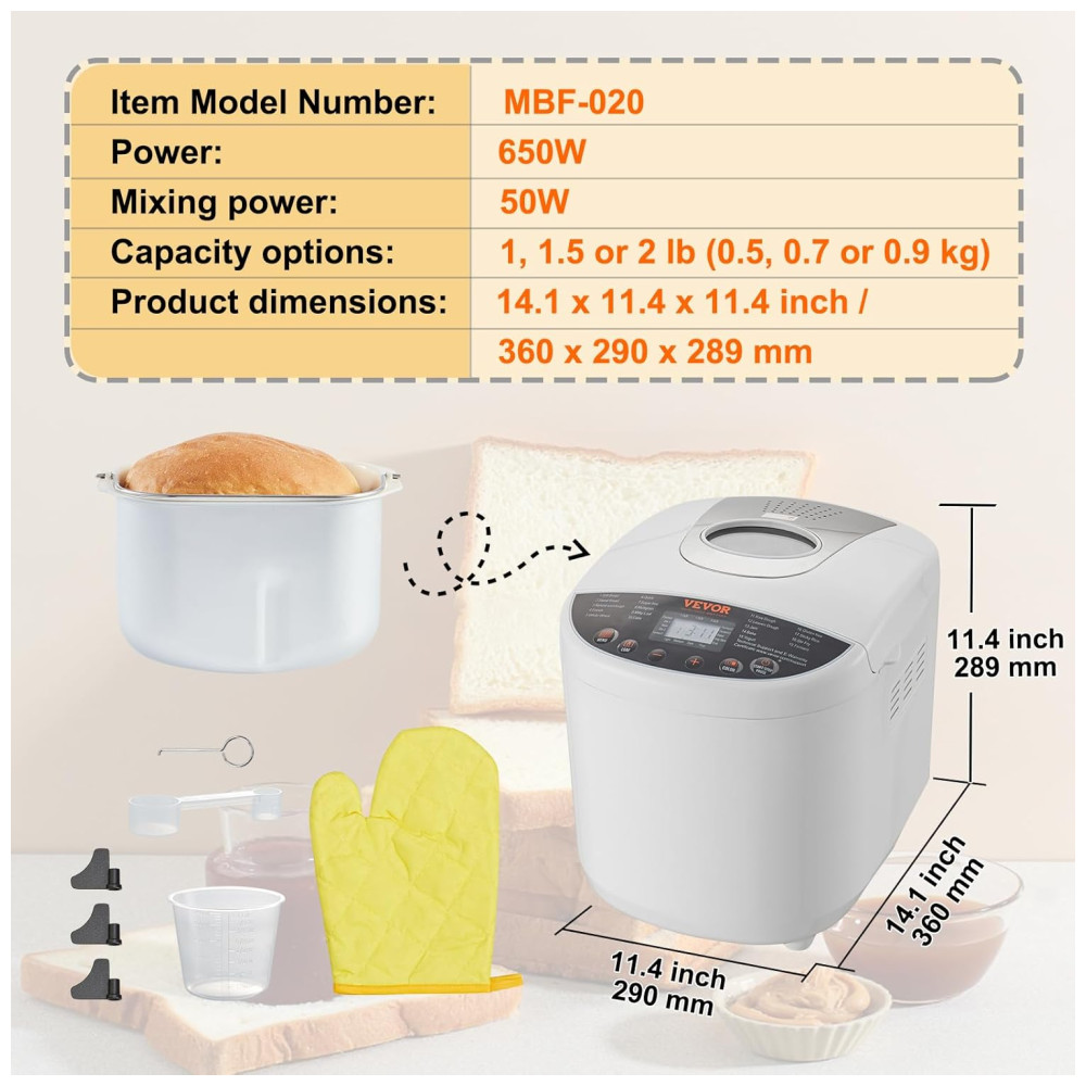 As dimensões do produto são 14,1 x 11,4 x 28,96 cm e 360 x 290 x 289 mm. O conteúdo da embalagem inclui 1 máquina de fazer pão, 2 lâminas de mistura, 1 copo medidor, 1 colher medidora, 1 gancho para remoção de lâmina, 1 luva resistente ao calor e 1 manual do usuário. Possuindo 19 programas de funções, esta máquina de fazer pão é como ter uma ferramenta de cozimento multifuncional. Além de vários tipos de pão, ela também pode fazer massa, geléia, bolo, sanduíches e outros produtos assados.