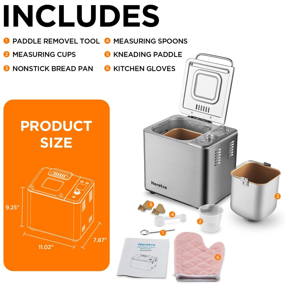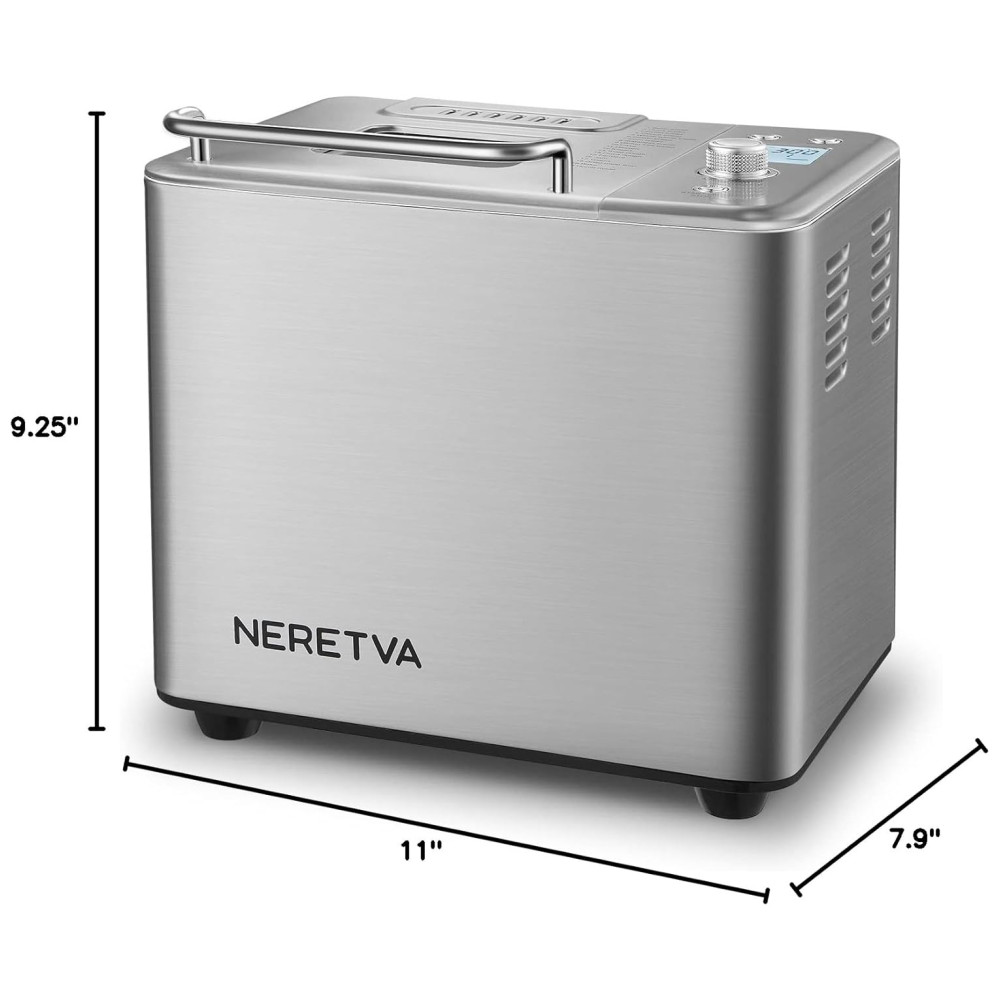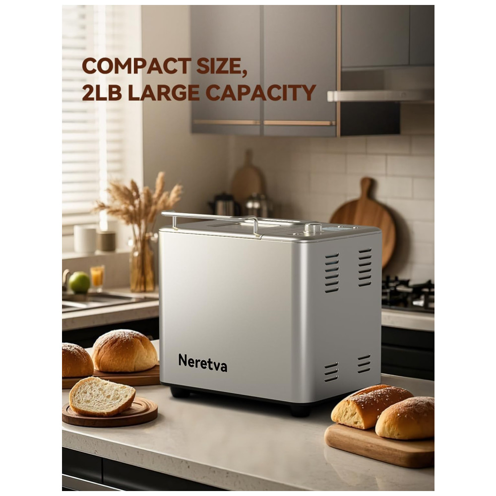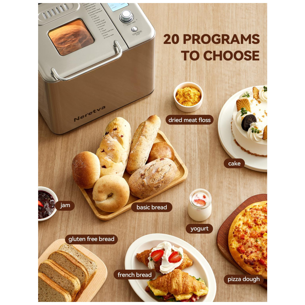 MÁQUINA DE FAZER PÃO Neretva 20 Programas Automáticos Personalizados, incluindo PÃO RÁPIDO, SEM GLÚTEN, FRANCÊS INTEGRAL, MASSA DE PIZZA, JAM, etc. Com 3 tons de crosta claro, médio ou escuro e diferentes capacidades de pão de 680g a 1 kg tamanho da família.