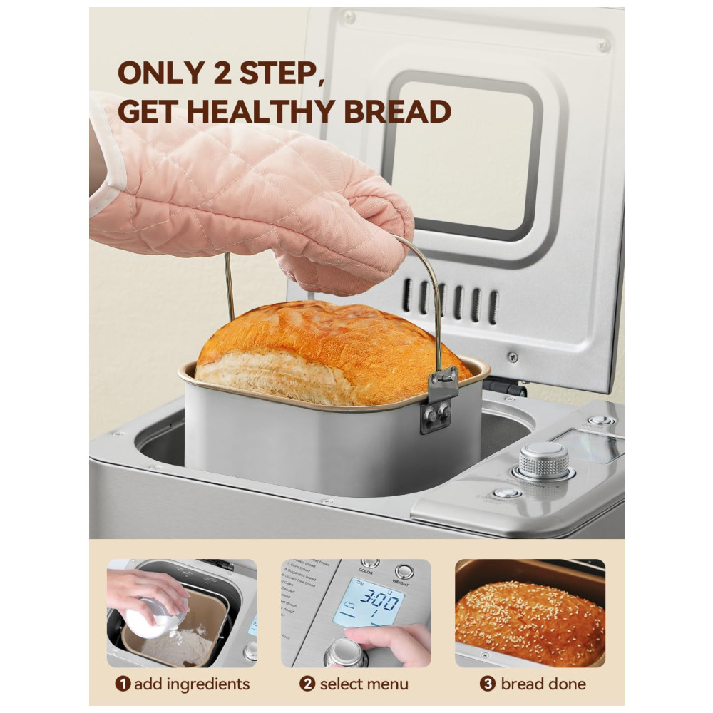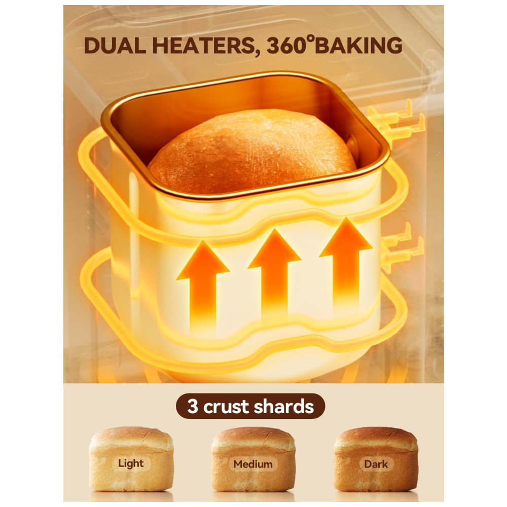 PÃO MAIS SAUDÁVEL E FRESCO Temporizador de atraso de 15 horas, manutenção automática de 1 hora, recuperação de interrupção de energia de 20 minutos, aquecimento de tubos duplos de 360 promove a circulação de calor, permitindo desfrutar do pão caseiro mais fresco e saudável a qualquer momento.