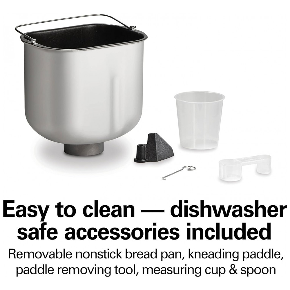 FÁCIL DE LIMPEZA Vem com uma forma de pão removível, remo amassado, ferramenta de remoção de remo, copo medidor e colher para uma limpeza rápida e fácil após o cozimento.