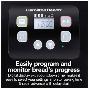 PROGRAMA FÁCIL E PROGRESSO DE MONITOR. O visor digital com temporizador de contagem regressiva facilita a seleção das configurações de ciclo, pão e crosta e o monitoramento do tempo de cozimento. Atrasar o início permite definir a máquina de pão com antecedência, para que o pão esteja pronto quando você estiver