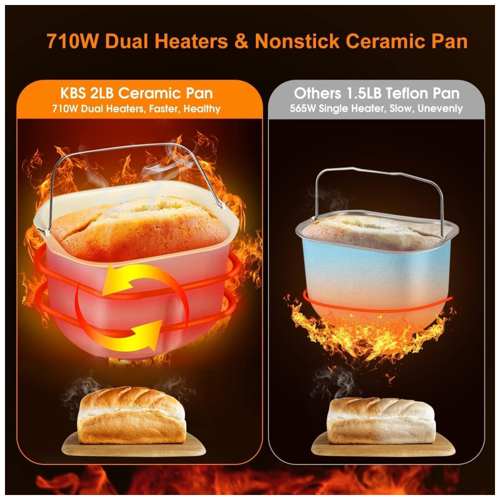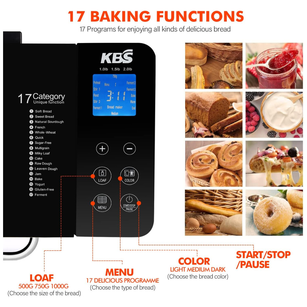 KBS MBF 010 Máquina de fazer pão automática atualizada, máquina de fazer pão profissional com vasta experiência na cozinha. Um revolucionário elemento de aquecimento embutido em nossa máquina de fazer pão KBS muda a maneira como você pode assar em casa. Com uma crosta perfeitamente dourada, qualquer pessoa pode ser um mestre padeiro. Função principal 17 menus incluindo pão macio, pão doce, fermento natural, pão francês, trigo integral, pão rápido, sem açúcar, multigrãos, pão com leite, bolo, massa crua, massa de fermento, compotas, bolos, iogurte, sem glúten, fermento, Vinho de arroz, refogado 3 cores da crosta claro, médio, escuro 3 tamanhos de pão 0,450, 0,680, 0,9kg para assar um pão tradicional grande de até 1kg. . 15 horas programáveis de Delay Bake, 1 hora Keep Warm e 15 minutos Power Interruption Recovery permitem que você volte para casa ou acorde com o sabor de um pão recém assado. Vantagens do produto. Panela de cerâmica antiaderente mais saudável e segura para máquina de lavar louça, Doseador automático removível dispensar frutas, nozes na hora certa Tampa e painel s em grama temperada, mais estilosa e generosa Toda a carcaça em aço inoxidável escovado e sem tratamento de impressões digitais Botão de toque, use mais facilmente Motor AC 710W, mais estável, mais forte e funciona mais Com a luz interna, você pode ver todo o processo facilmente . Aprovado pela FDA, marca listada ETL. Etapas da operação de fabricação de pão basta adicionar os ingredientes que você adora, selecionar o ciclo e apertar start e a máquina de fazer pão cuidará do cozimento. Pacote Máquina de pão 1 Panela de cerâmica antiaderente 1 Distribuidor de nozes de frutas 1 Manual do usuário com livreto de receitas 1 gancho de metal 1 lâmina de amassar 1 copo medidor 1 colher medidora