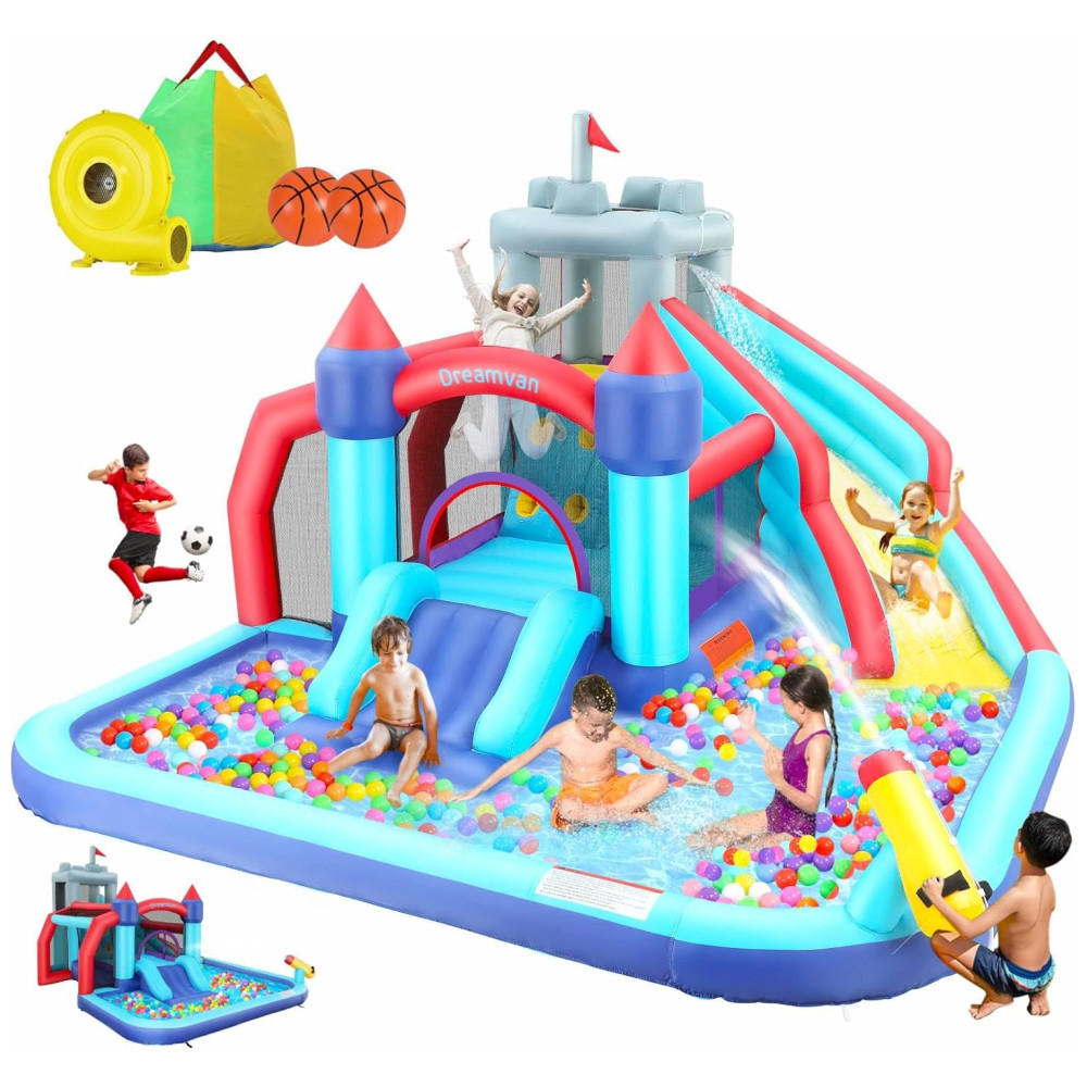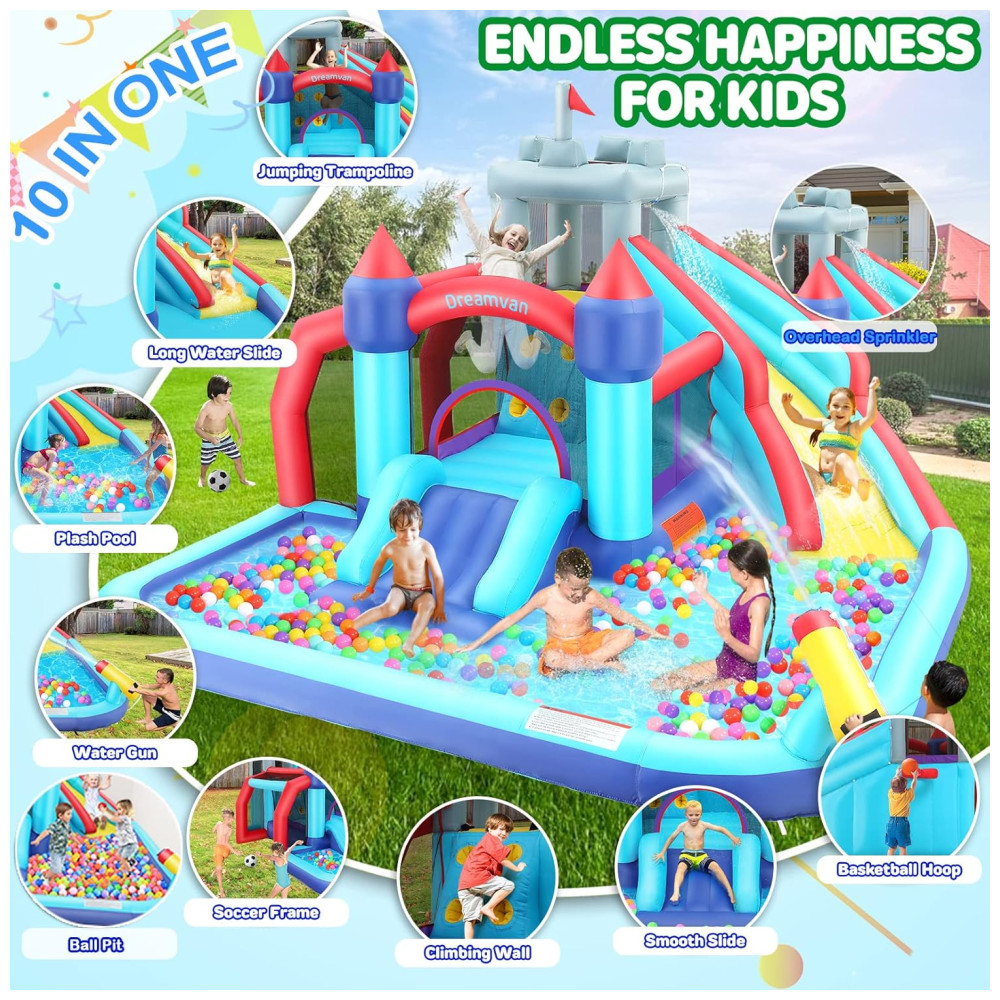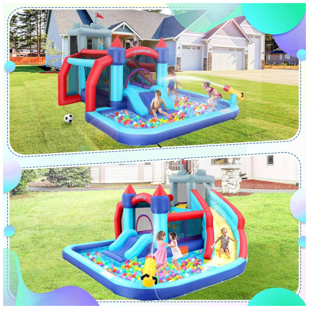 Este toboágua inflável é o que faltava para as crianças se divertirem Com 2 escorregadores, parede de escalada, cesta de basquete, piscina infantil, canhão, área de salto e portão de bola, as possibilidades de entretenimento são infinitas. O castelo inflável é feito de 840D Tecido Oxford 420D Oxford, resistente ao desgaste e ao rasgo, reforçado por costuras duplas e kits de remendos para durar mais tempo.