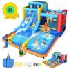 Parque Aquático Inflável 10 em 1 com Escorregador Duplo Piscina Parede de Escalada Tobogã Arma d’Água e Cesta de Basquete para Diversão Interna