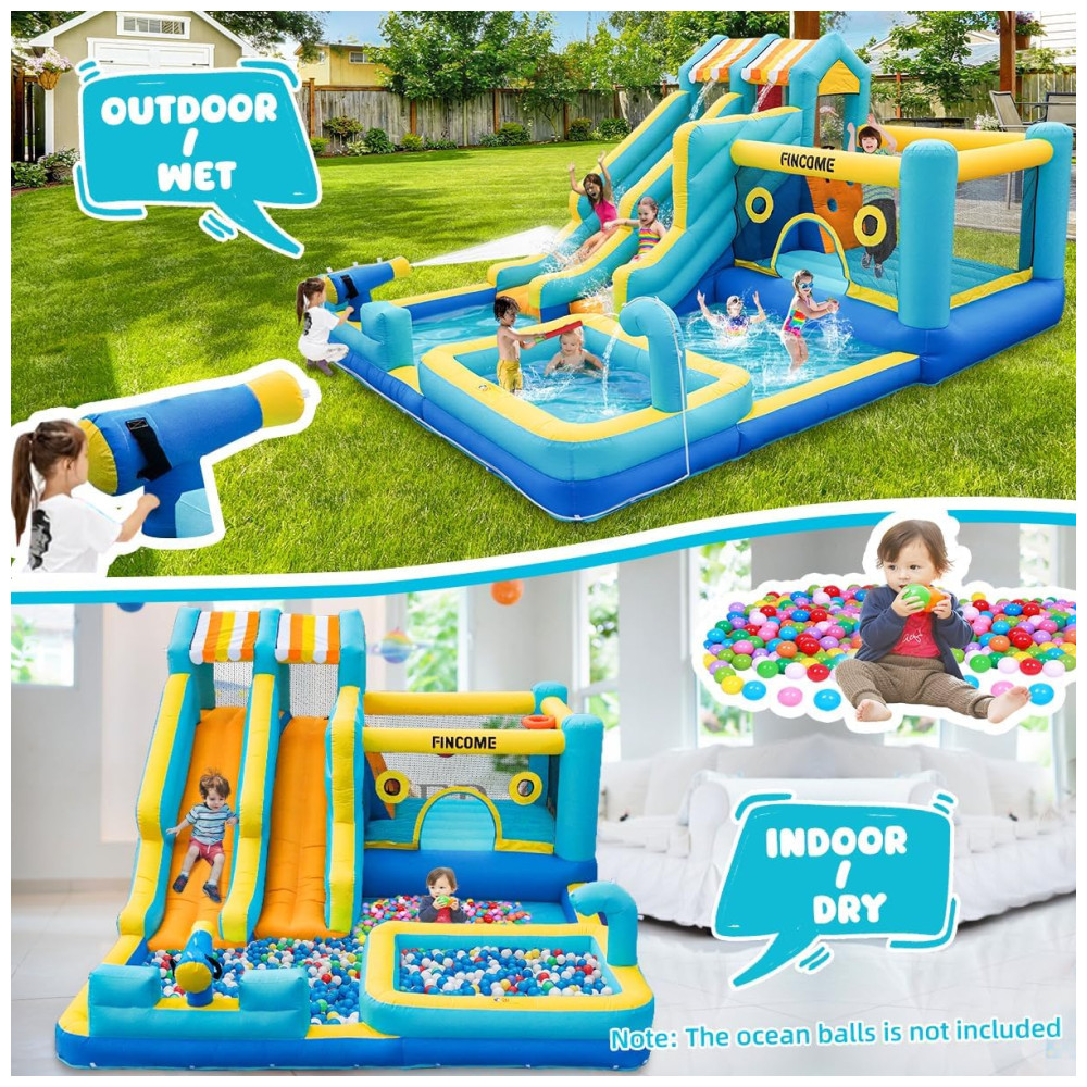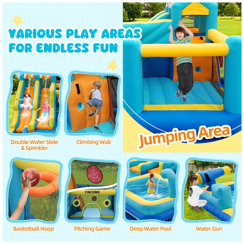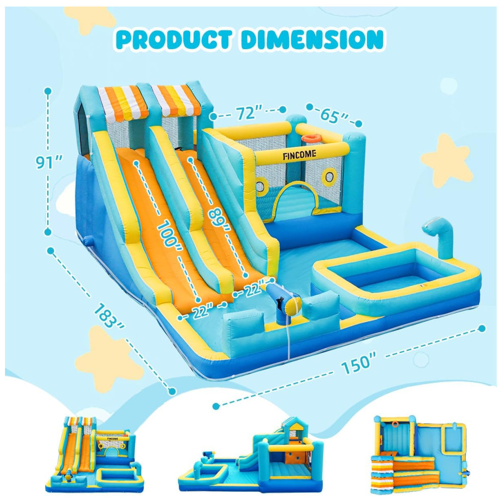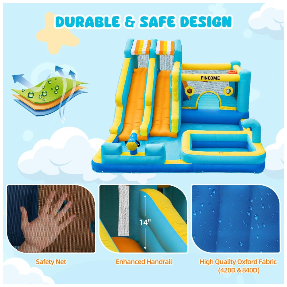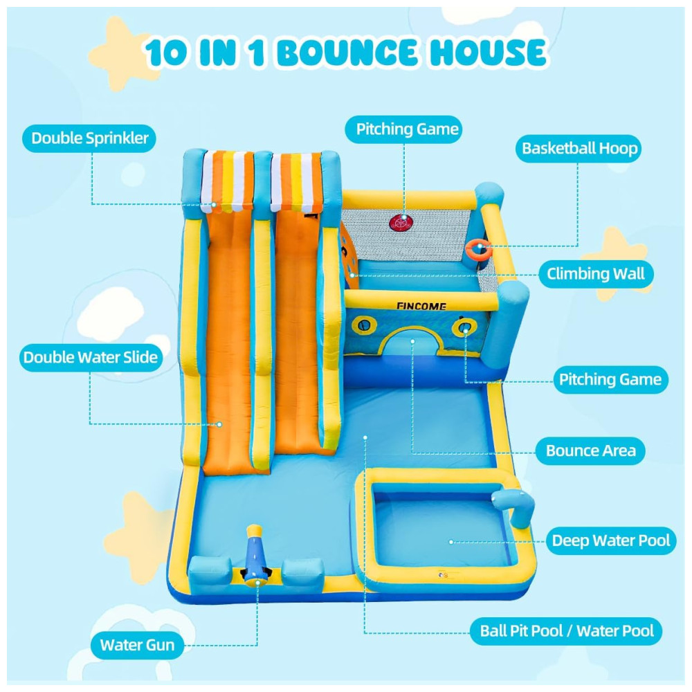 O Inflatable Bounce House 10 in 1 Double Water Slide da FINCOME é feito de tecido Oxford resistente, combinando 840D e 420D Oxford fabric, que são materiais duráveis, resistentes ao desgaste e adequados para uso em brinquedos infláveis. O produto apresenta costuras reforçadas para garantir maior durabilidade e segurança durante o uso.