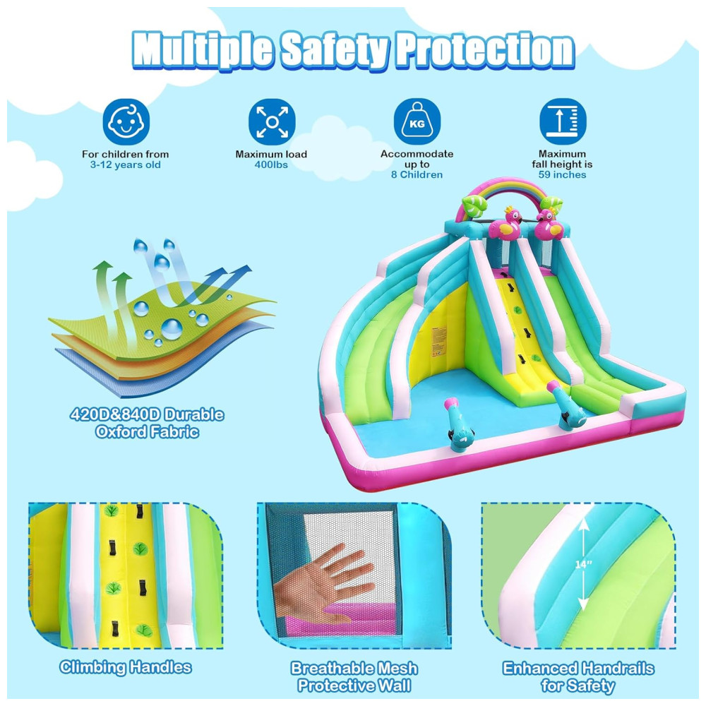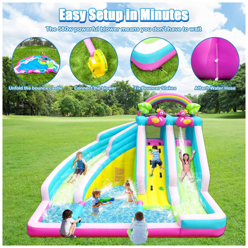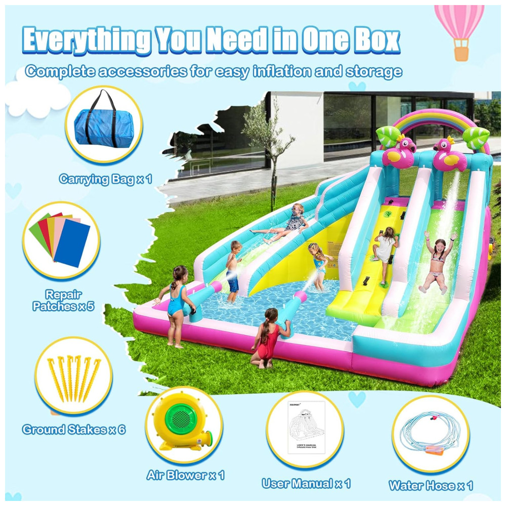 Parque Aquático Inflável 6 em 1 com Tema Flamingo Tobogã Duplo Piscina de Splash – Diversão Garantida no Quintal!Hemopow