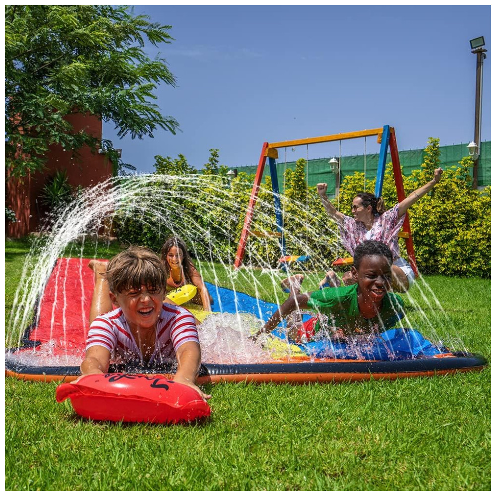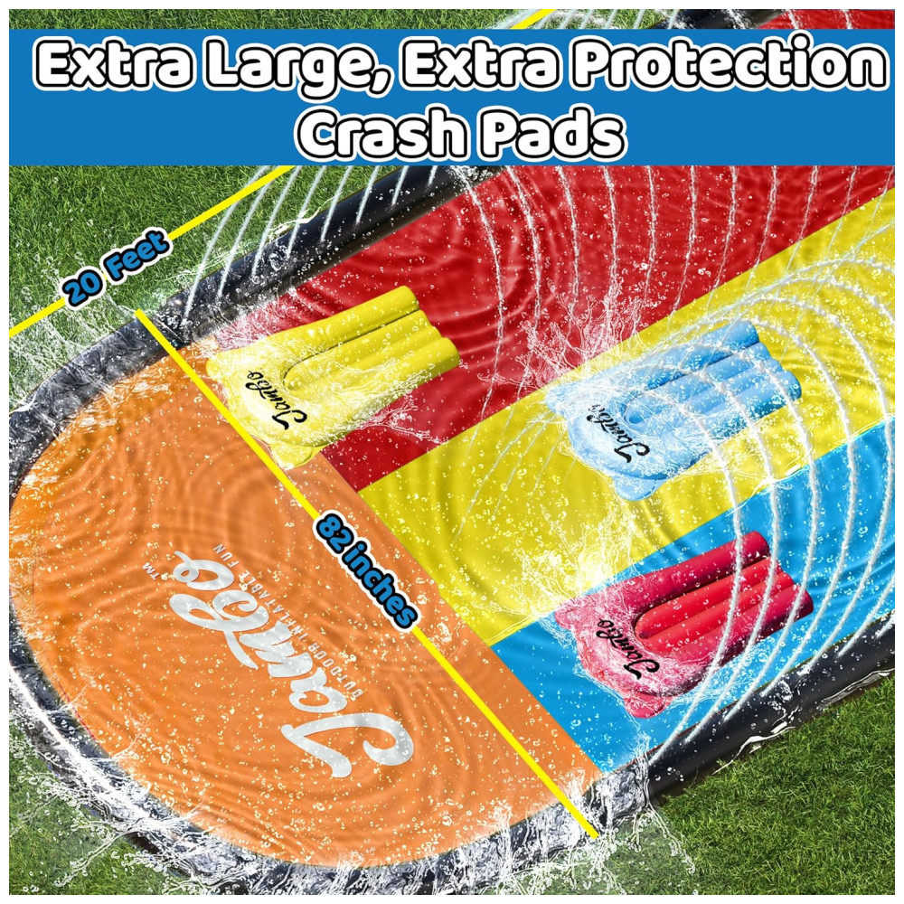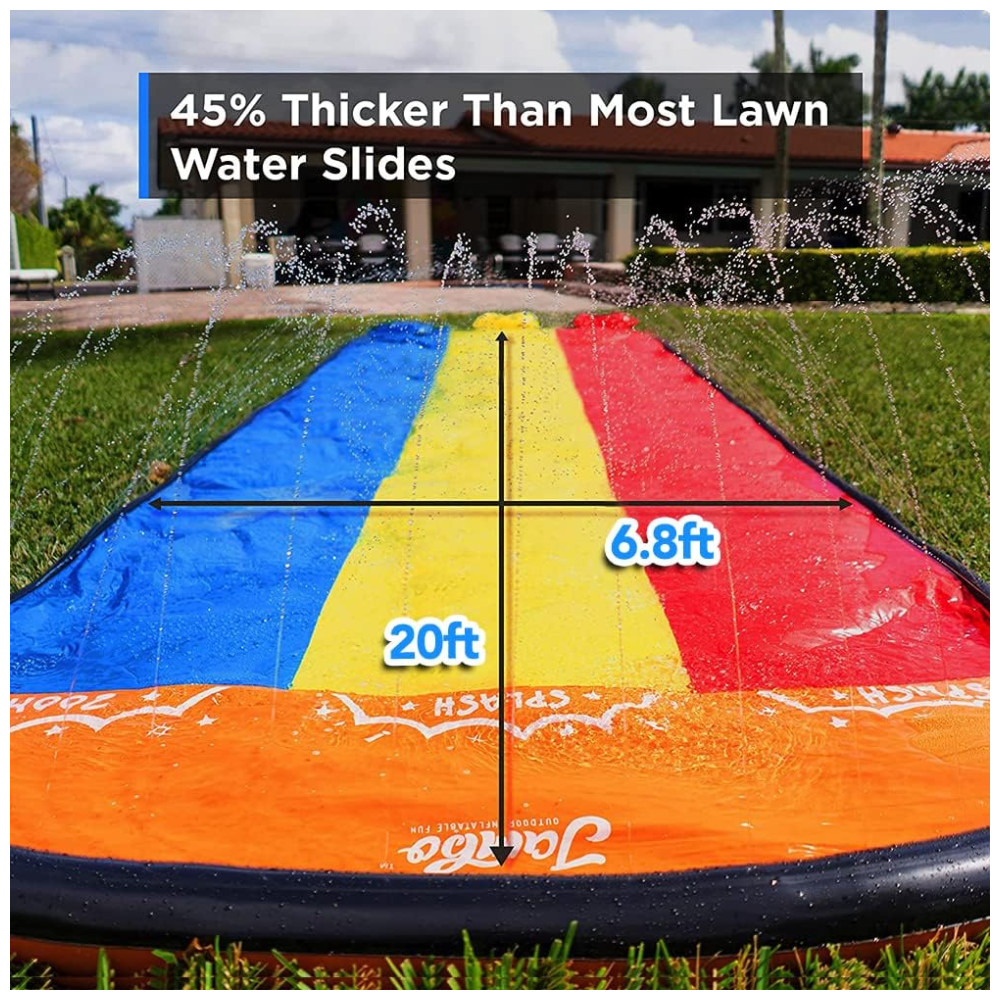 O toboágua é composto por três pistas, oferecendo às crianças uma experiência de deslizamento muito mais divertida, onde elas têm a chance de mergulhar e deslizar ao mesmo tempo. Três crianças podem deslizar ao mesmo tempo, participando de corridas para ver quem é mais rápido, brincar ou mostrar novos truques que aprenderam no bodyboard. O JAMBO Slip Splash and Slide é feito de PVC espesso e de qualidade industrial, o que o torna muito mais resistente do que a maioria dos escorregadores de água para gramado disponíveis no mercado.
