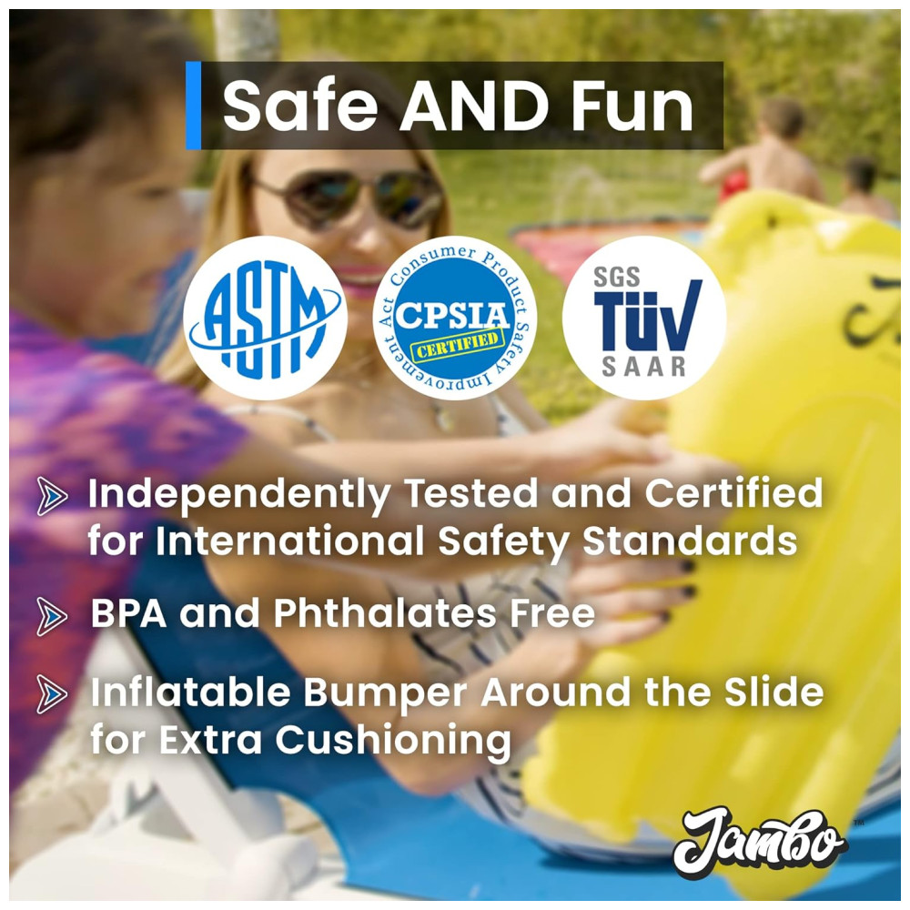 A segurança é uma prioridade no design do JAMBO Slip Splash and Slide. Certificado ASTM e CPSIA, o tobogã é livre de BPA e ftalatos, além de possuir uma almofada de proteção no final do escorregador para desacelerar as crianças e garantir a segurança.