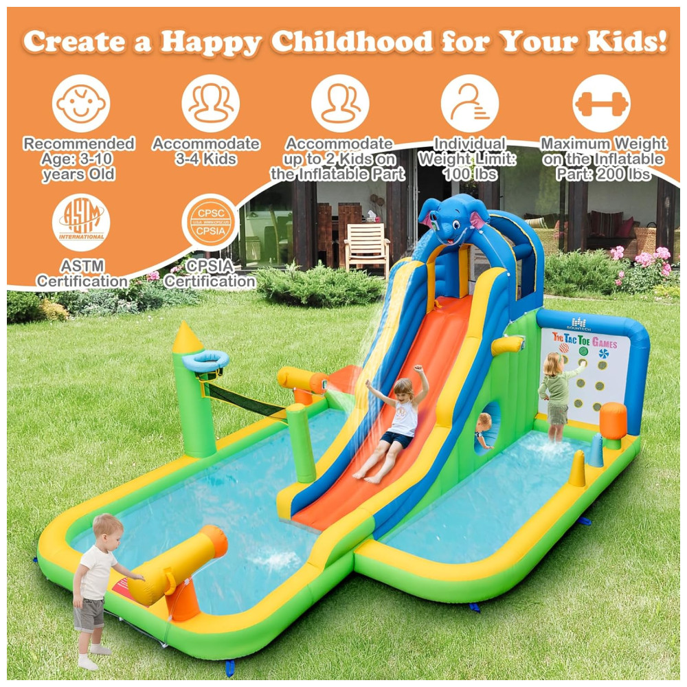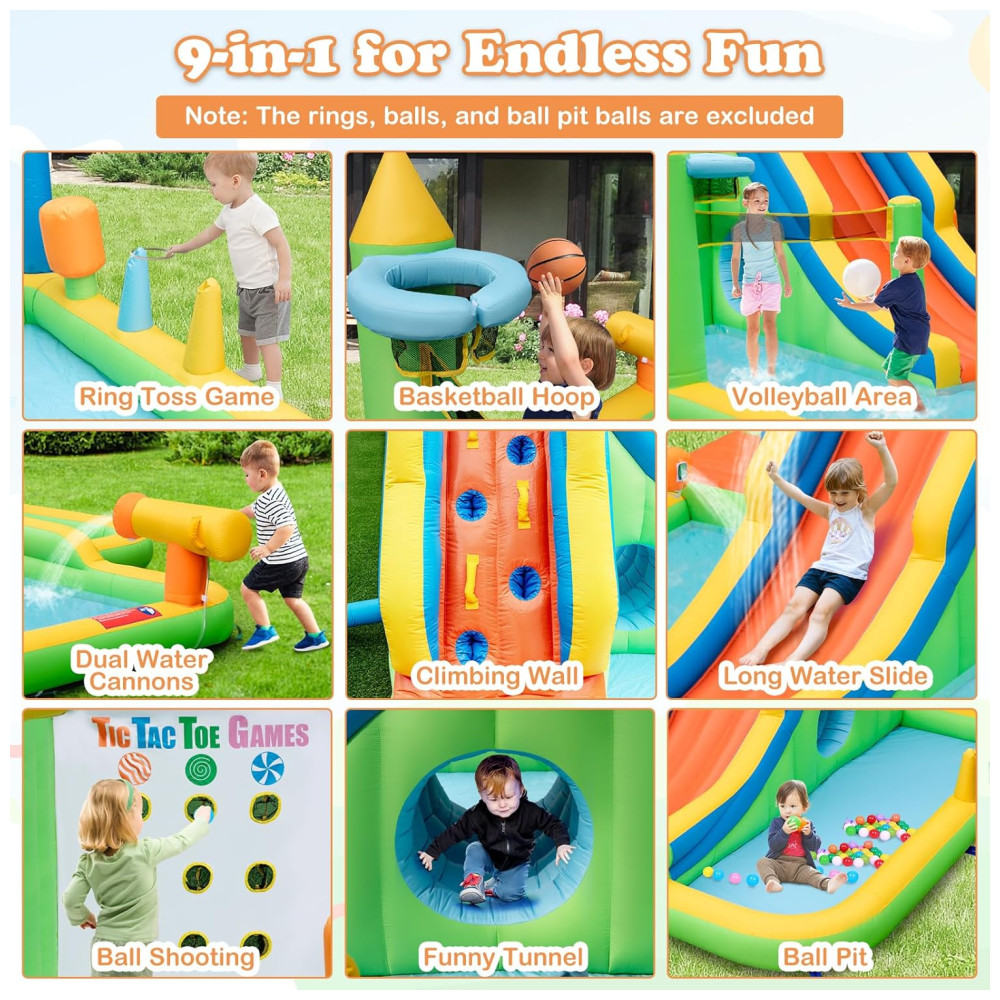 Parque Aquático Inflável 9 em 1 até 90 kg com Piscina Infantil Jogo da Velha Parede de Escalada e Toboáguas BOUNTECH Colorido