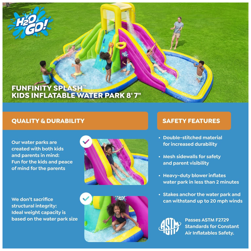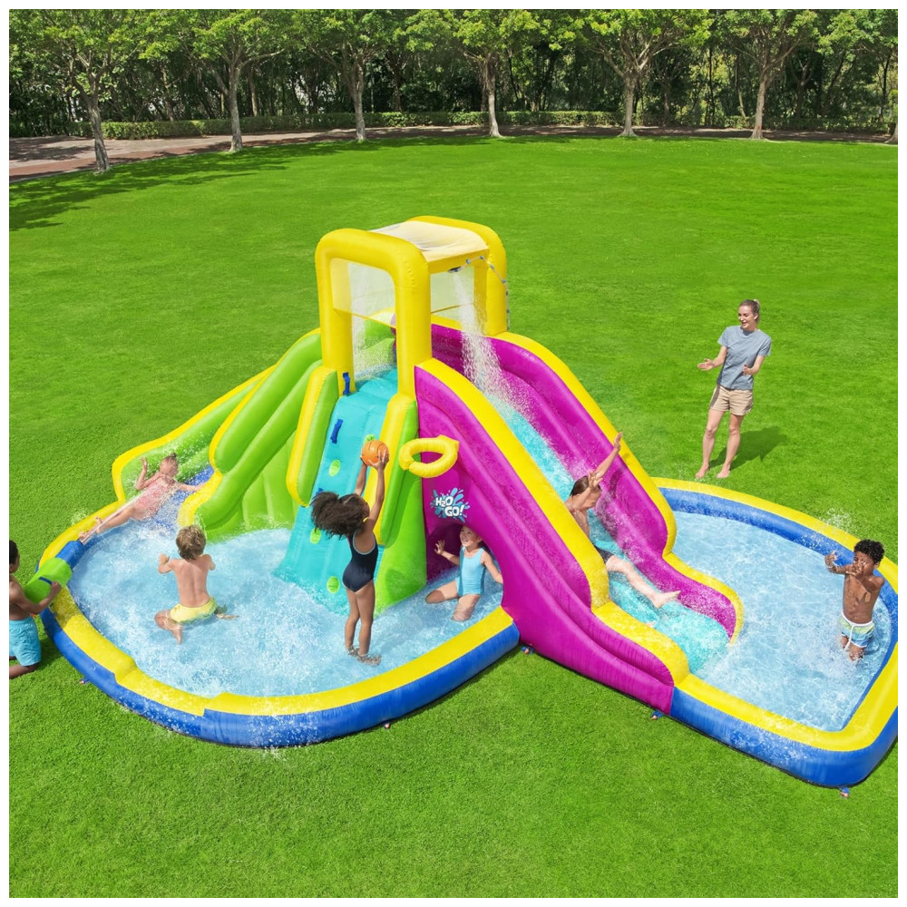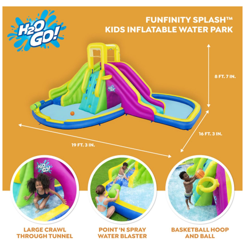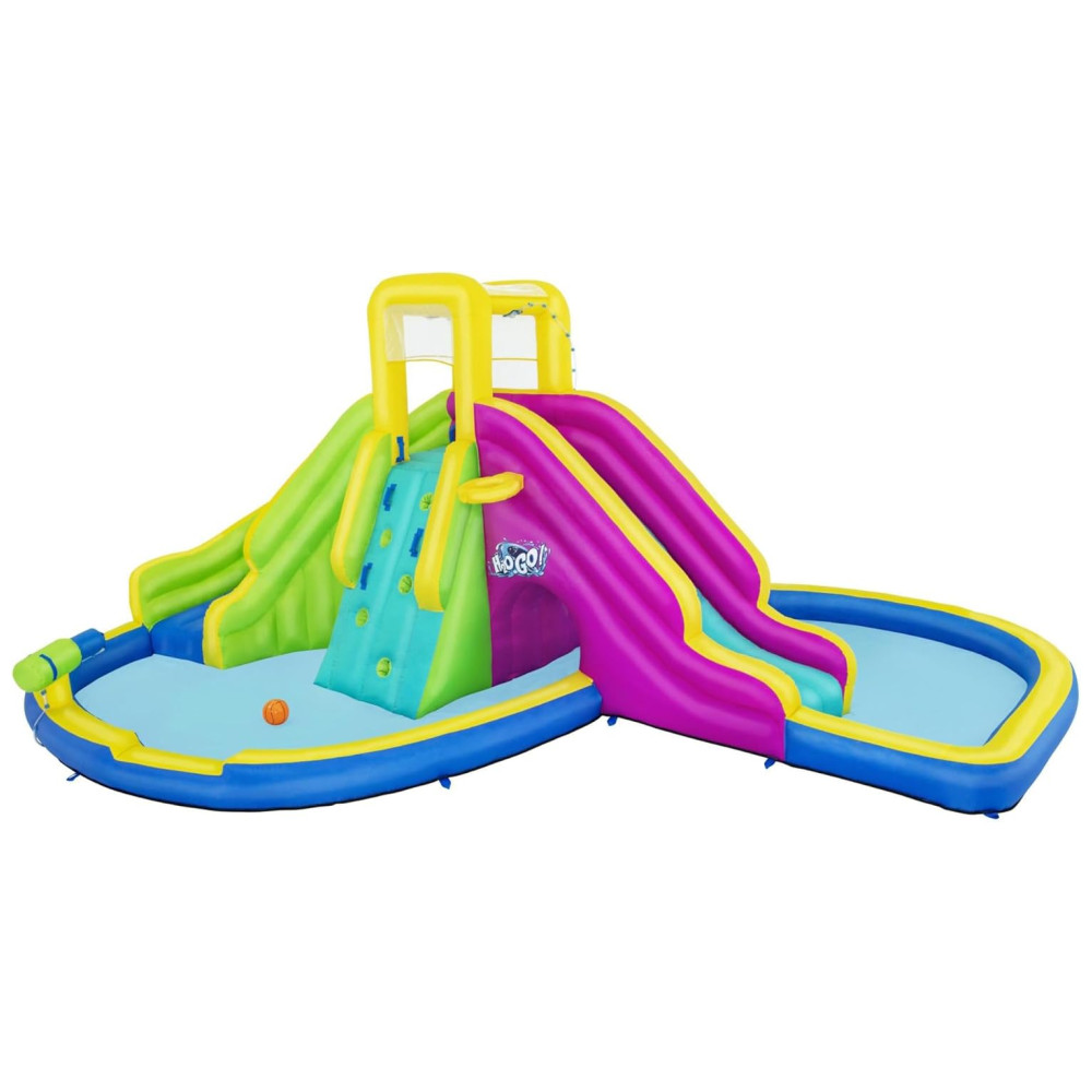 Cada slide leva a uma piscina diferente de 2.001,12 litros que está ligada entre si por um grande túnel de rastreamento. O parque também inclui uma bola de basquete e uma cesta para garantir horas de entretenimento. Construído em poliéster revestido de PVC durável com costuras de ponto duplo e uma abertura estruturada que evita o enchimento excessivo, o parque conta com uma válvula de drenagem que permite a drenagem rápida da água.