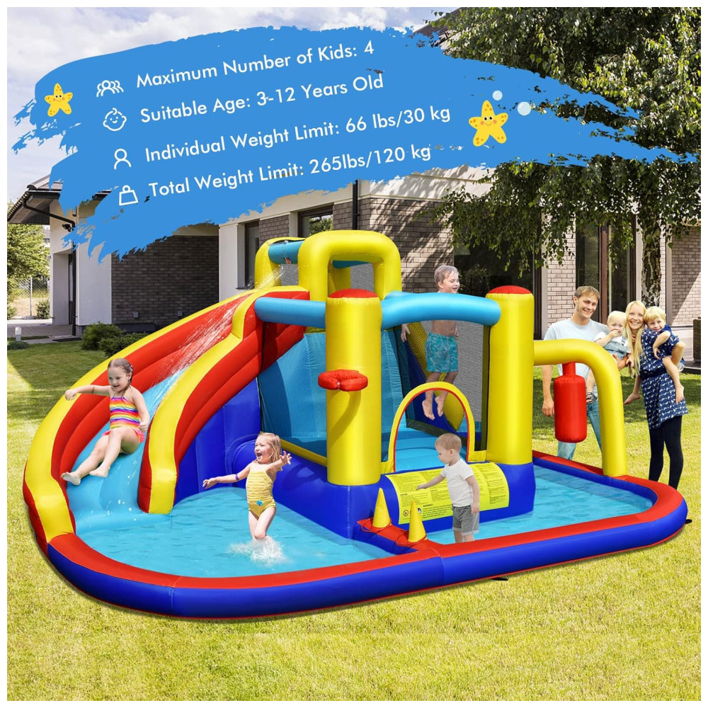 Este toboágua inflável é adequado para uso em quintal, parque, gramado, etc., e não é limitado pelo clima ou localização, permitindo que as crianças se divirtam com vários jogos em um só lugar. A área inflável é adequada para 4 crianças brincarem juntas, com um peso máximo de 120,18 quilos.