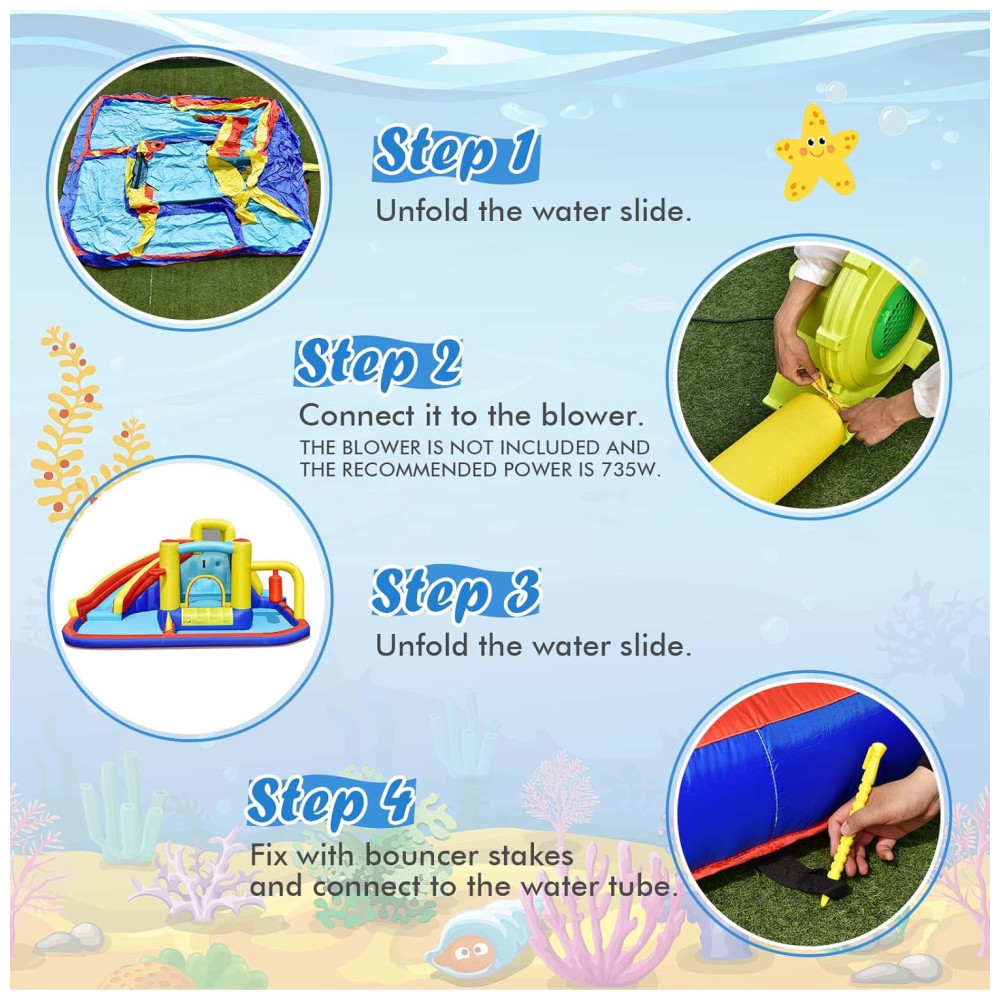A configuração do castelo inflável com escorregador leva 23 minutos, mas traz horas de diversão para as crianças depois. Recomenda se o uso de um soprador de 735W, que não está incluído. Bolhas de ar são normais, pois os toboáguas são costurados com linha, o que cria escapes muito pequenos de ar e faz com que bolhas apareçam naturalmente quando o ar é bombeado.