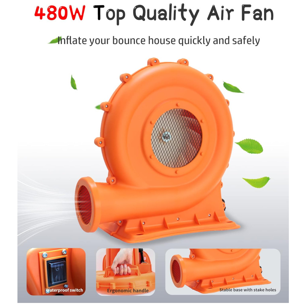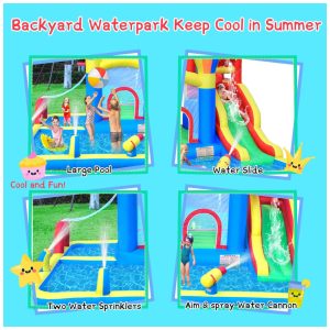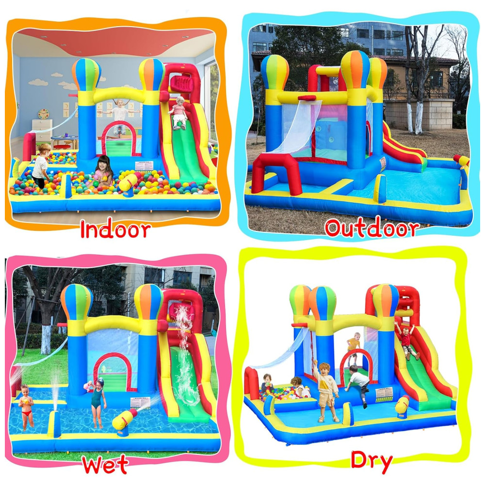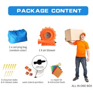 Além disso, é seguro para as crianças, em conformidade com ASTM F96317. Acompanha um soprador, remendo de reparo, instruções, estacas de gramado e uma bolsa de transporte. A inflação leva menos de 2 minutos e a remoção é fácil. É adequada para festas internas e externas, com vários espaços de lazer interligados.