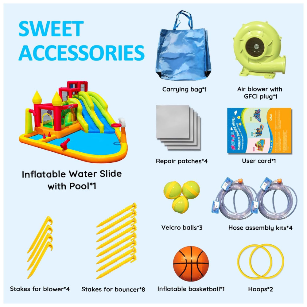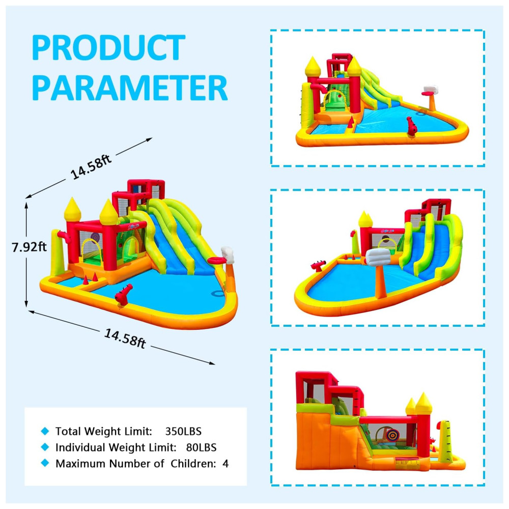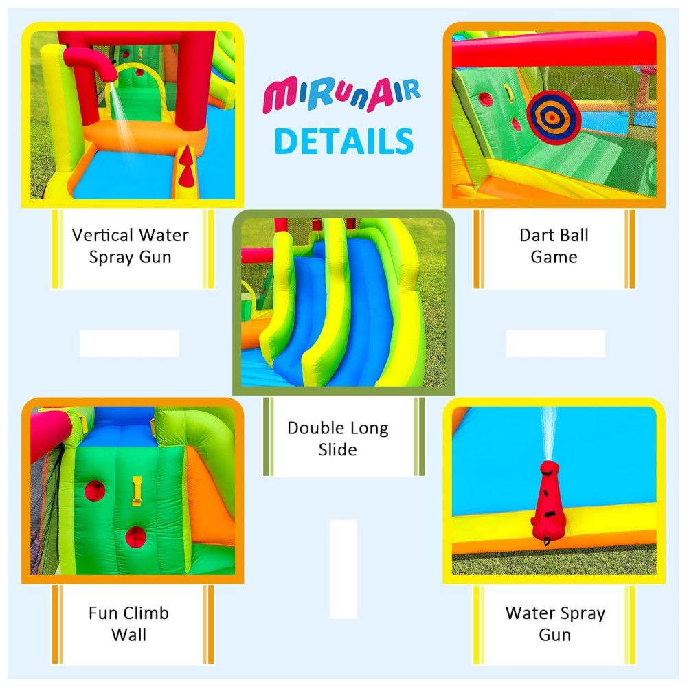 Castelo inflável MIRUNAIR multicolorido com escorregadores duplos piscina de respingos canhão d’água e soprador elétrico integrado