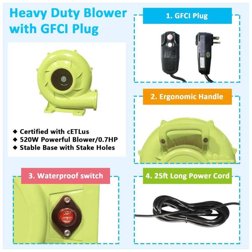 O conjunto acompanha soprador elétrico dedicado, estacas de fixação para ancoragem ao solo e bolsa para transporte e armazenamento, permitindo inflar e esvaziar o brinquedo em poucos minutos. O peso total suportado é de até 160kg, indicado para uso simultâneo de 2 a 4 crianças, devendo ser sempre utilizado com supervisão de adulto e em superfície plana.