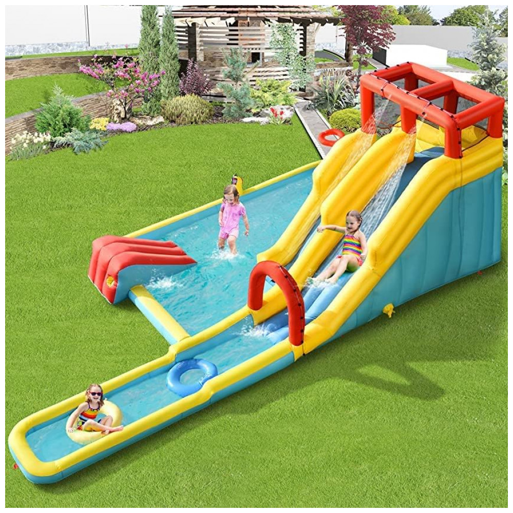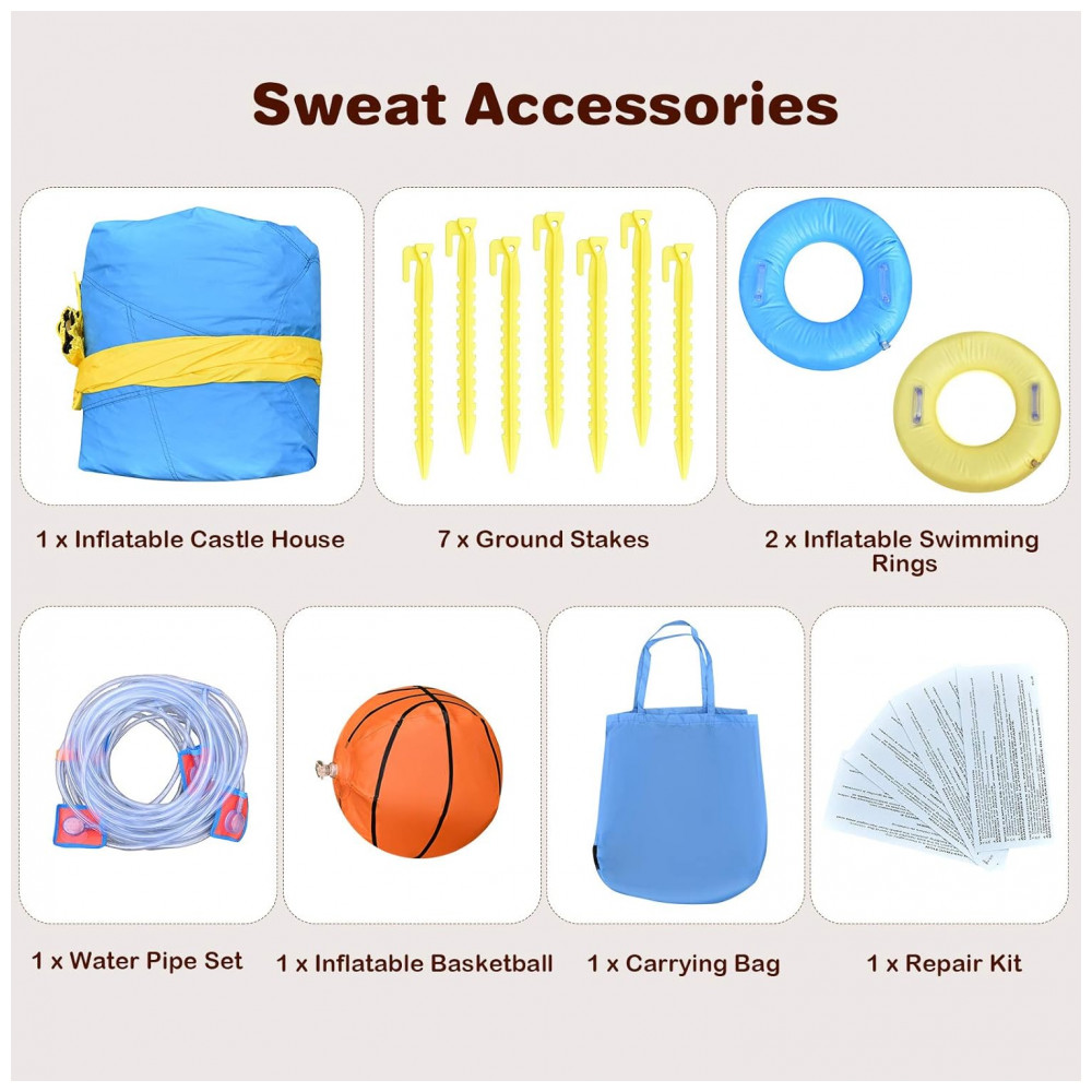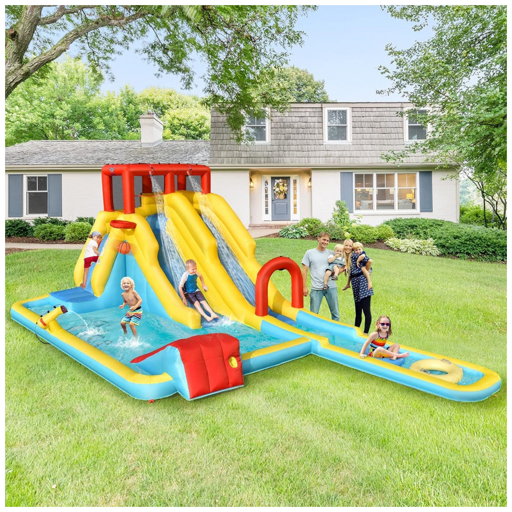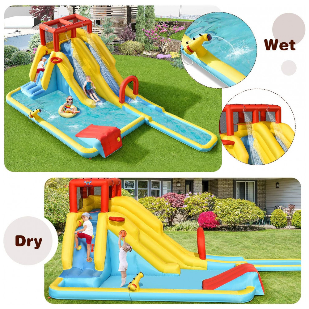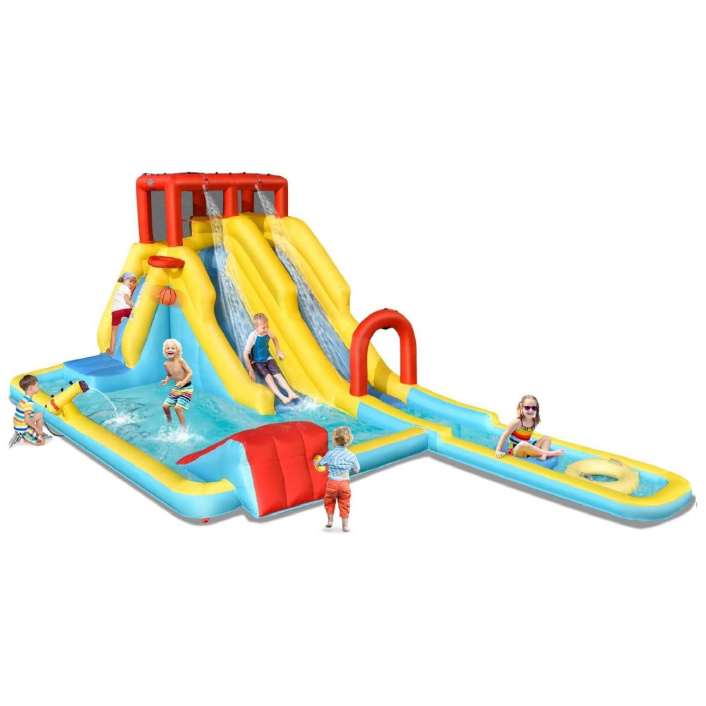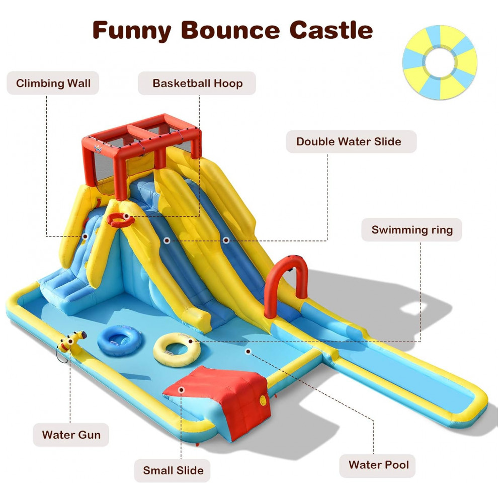 O toboágua inflável gigante 7 em 1 é o presente ideal para estimular o potencial das crianças. Com áreas de entretenimento compostas por toboágua pequeno, tobogã duplo com jogo de surf, piscina, cesta de basquete, pistola d água e parede de escalada, seus filhos terão diversão sem fim com seus amigos enquanto correm, escalam, saltam e deslizam.