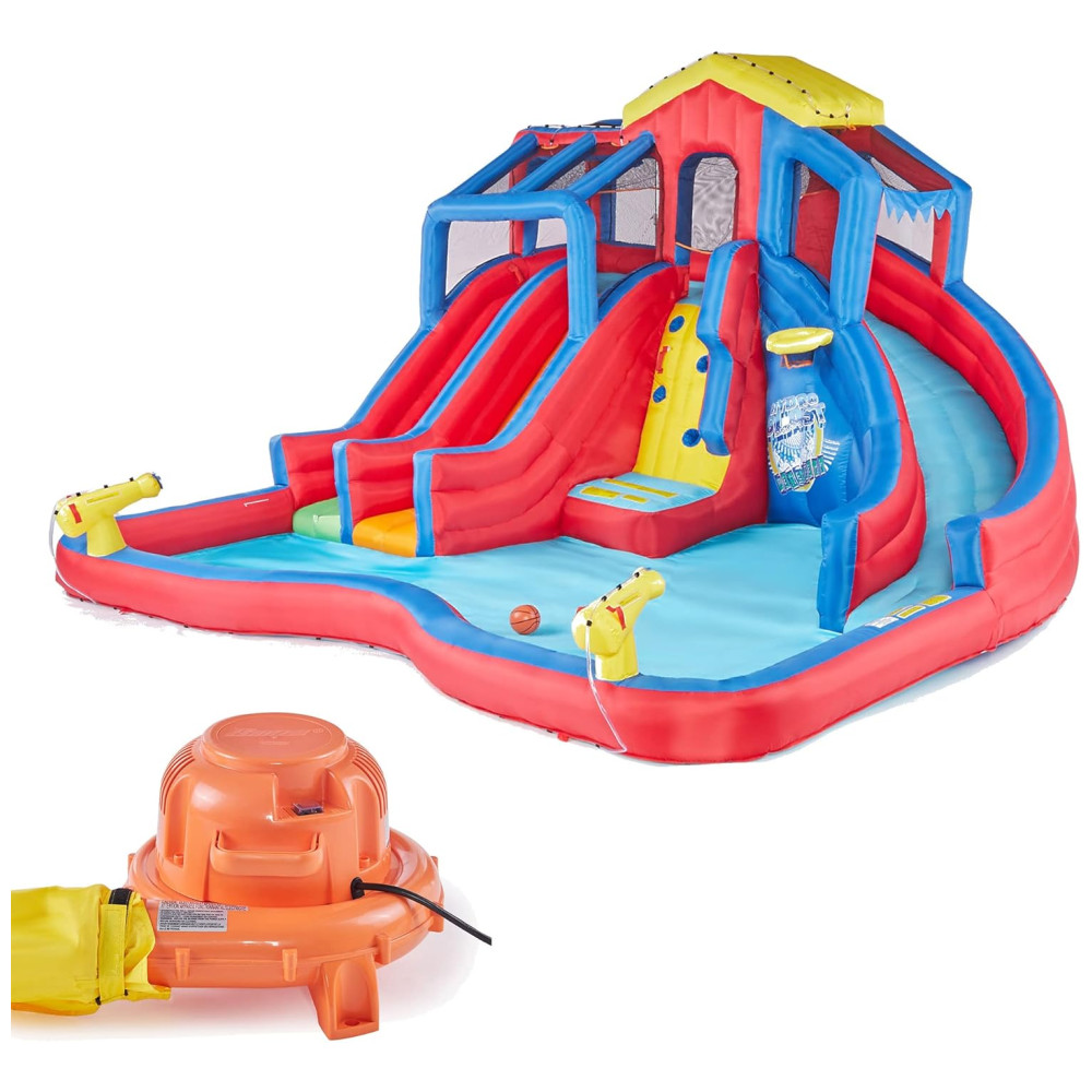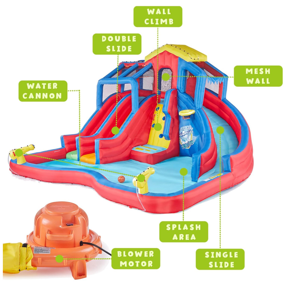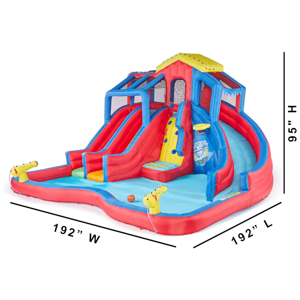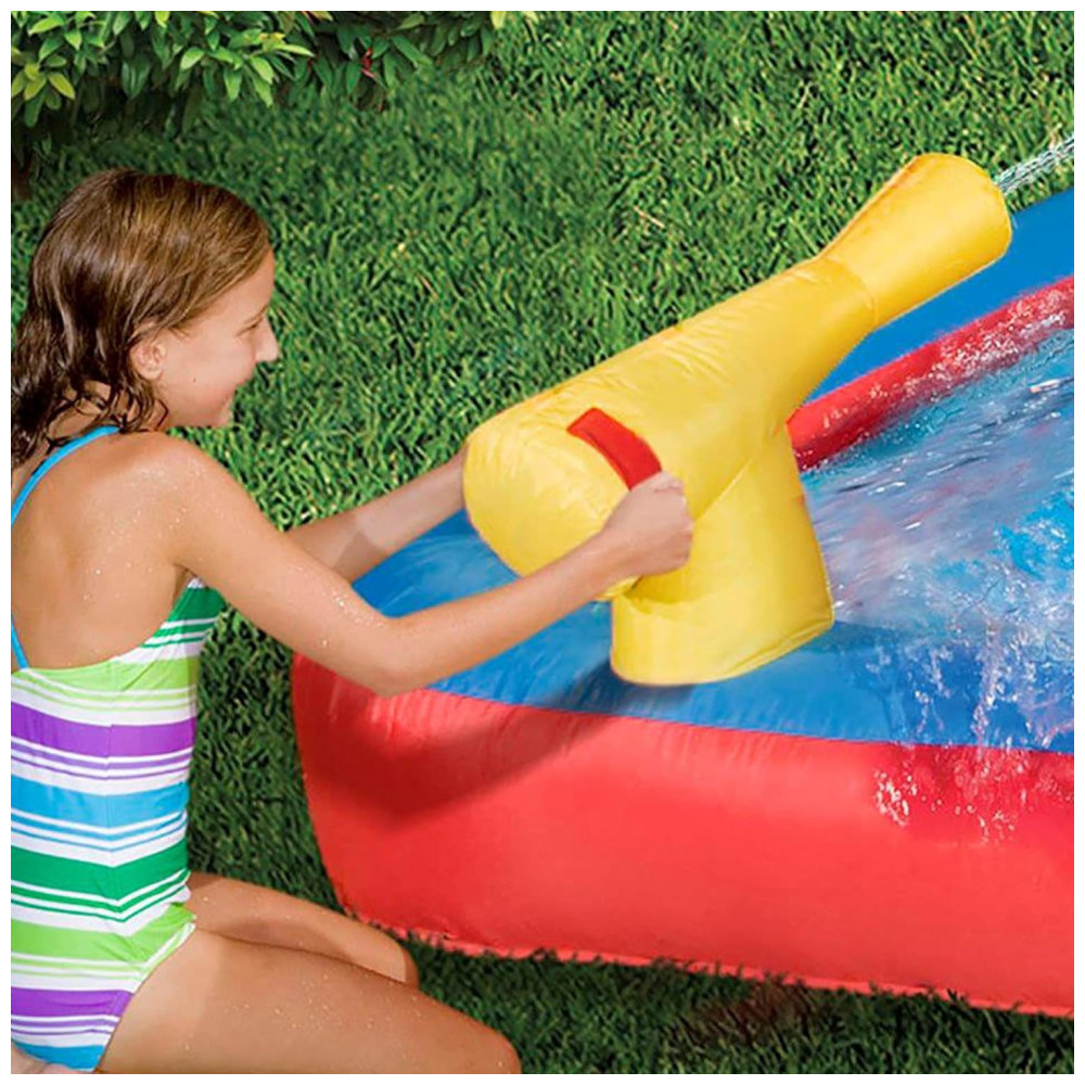 Parque Aquático Inflável até 170 kg com 3 Toboáguas 2 Canhões de Água e 1 Cesta de Basquete para Crianças Acima de 5 Anos Banzai Colorido