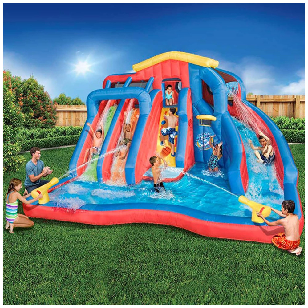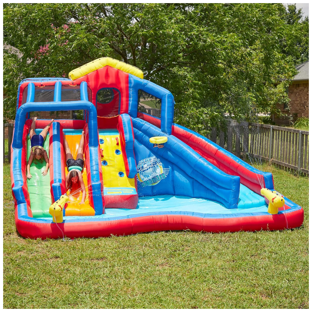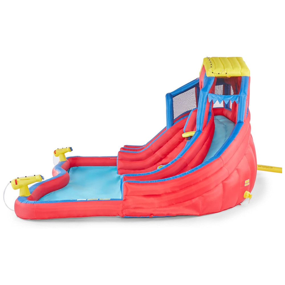 Aproveite o verão com a piscina inflável Hydro Blast, que inclui um emocionante escorregador curvo e dois escorregadores de pista dupla. Este parque aquático inflável é ideal para crianças a partir de 5 anos e pode suportar até 68,03 quilos de uma vez só.