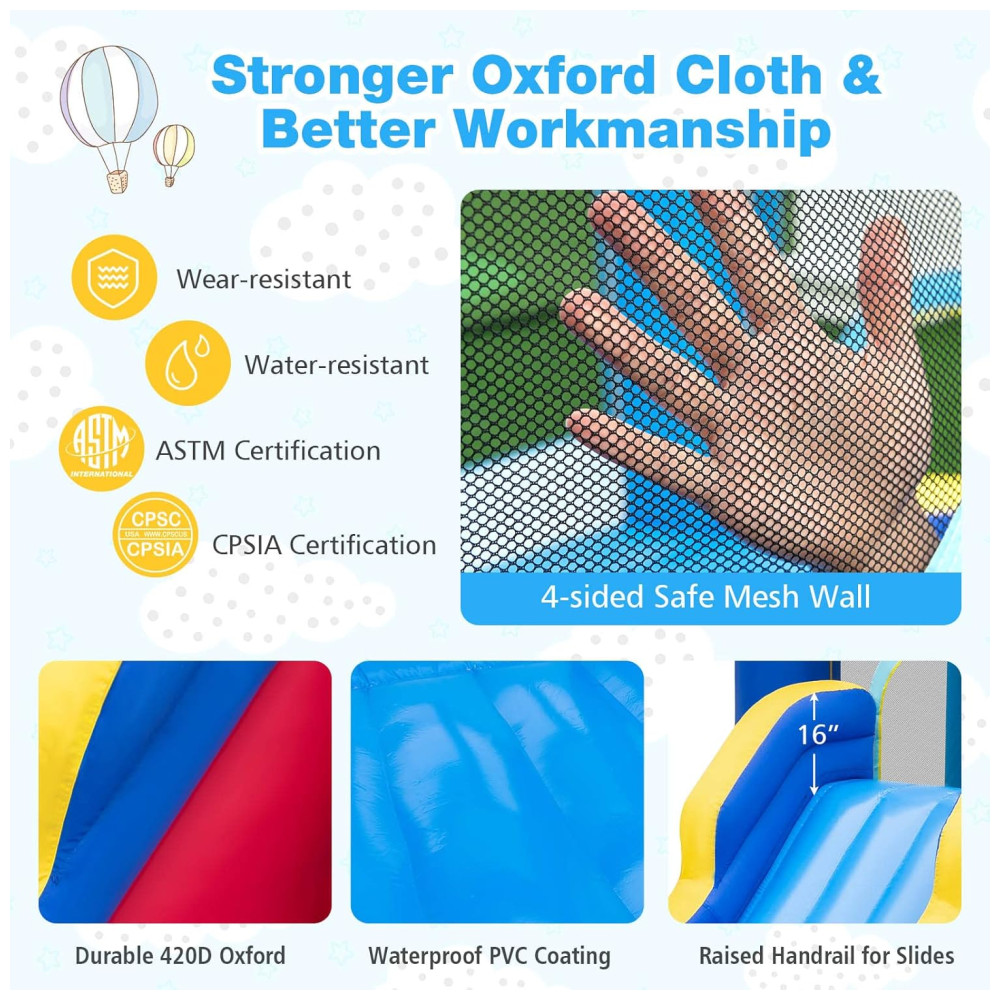 O BOUNTECH Inflatable Water Slide é feito de tecido Oxford 420D e 840D, um material espesso, durável e resistente ao desgaste, que proporciona segurança e longa durabilidade ao produto. Ele também conta com reforço duplo para maior resistência.