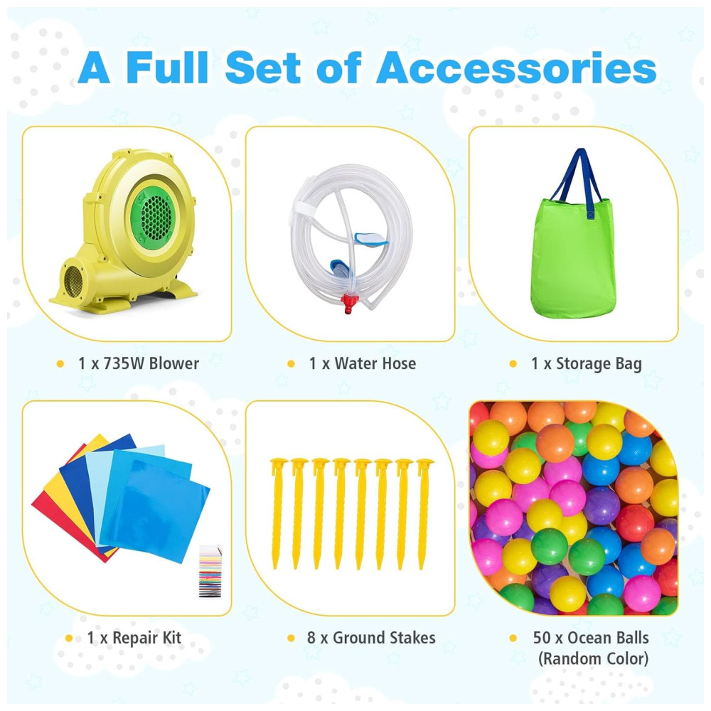 Transforme a diversão das crianças com o nosso combo de pula-pula inflável com escorregador e piscina de água! Com um longo escorregador, uma grande piscina de bolinhas e área de pulo, as crianças desfrutarão de diversos jogos. Além disso, a cesta de basquete estimula equilíbrio e coordenação. Feito com materiais duráveis e resistentes, com áreas ventiladas para segurança. Perfeito para a família toda se divertir ao ar livre! Inflação rápida em 2 minutos, fácil de transportar e armazenar. Segurança reforçada com redes de proteção, guarda-corpos e estacas para fixação. Ideal para uso interno e externo, garantindo durabilidade e muita diversão!