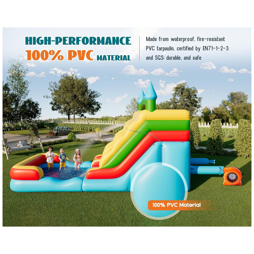 O Albott Commercial Bounce House with Slide & Water Pool é feito 100% de PVC, material pesado e resistente, adequado para uso comercial e recreação ao ar livre. O PVC proporciona durabilidade, resistência a rasgos e impermeabilidade, sendo ideal para suportar o uso intenso por crianças e adultos em ambientes externos.