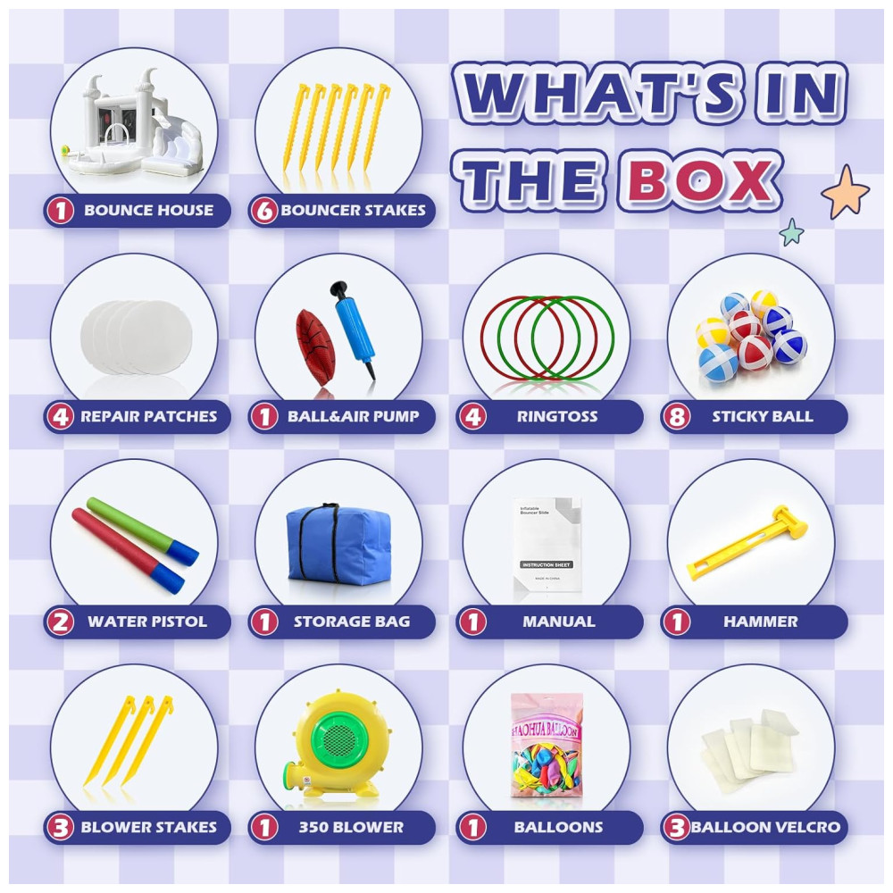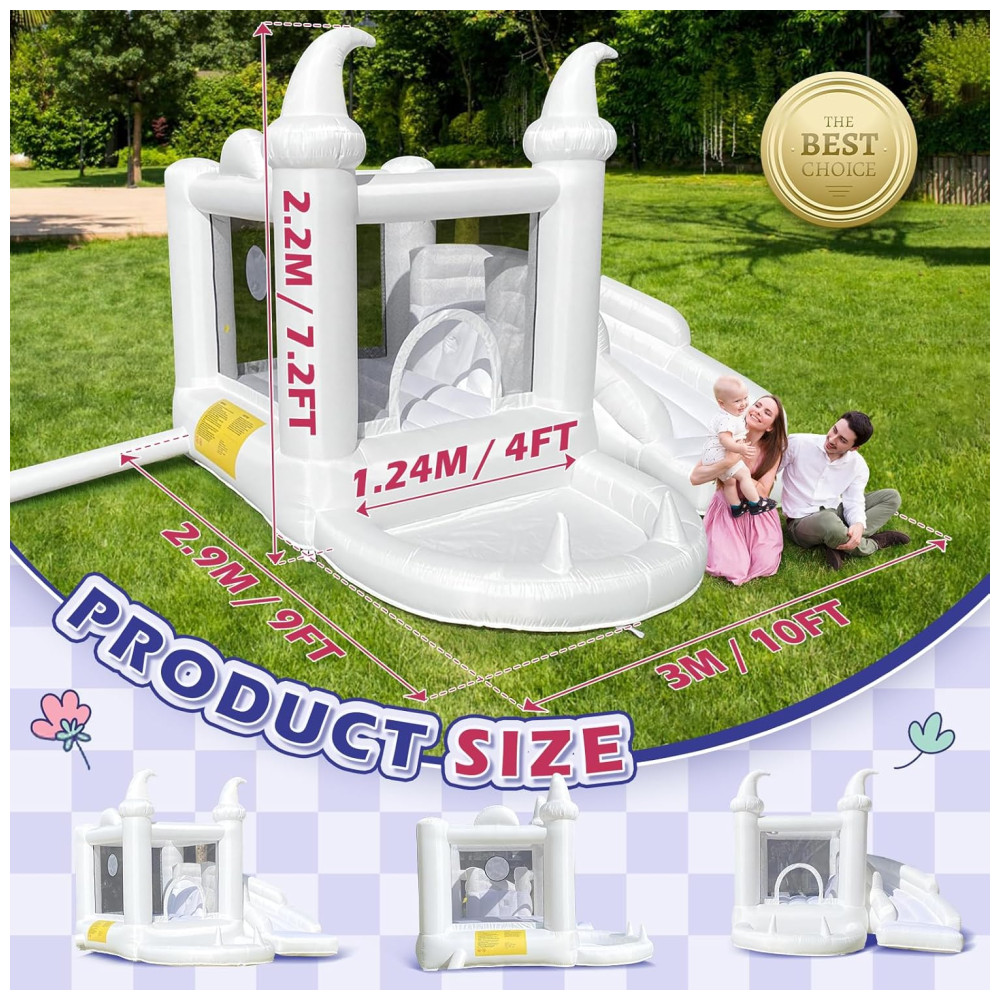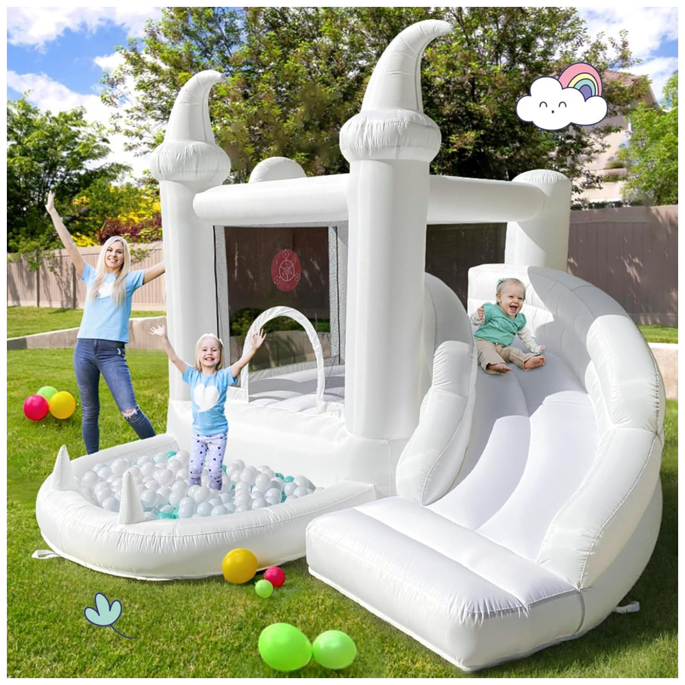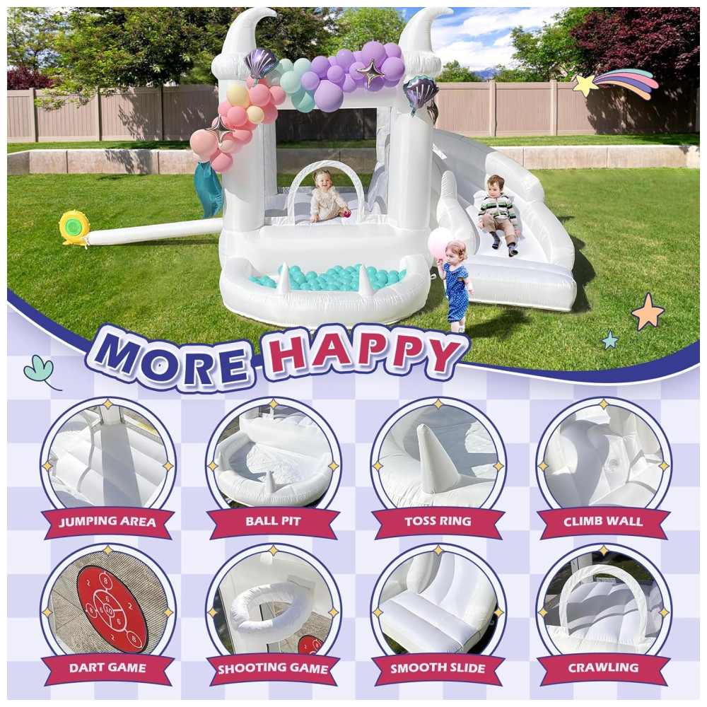 O White Bounce House with Pool and Slide da marca Cessbong é feito de material Oxford de alta qualidade combinado com PVC vinil, garantindo durabilidade e resistência. O produto utiliza um processo de costura com dupla agulha e quatro fios para reforçar a estrutura e aumentar a longevidade do brinquedo inflável.