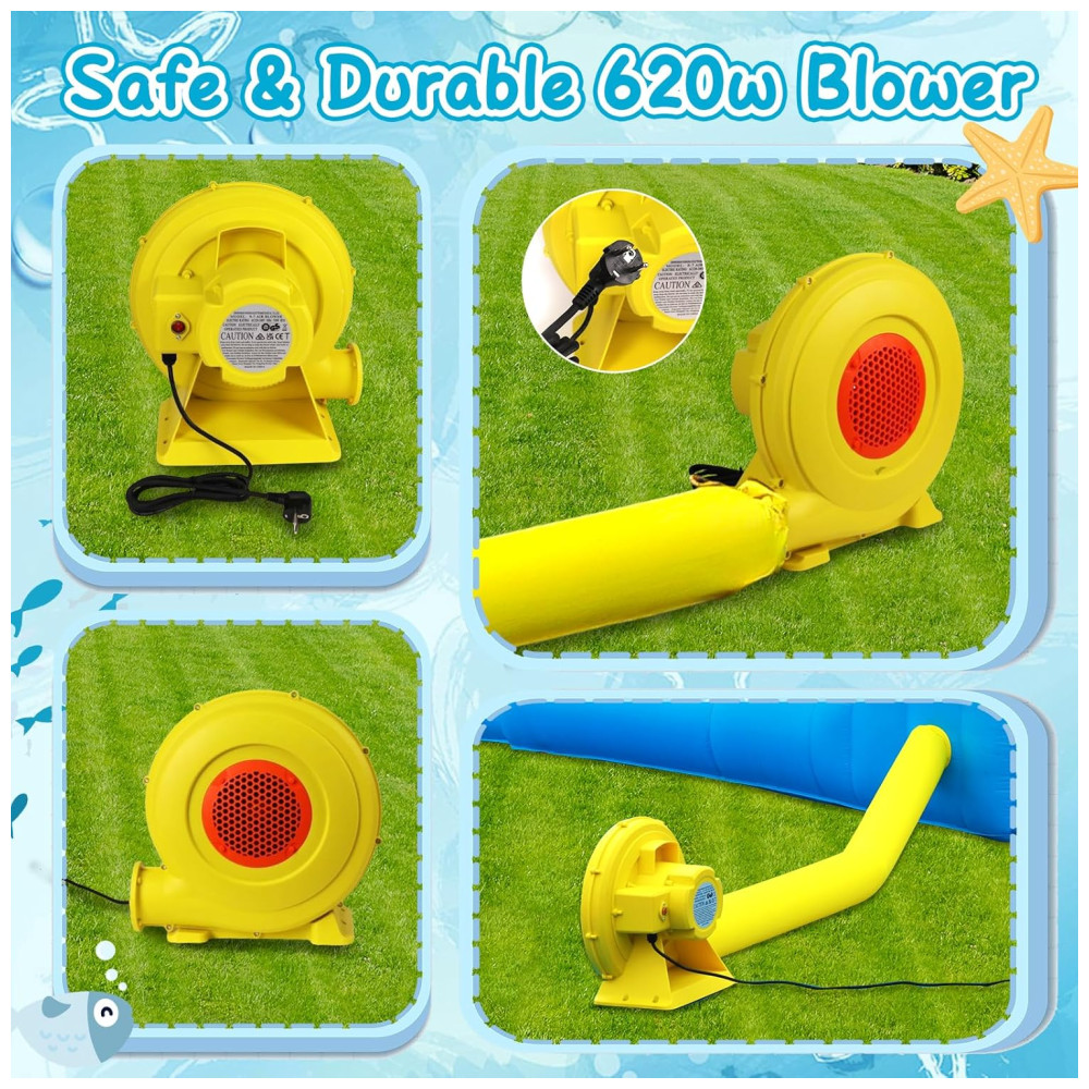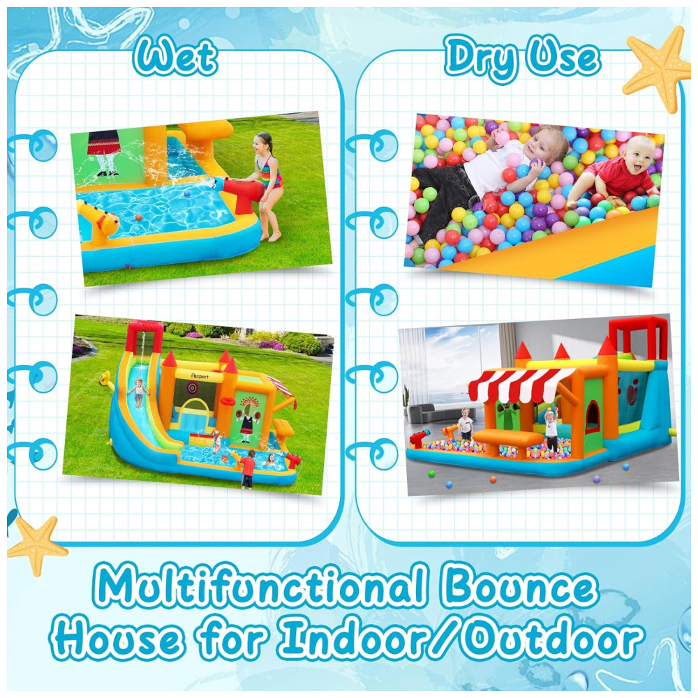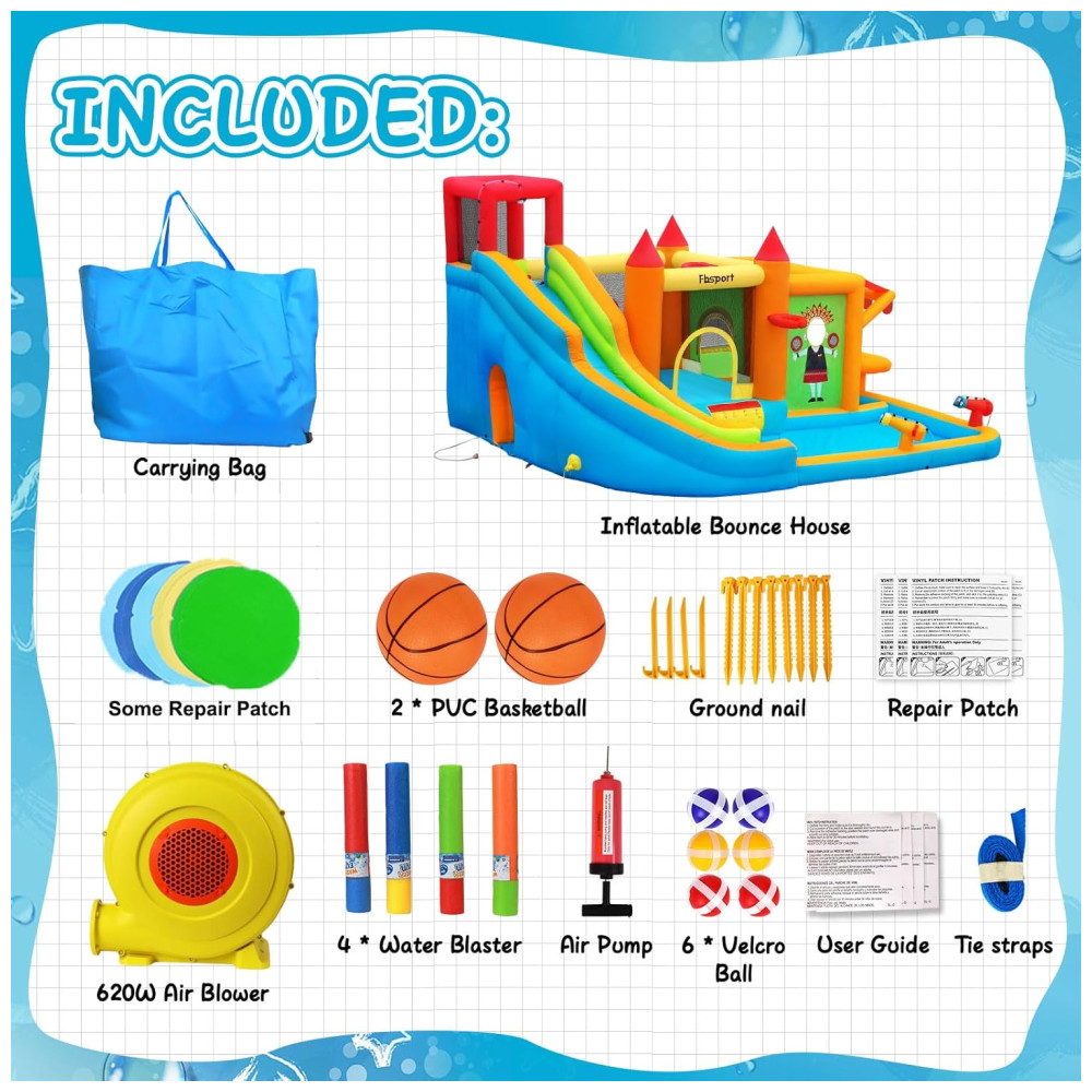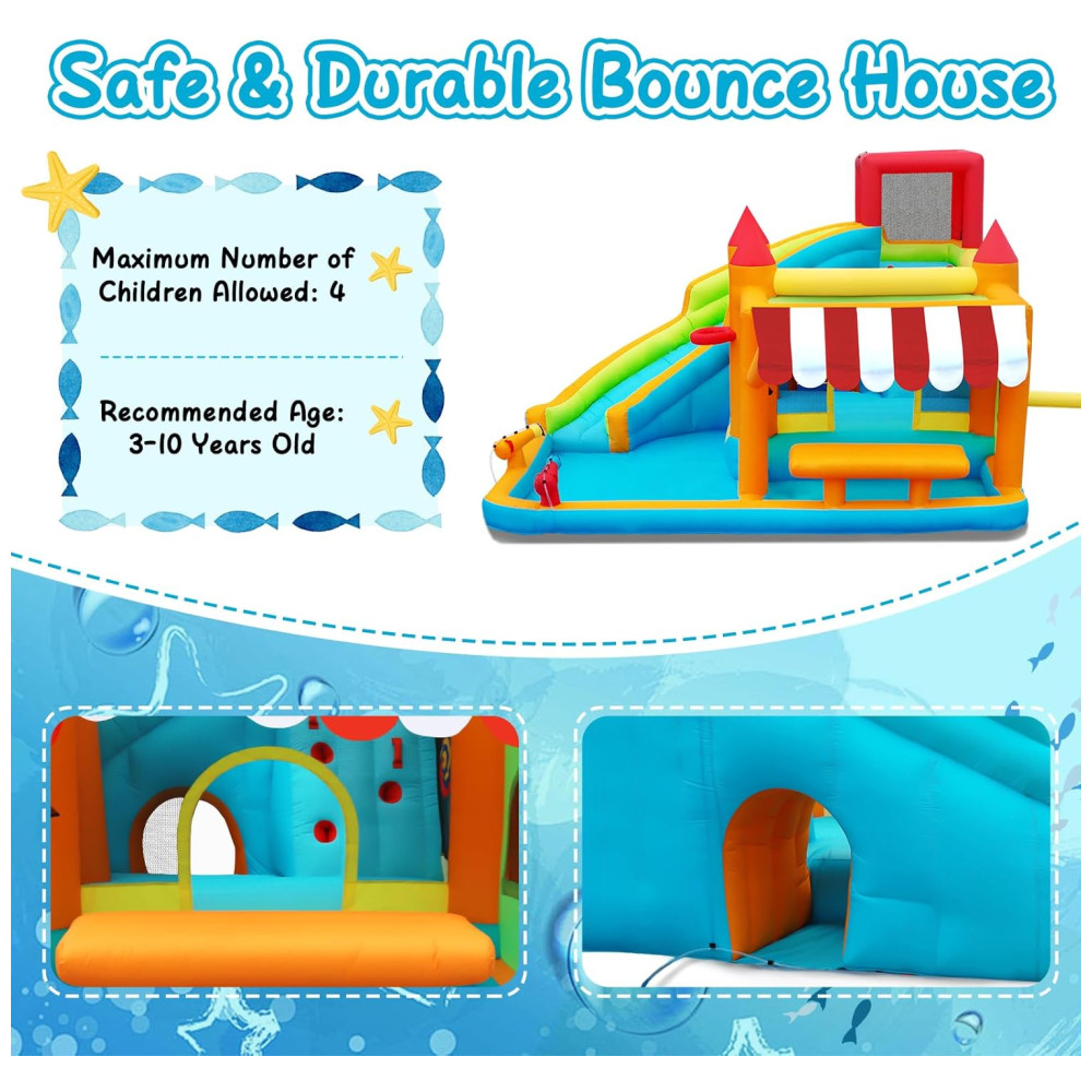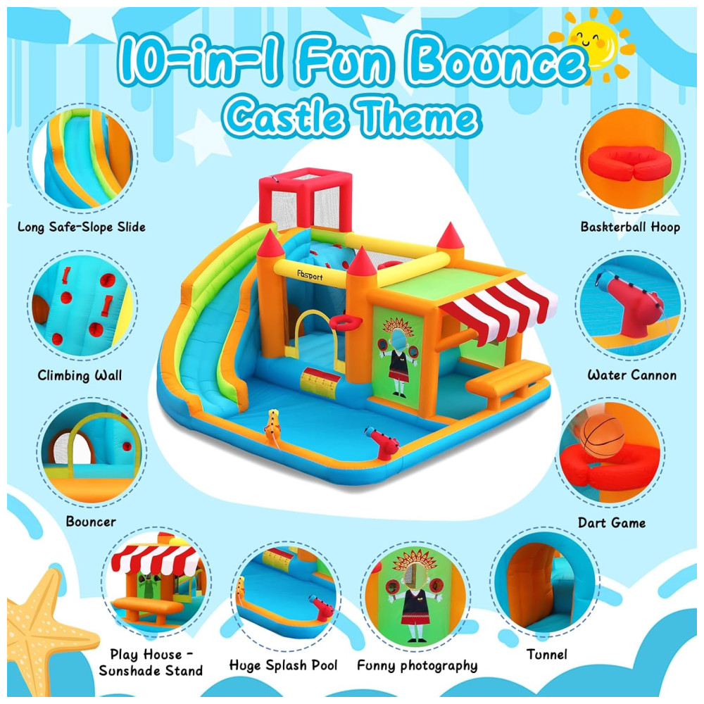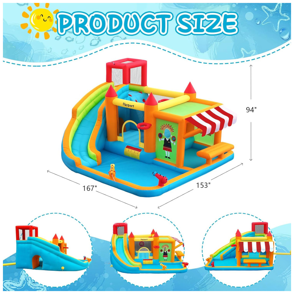 A Casa Inflável de Pula-Pula com Tobogã Aquático 10 em 1 da FBSPORT é o sonho de toda criança! Com tobogã, piscina de respingos, área de pulo, duas pistolas d’água, parede de escalada, dois aros de basquete, aspersores, túnel, área de fotografia divertida, jogos de arremesso e um quiosque com sombra para brincadeiras imaginativas. Feita com materiais de alta qualidade e design seguro, esta casa inflável proporciona anos de diversão segura. Pode ser usada tanto molhada quanto seca, perfeita para festas de aniversário e atividades ao ar livre. Acompanha um soprador elétrico de alta qualidade para inflar rapidamente. Tudo o que você precisa em um só pacote!