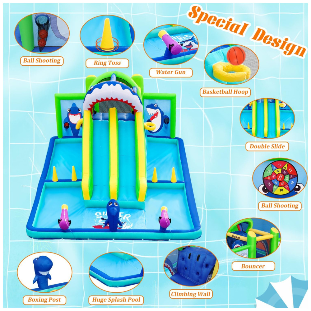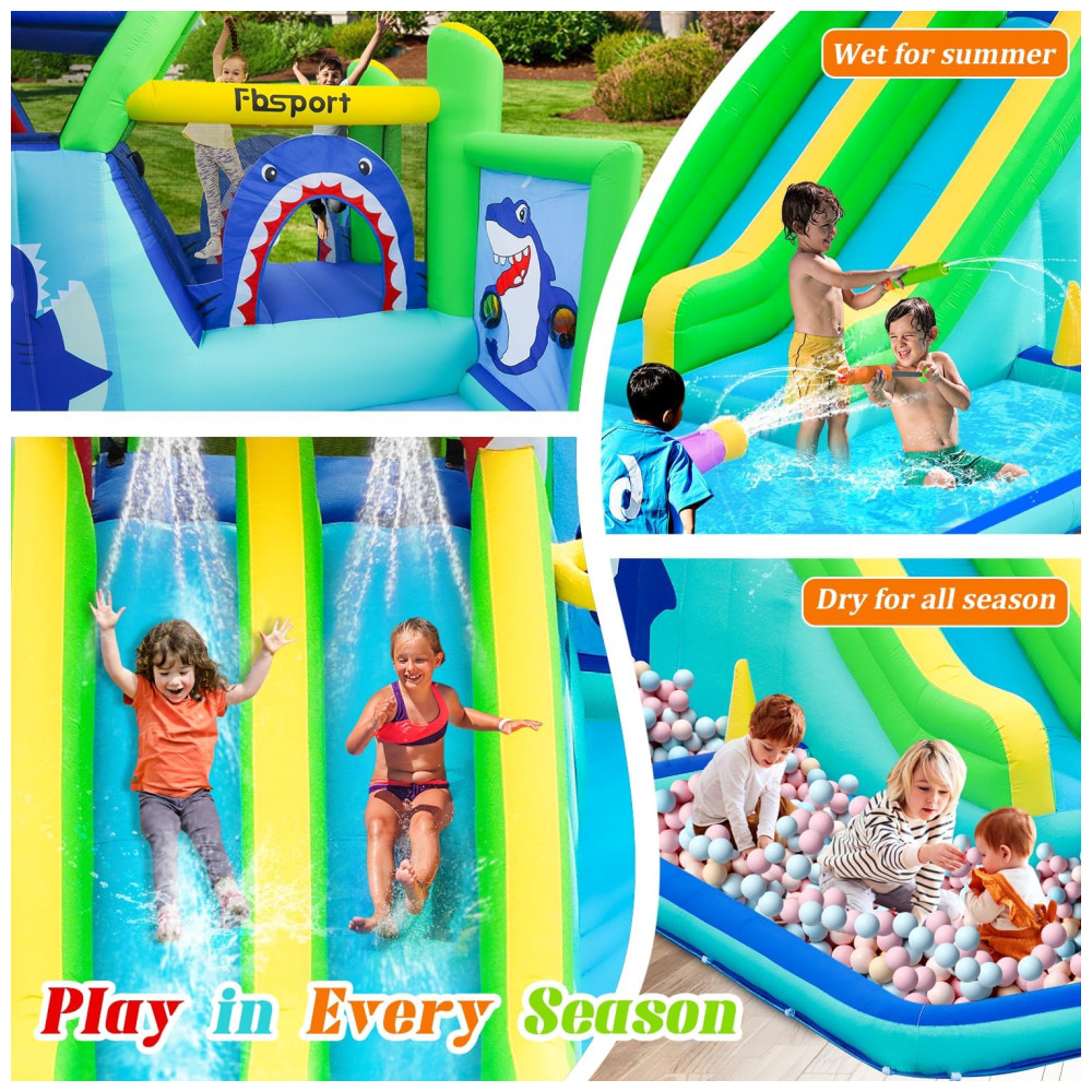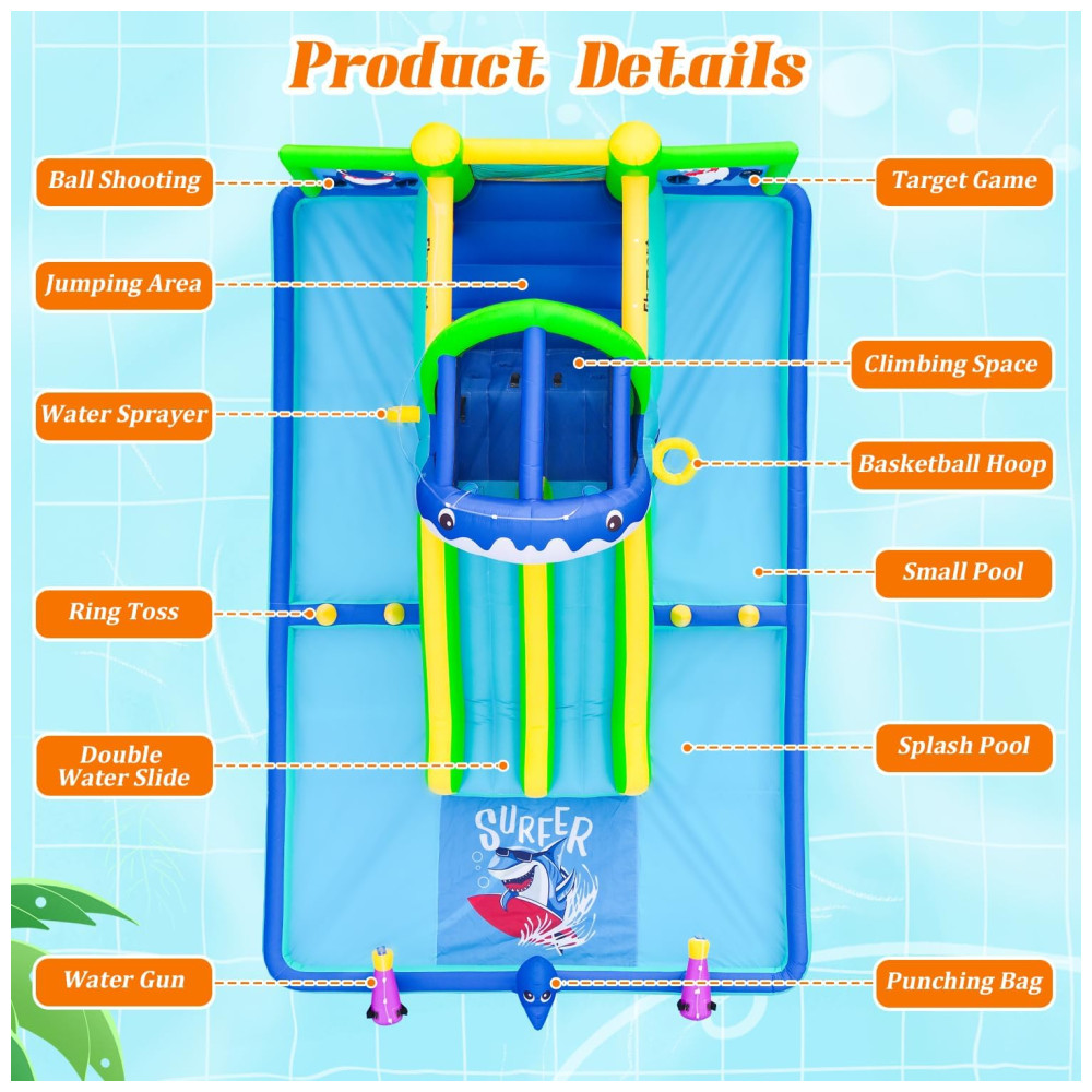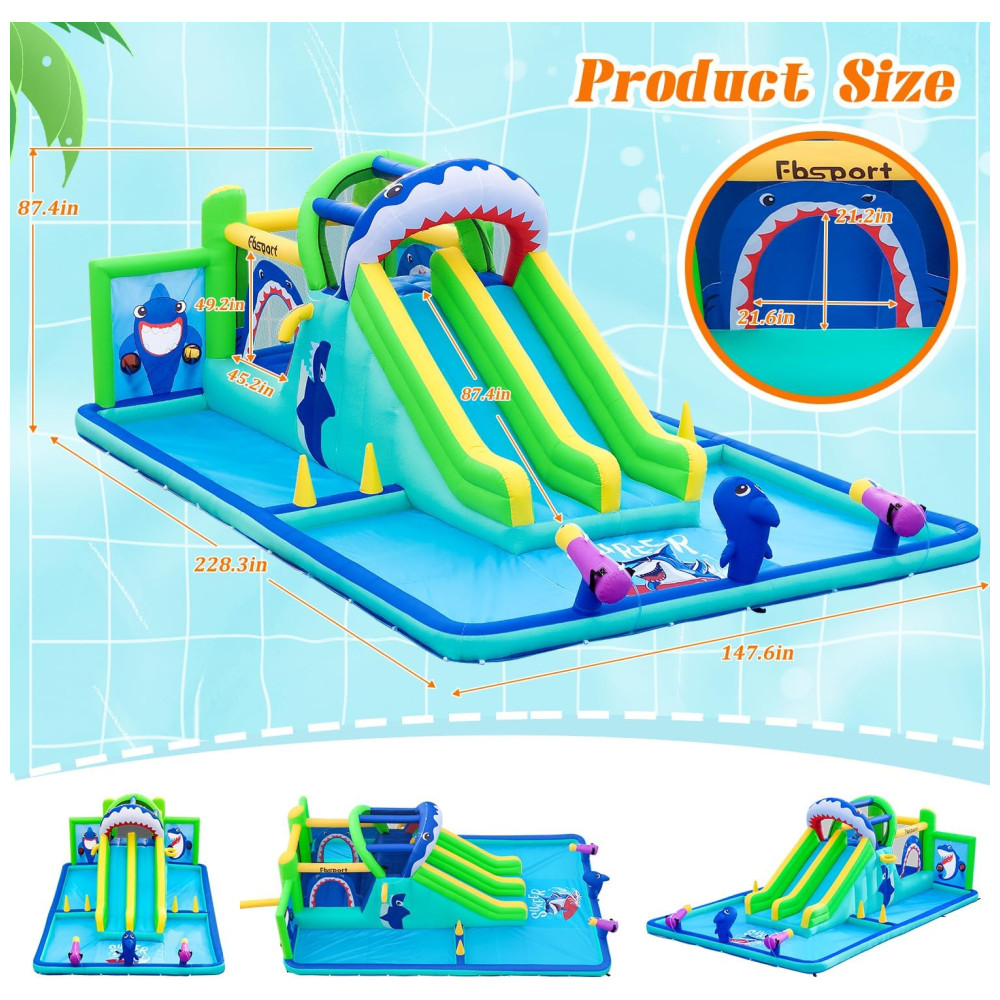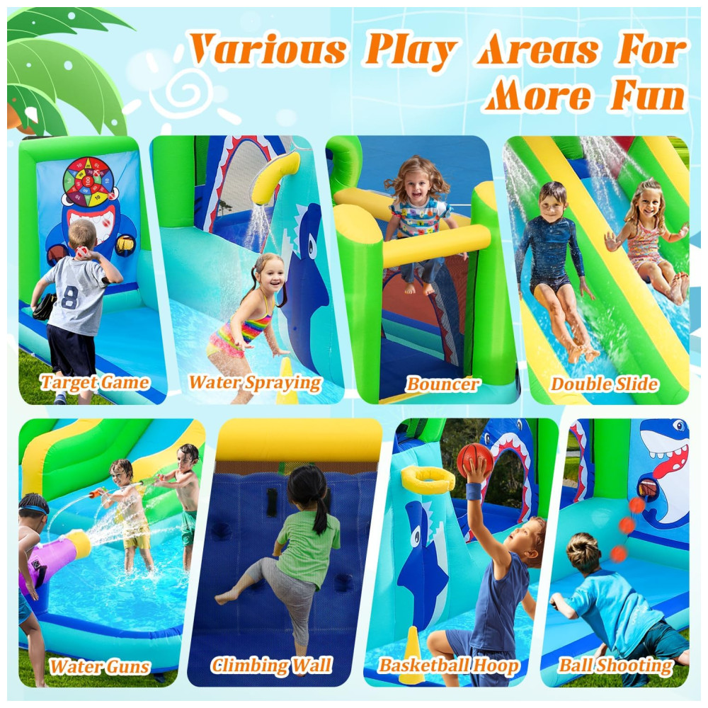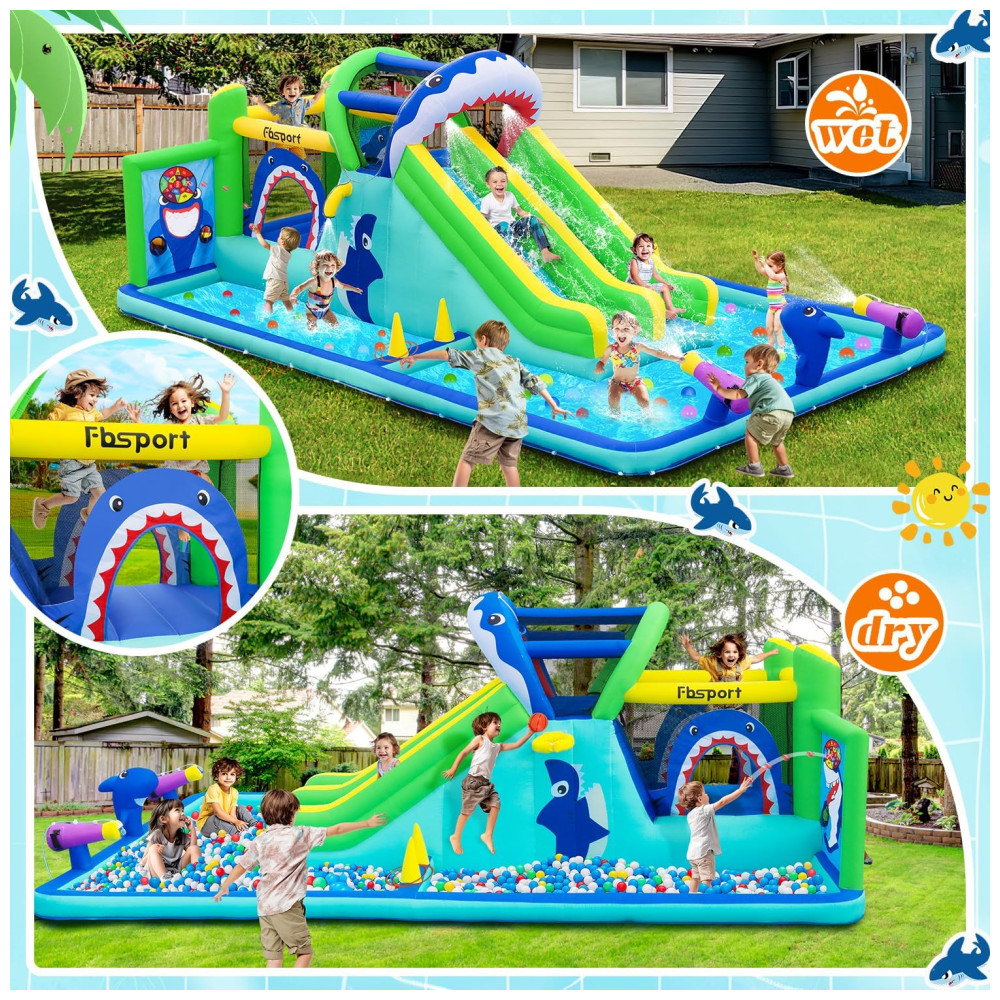 Apresentamos a Casa Inflável com Tobogã e Parque Aquático da FBSPORT, perfeita para o verão, festas de aniversário, festivais e feriados. Com uma ampla piscina onde as crianças podem brincar e ter batalhas de água, a diversão é garantida. Este parque aquático inflável inclui tudo que você precisa: um inflável com duplo tobogã, parede de escalada, área de pulo, arremesso de argolas, cesta de basquete, splash e muito mais. Fabricado com material PVC espesso e seguro, possui costuras duplas para maior durabilidade e segurança. Além de afastar as crianças dos eletrônicos, incentiva o desenvolvimento de habilidades motoras, socialização e brincadeiras criativas. Com áreas de jogo diversificadas, como jogo alvo, pistolas d’água, parede de escalada, tobogã duplo e muito mais, este parque aquático é garantia de entretenimento sem fim. Aproveite a diversão ao ar livre com segurança e praticidade. Aproveite agora!