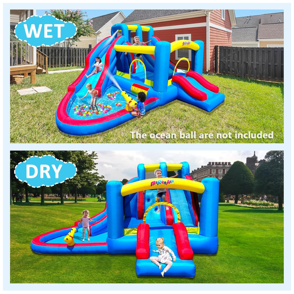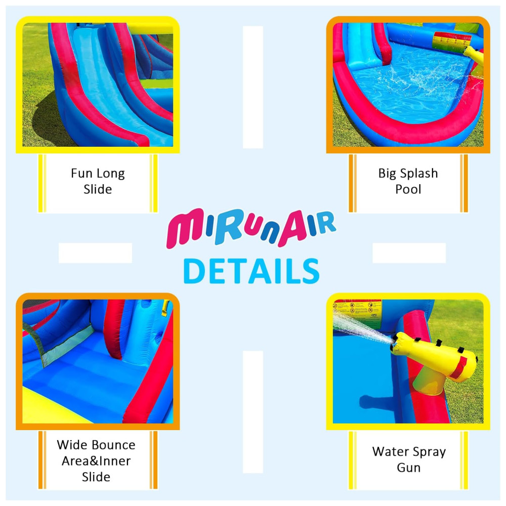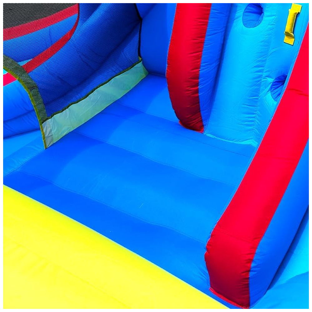 O Inflatable Bounce House da MIRUNAIR, que inclui escorregador, piscina splash, canhão de água e parede de escalada, é feito de tecido Oxford reforçado com gramaturas 840D e 420D, utilizando tecnologia avançada de costura para garantir resistência e durabilidade. Esse material é espesso, durável e adequado para uso externo, proporcionando segurança e longa vida útil ao brinquedo inflável.