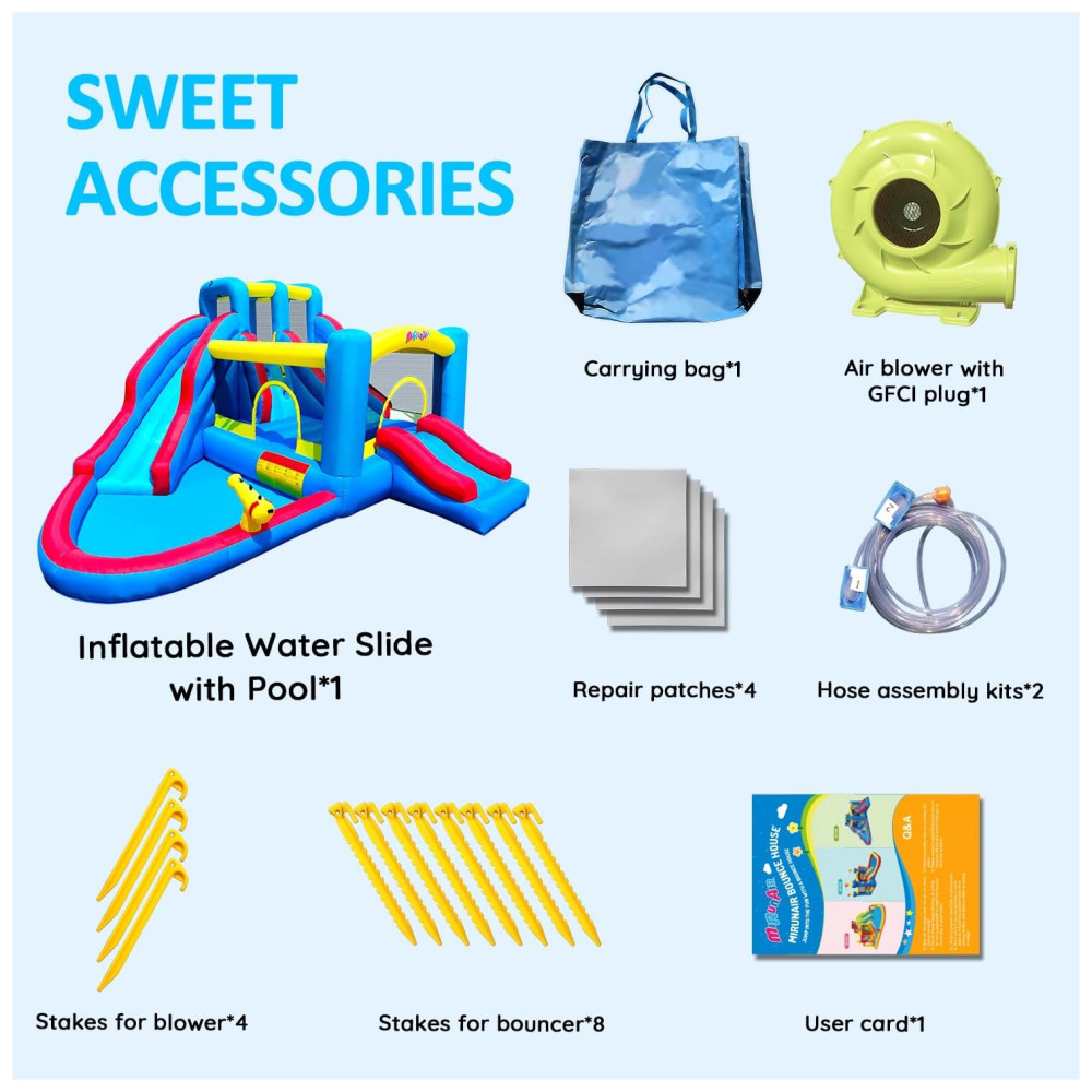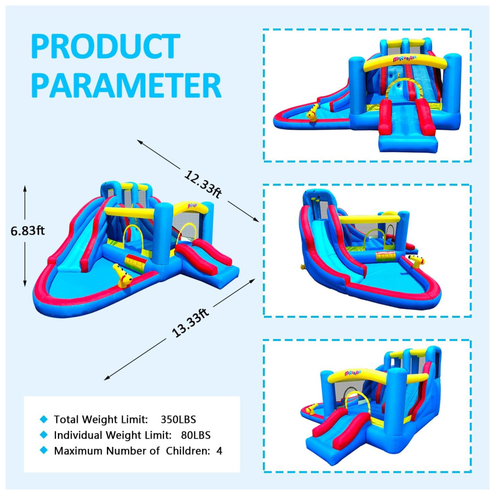 A Casa Inflável com Tobogã é feita de tecido oxford 840D,420D espesso com tecnologia avançada de costura para máxima resistência. Possui rede de segurança na torre, corrimãos altos no tobogã e plataformas de segurança na parede de escalada. Ideal para crianças de 3 a 10 anos, promovendo coordenação motora e agilidade. Com dois tobogãs, uma piscina de mergulho, parede de escalada, canhão de água, garantindo diversão contínua para a família. Fácil e seguro de montar, com capacidade máxima de 158,76 kg. Perfeito para uso ao ar livre em parques, gramados e quintais. Acompanha bolsa para transporte e armazenamento. Aproveite a diversão aquática no quintal!