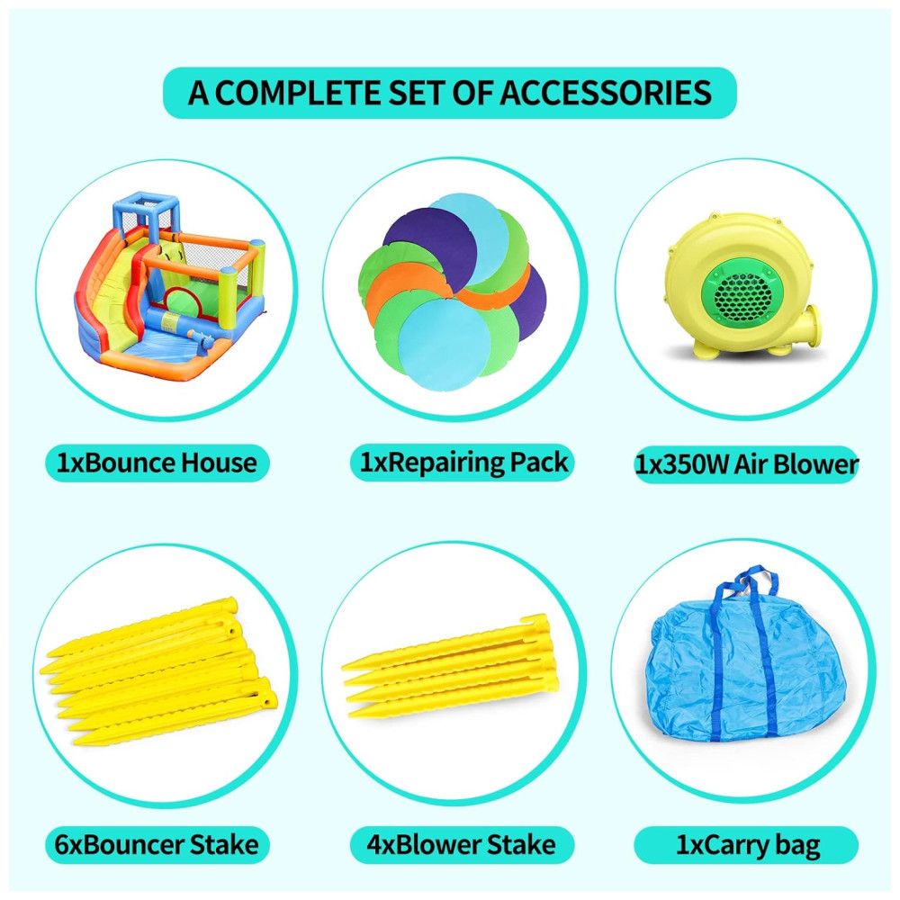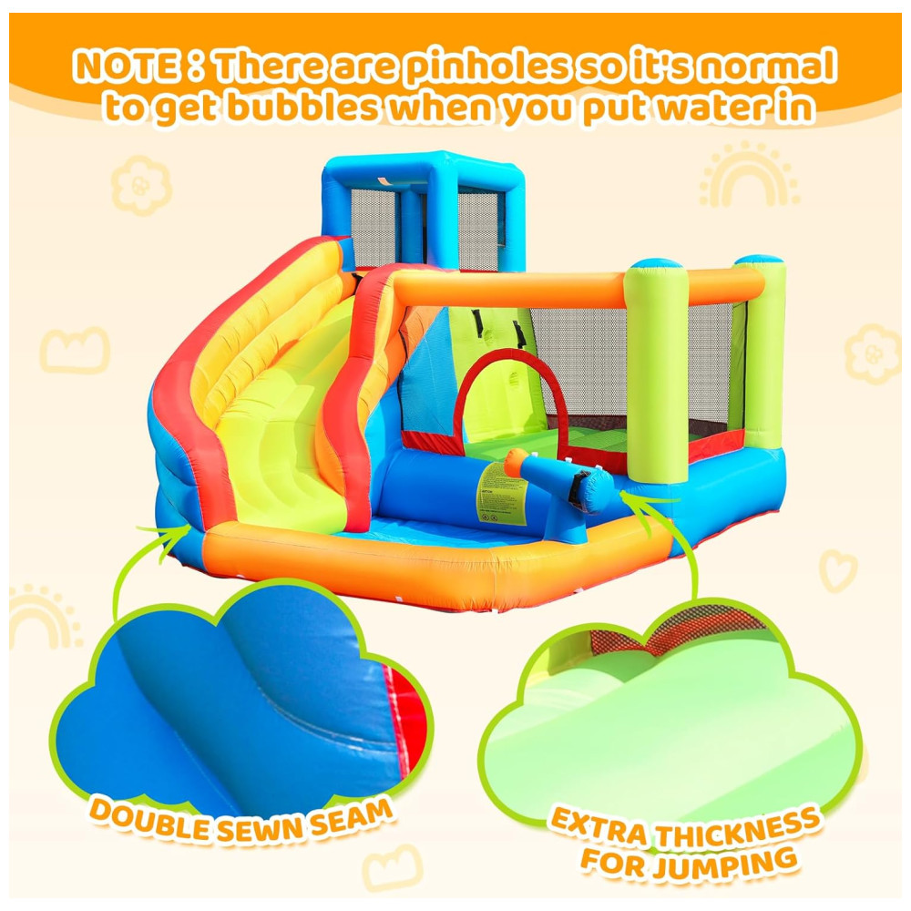 O Doctor Dolphin Inflatable Water Slide Bounce House é feito de tecido Oxford durável e resistente, combinado com nylon 420D e lona (tarpaulin) de PVC, materiais que são à prova de furos e testados em laboratório para garantir segurança e durabilidade. Essas características tornam o brinquedo adequado para uso intenso, com costuras reforçadas para maior resistência e segurança durante as brincadeiras aquáticas e secas.