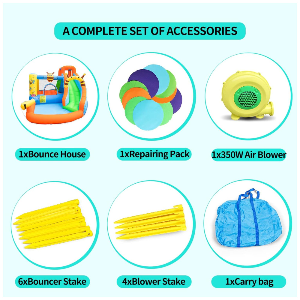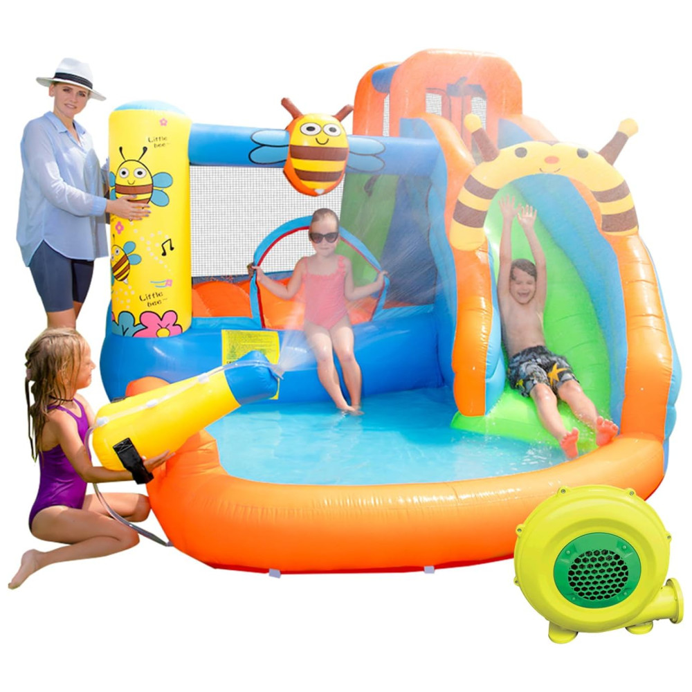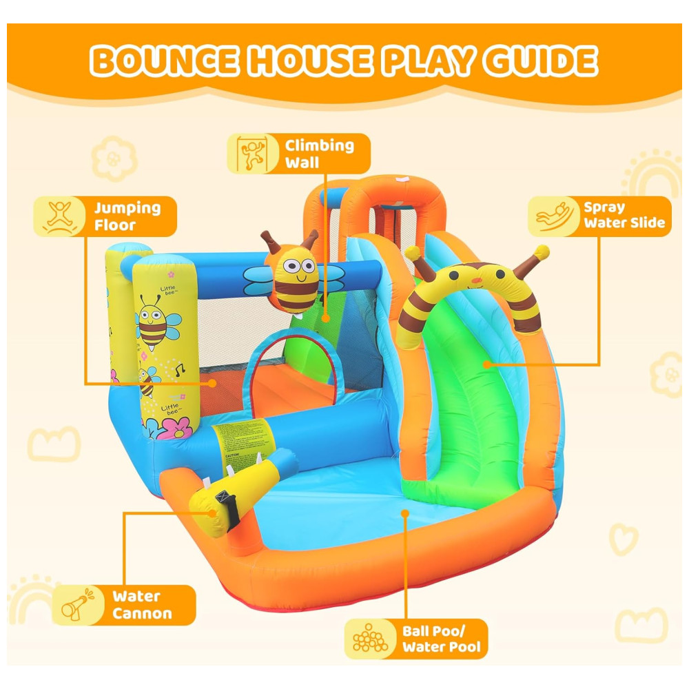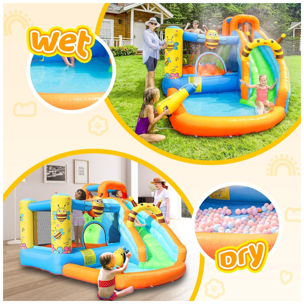 Apresentamos a Casa de Saltos e Toboágua 5 em 1 da Doctor Dolphin, com design de abelha, perfeita para diversão molhada e seca! Feita com tecido resistente de nylon 420D e lona de PVC, esta casa inflável oferece uma variedade de zonas de entretenimento, incluindo um longo tobogã, uma grande piscina de splash, área de pulos, parede de escalada e pistola d’água. Material resistente e confortável, costuras reforçadas, paredes de tela para ventilação e visibilidade. Pode ser usada tanto molhada quanto seca. Infla e desinfla rapidamente com o soprador de ar de 450W incluído. Acompanha acessórios adoráveis para garantir a diversão das crianças!