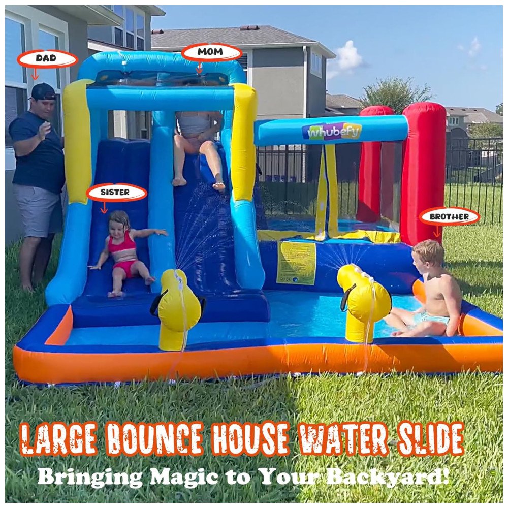 O Whubefy Bounce House Waterslide para crianças, modelo 9 em 1, é feito de tecido Oxford 840D combinado com tecido Oxford 420D, materiais duráveis, resistentes a rasgos e desgastes, que garantem segurança e longa durabilidade para uso interno e externo, incluindo brincadeiras com água.