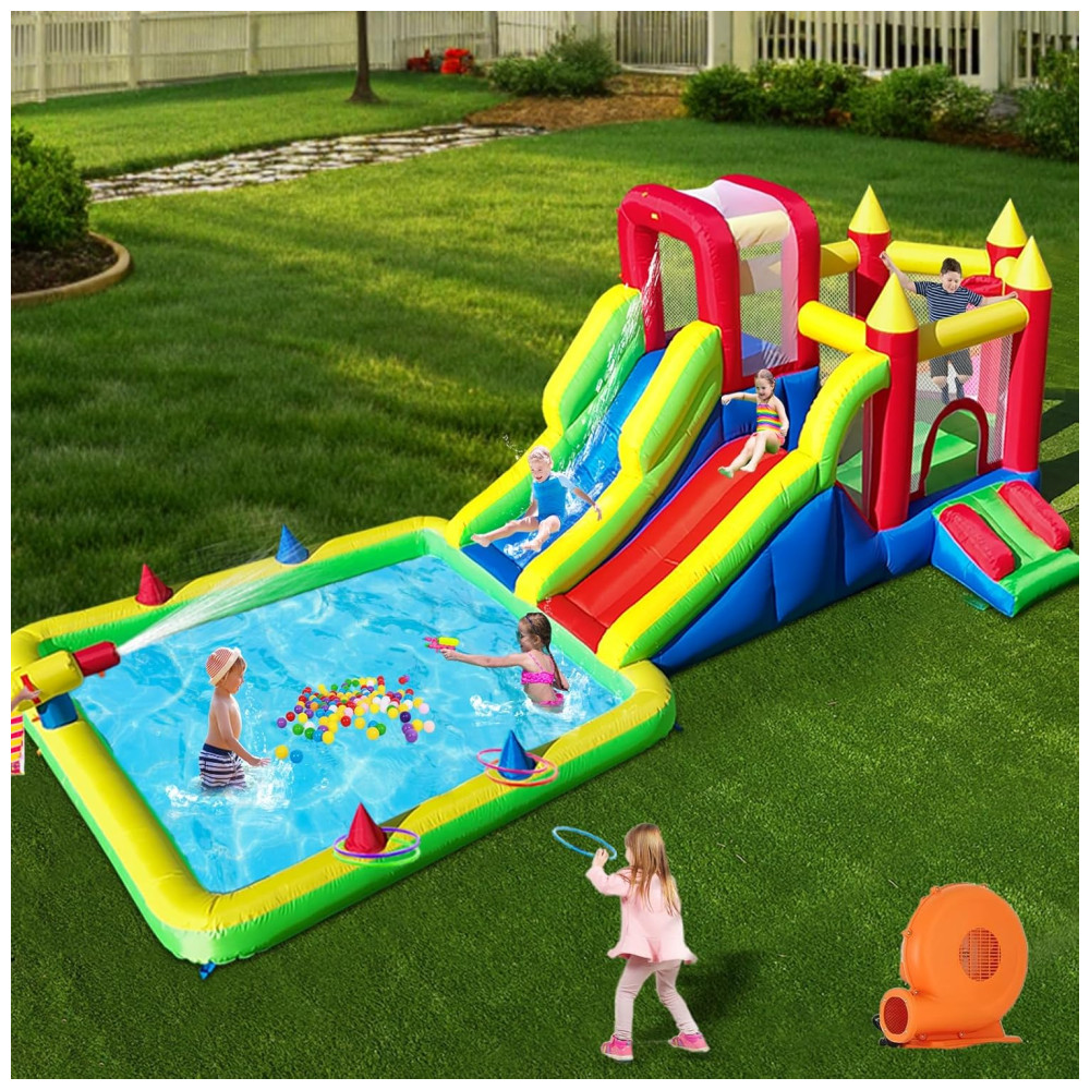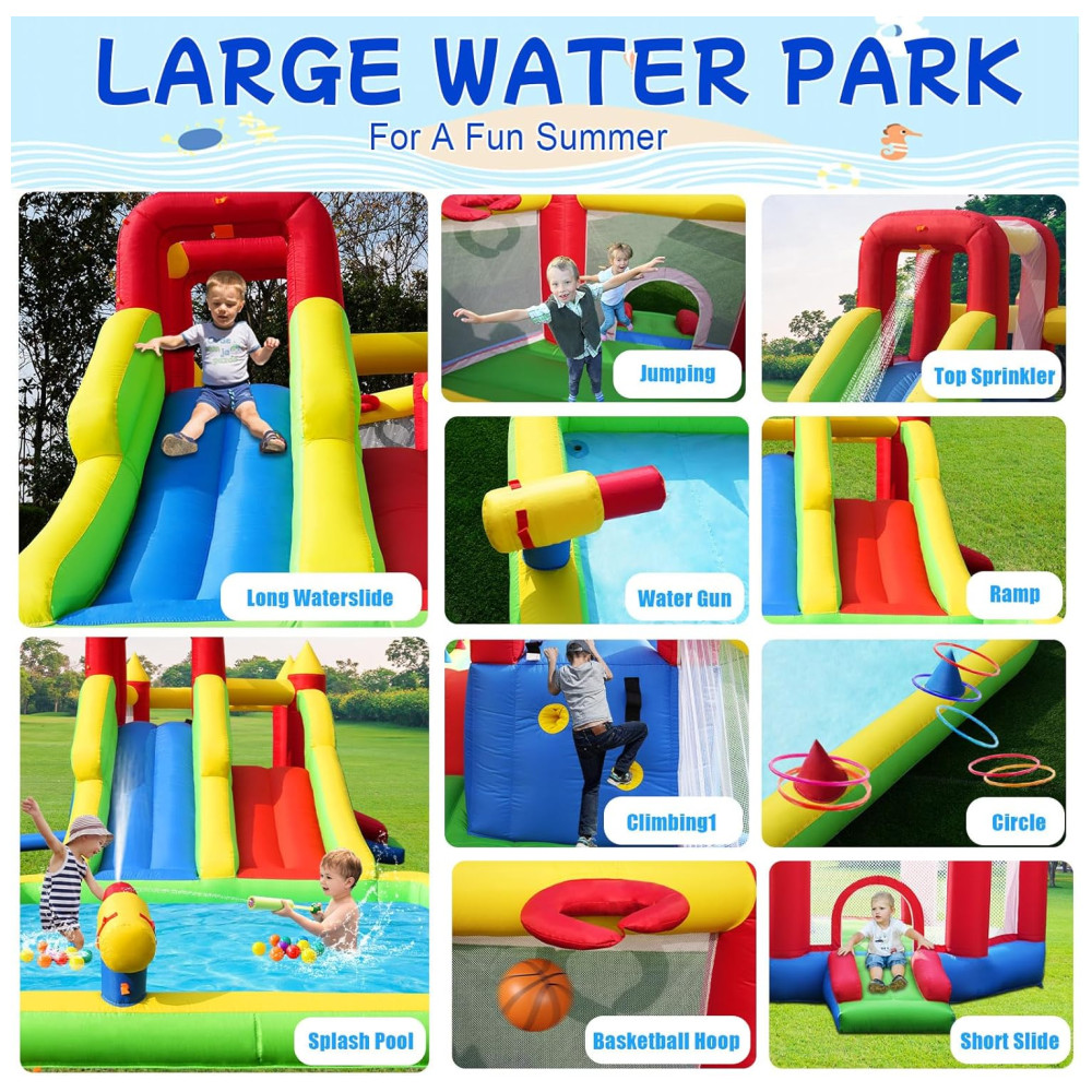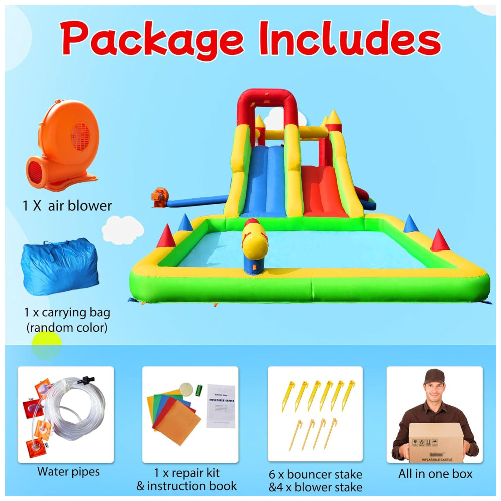 Transforme seu quintal em um verdadeiro paraíso aquático com o Parque Aquático Inflável Umbalir 10 em 1! Este inflável incrível conta com dois tobogãs, uma enorme piscina splash, pistolas de água, parede de escalada, cama elástica e rampa deslizante, proporcionando entretenimento sem fim para crianças de todas as idades. Com a segurança em primeiro lugar, o parque possui redes de segurança ao redor da área de pulo, corrimãos elevados nos tobogãs e guarda-malhas robustos, garantindo a proteção das crianças enquanto escalam, deslizam e pulam. Feito com material de alta qualidade, resistente a rasgos e perfurações, este parque aquático é durável e atende aos mais altos padrões de segurança. Fácil de inflar, montar e desmontar, é o presente perfeito para festas, encontros familiares e momentos inesquecíveis!