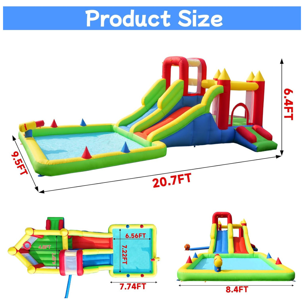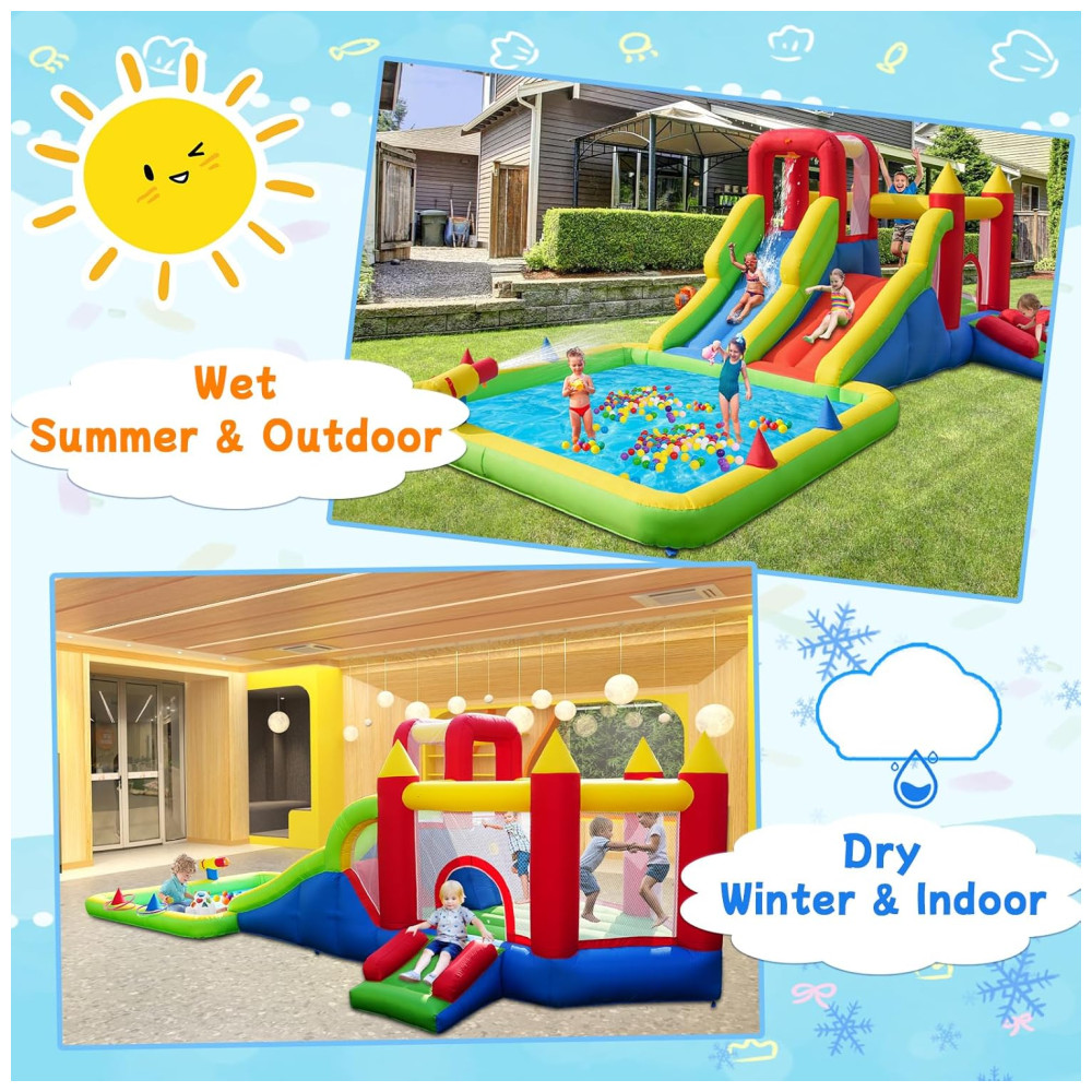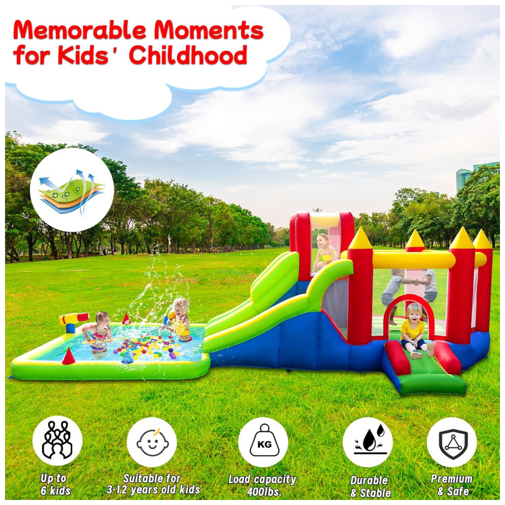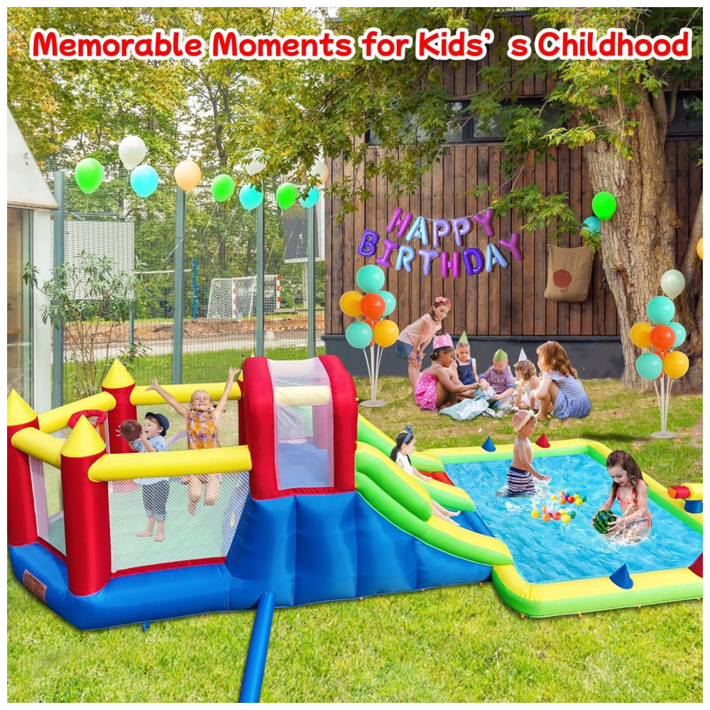 Transforme seu quintal em um verdadeiro paraíso aquático com o Parque Aquático Inflável Umbalir 10 em 1! Este inflável incrível conta com dois tobogãs, uma enorme piscina splash, pistolas de água, parede de escalada, cama elástica e rampa deslizante, proporcionando entretenimento sem fim para crianças de todas as idades. Com a segurança em primeiro lugar, o parque possui redes de segurança ao redor da área de pulo, corrimãos elevados nos tobogãs e guarda-malhas robustos, garantindo a proteção das crianças enquanto escalam, deslizam e pulam. Feito com material de alta qualidade, resistente a rasgos e perfurações, este parque aquático é durável e atende aos mais altos padrões de segurança. Fácil de inflar, montar e desmontar, é o presente perfeito para festas, encontros familiares e momentos inesquecíveis!