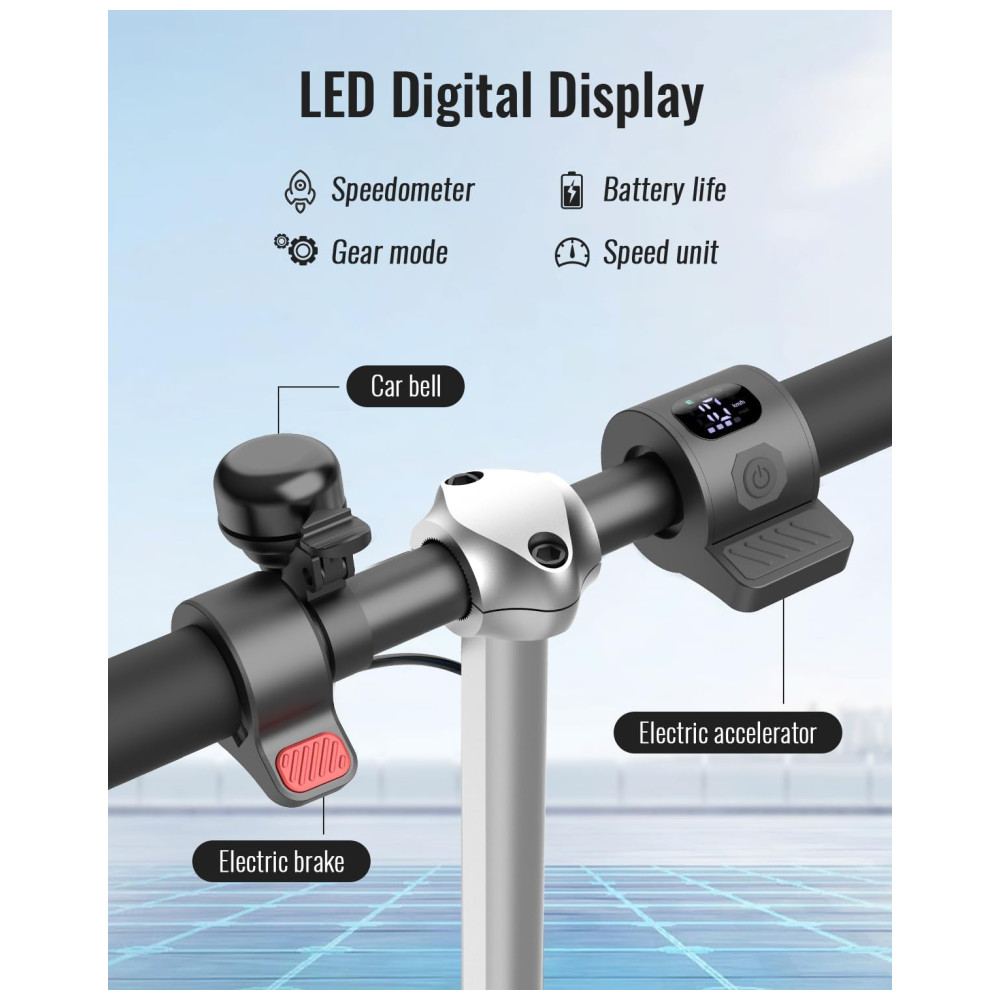 A scooter elétrica Gyroor H40 é perfeita para crianças de 6 a 12 anos, com um potente motor de 180 W e uma bateria de íon de lítio recarregável de 21,6 V 2600 mAh, que proporciona uma velocidade máxima de 16 km/h. O display LED indica com precisão a velocidade de condução, a marcha e a capacidade da bateria, tornando o seguro para as crianças.