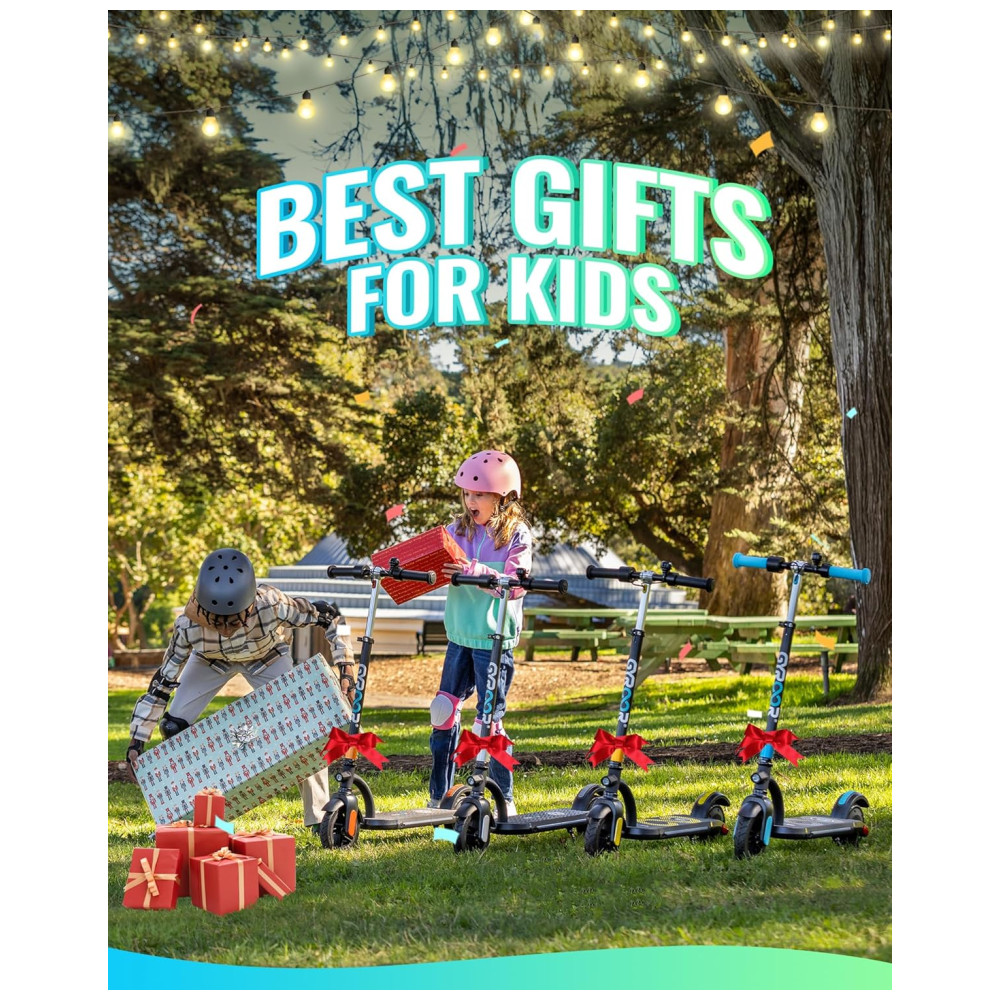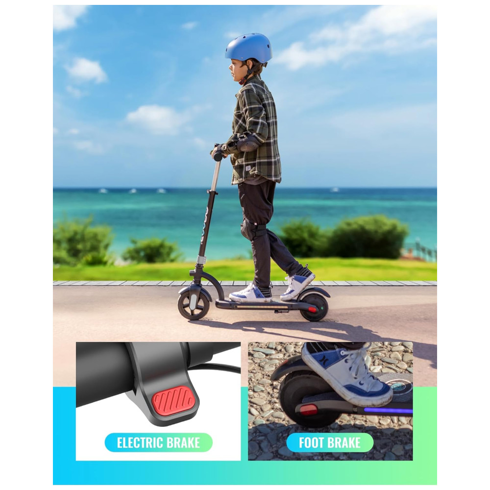 Equipado com 11 cm de rodas de borracha dianteiras e 10 cm traseiras para maior durabilidade e um passeio suave, suportando uma carga máxima de 64,85 quilos. Projetada para a segurança das crianças, a scooter possui dois modos de freio, freio eletrônico para paradas rápidas em velocidades mais altas e um freio de guarda lamas para evitar respingos em diversas condições climáticas. A melhor scooter elétrica para crianças, adequada para meninos, meninas e adolescentes.
