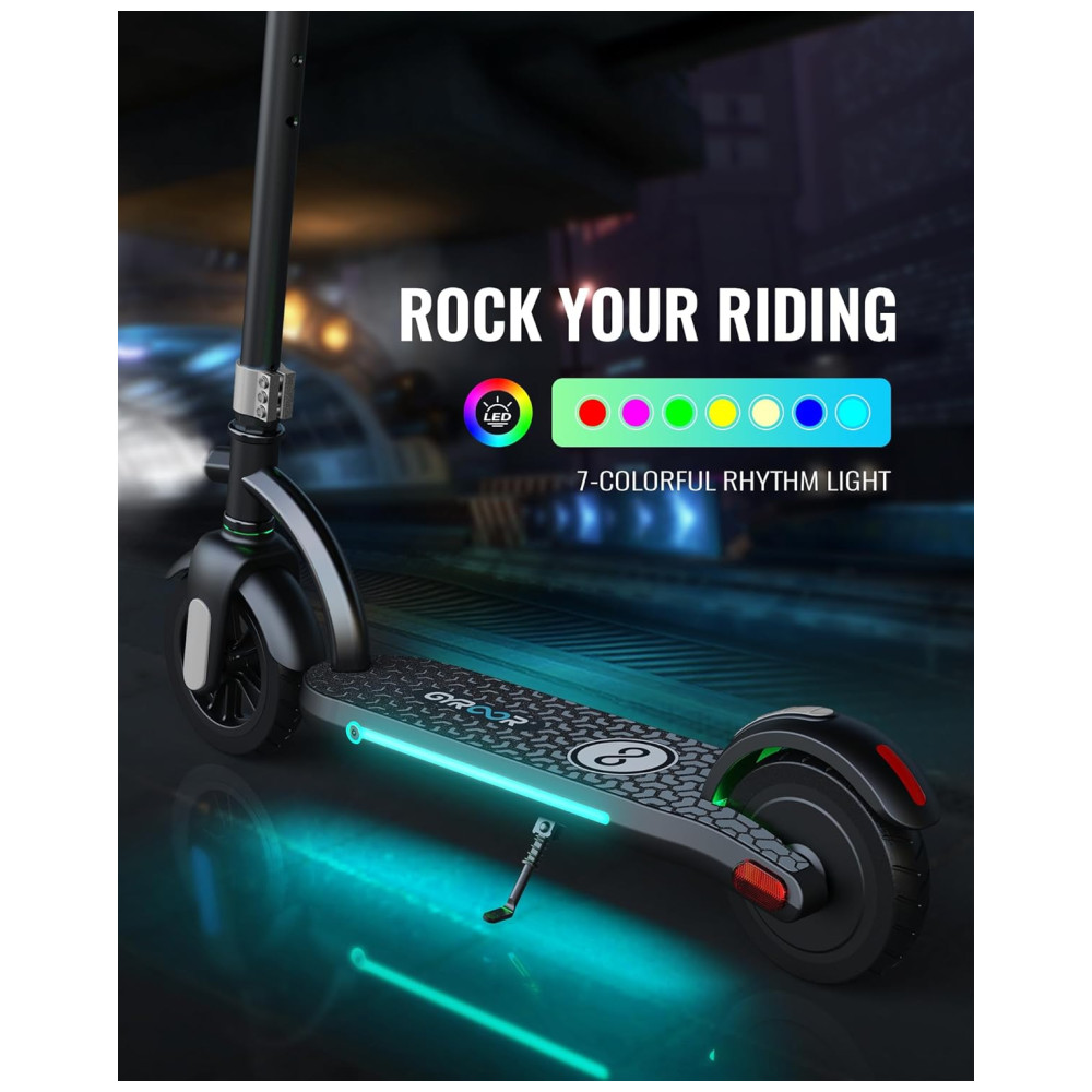 As luzes de néon gradientes de cor integradas no pedal criam visuais dinâmicos e atraentes. As luzes frontais brilhantes garantem a visibilidade, enquanto os adesivos refletivos aumentam a segurança durante passeios noturnos. A scooter oferece um guiador ajustável em altura de 3 níveis de 356 a 52 cm, adequado para a maioria das crianças e adolescentes.