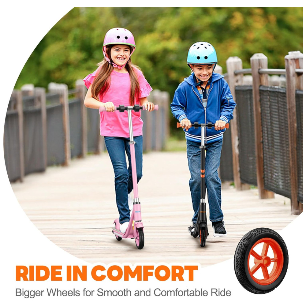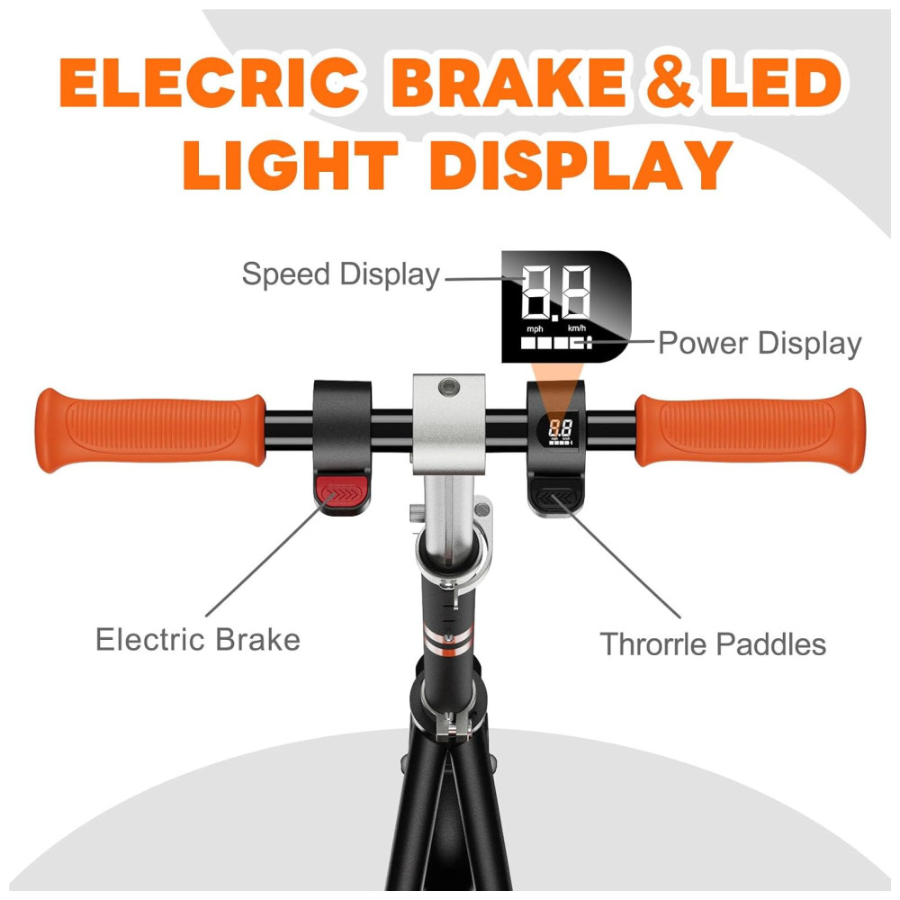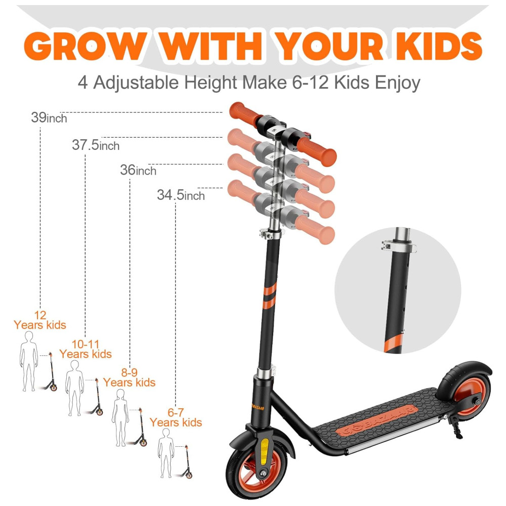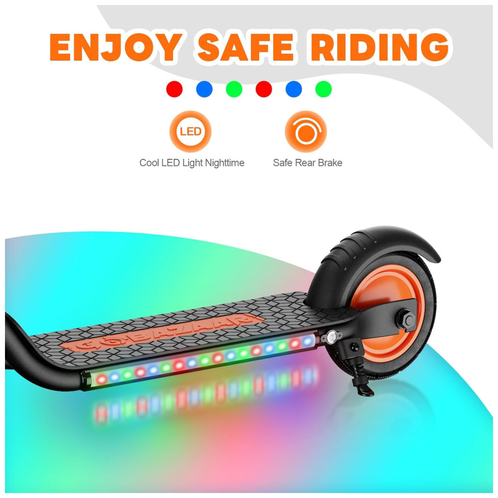 O sistema de travagem de segurança duplo inclui freio eletrônico e freio traseiro, garantindo uma parada completa dentro de uma curta distância de segurança. A scooter elétrica infantil é um presente ideal para aniversários, Dia das Crianças, Natal e outros festivais. A velocidade máxima e o alcance por carga podem variar com base em fatores como peso do piloto, superfície de pilotagem, inclinação, temperatura ambiente, nível da bateria e estilo de pilotagem.