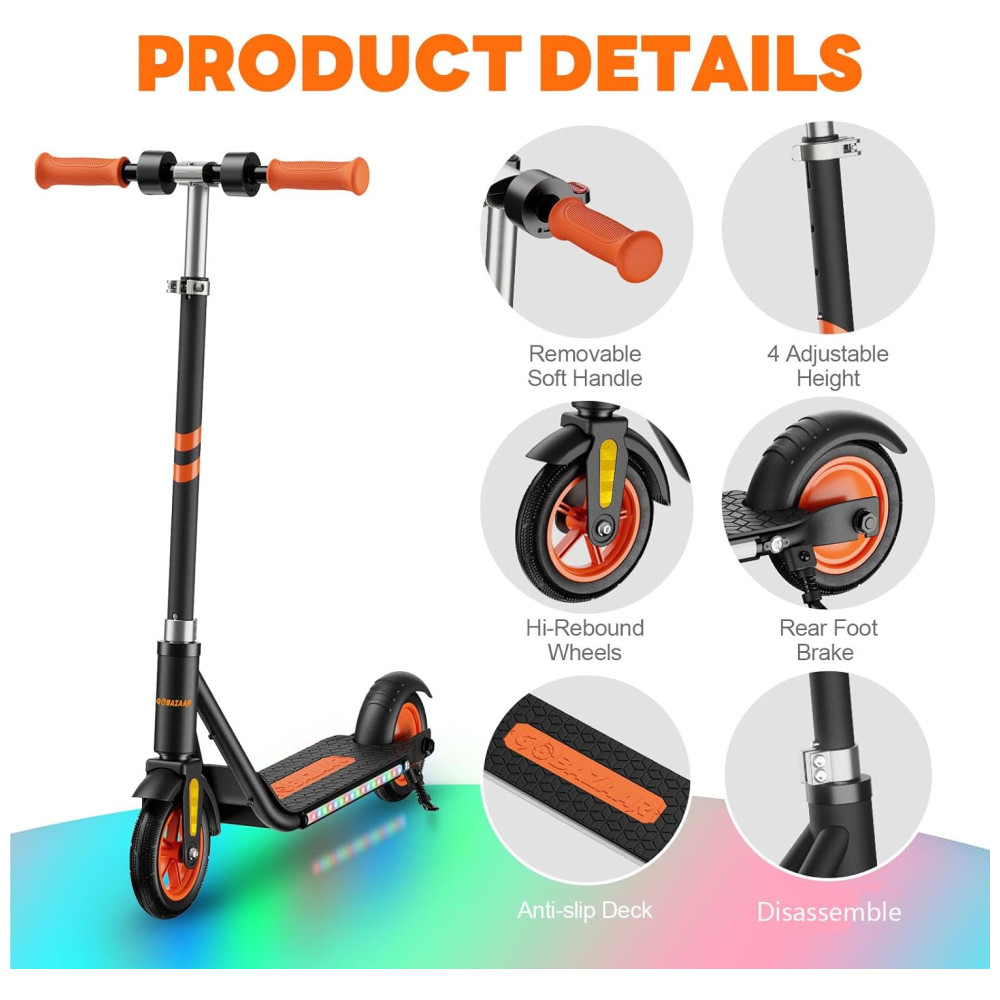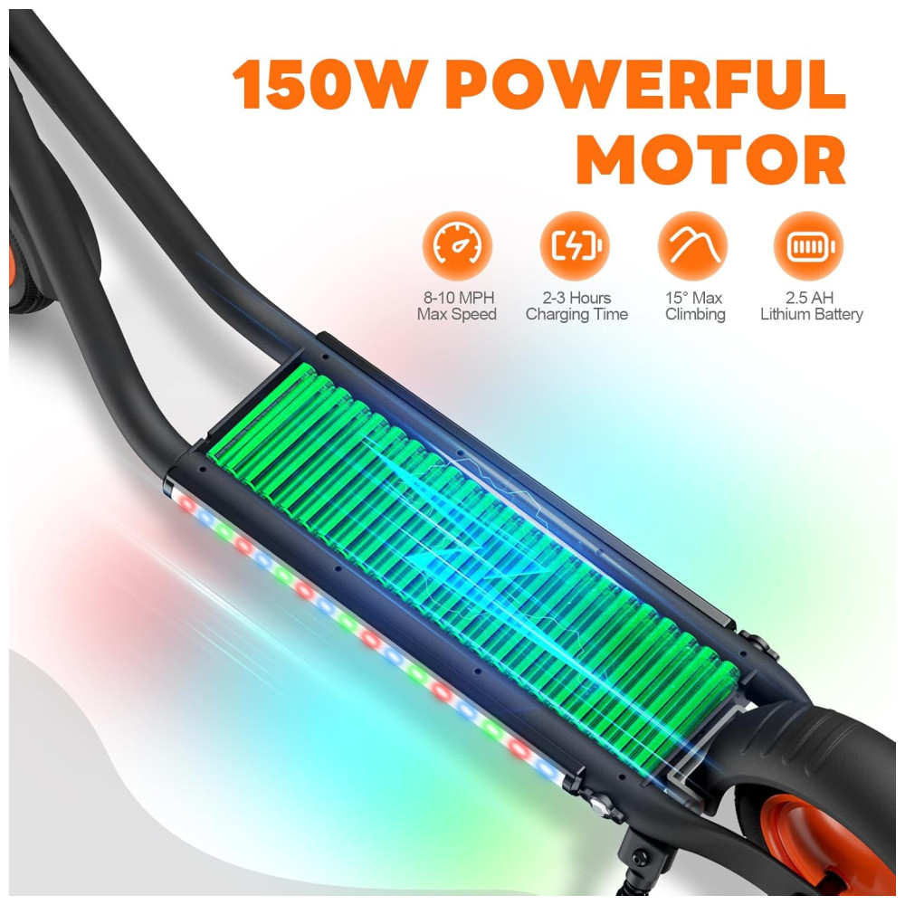 A scooter elétrica para crianças de 6 a 12 anos vem equipada com luzes LED piscantes em arco íris ao lado dos pedais, tornando a atraente e segura para passeios noturnos. O produto é fácil de montar, com o manual de instruções e os acessórios 3, 5 e 7 já instalados. A scooter tem um display LED de 3 velocidades, permitindo que a criança selecione a velocidade máxima de 8 km/h, 12km/h ou 15 km/h.