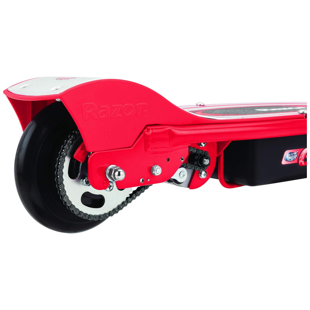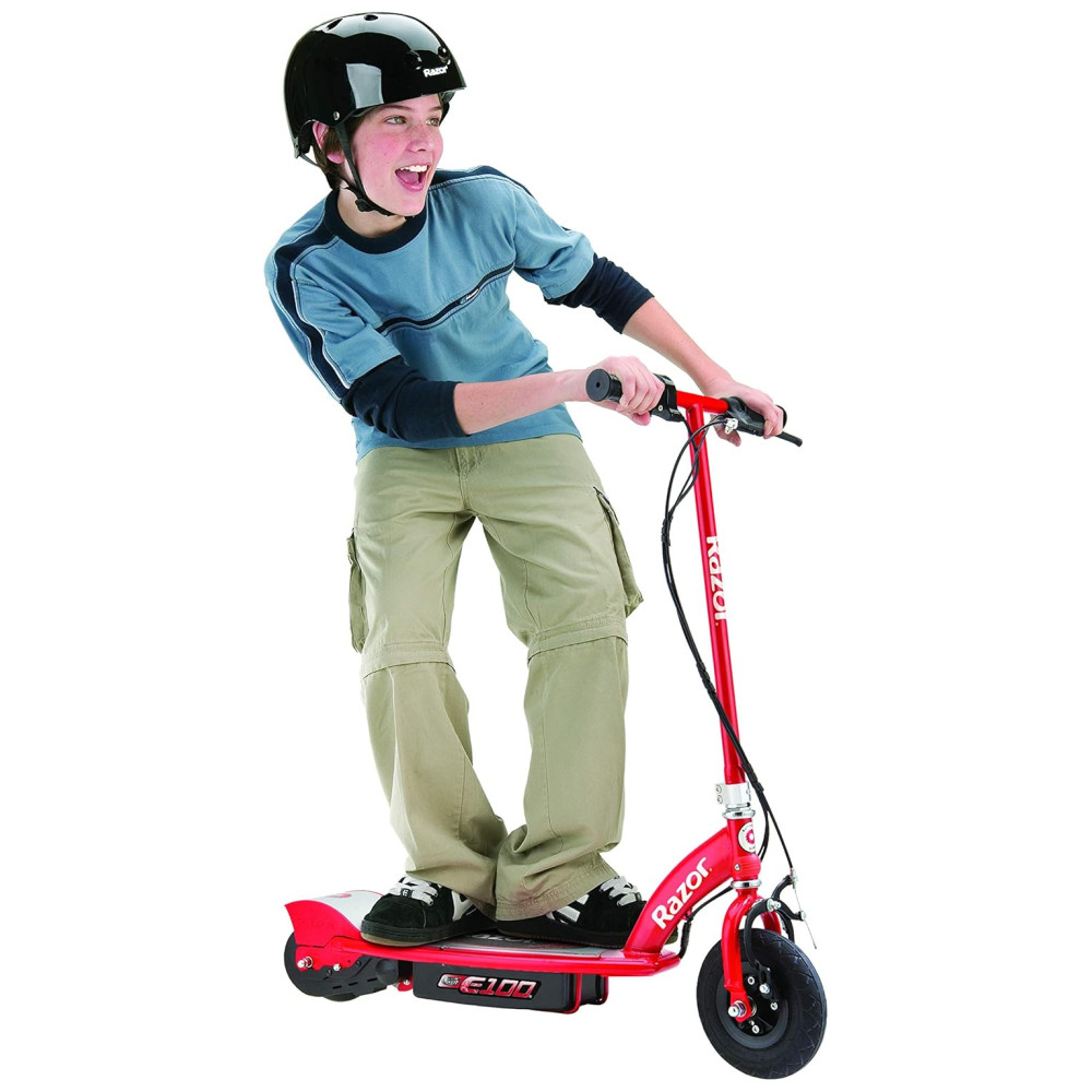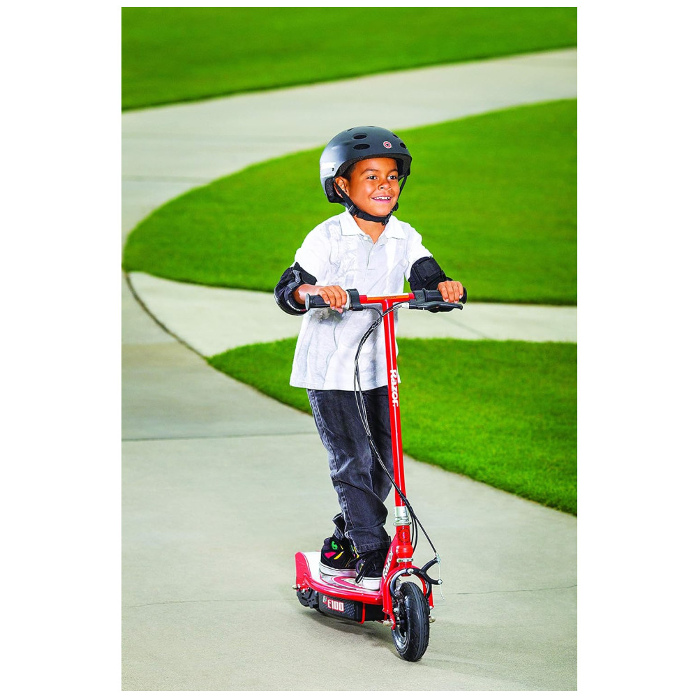 O E100 é recomendado para maiores de 8 anos e oferece capacidade máxima de peso de 54,42 quilos. Ele também vem com um par de baterias de 12 volts, um carregador e ferramentas. O comprador e o condutor da scooter E100 são responsáveis por conhecer e obedecer a todos os regulamentos locais, estaduais e federais relativos à condução e uso de scooters. A scooter elétrica Razor E100 é a introdução perfeita à diversão elétrica para pilotos a partir de 8 anos.