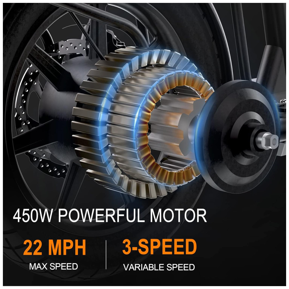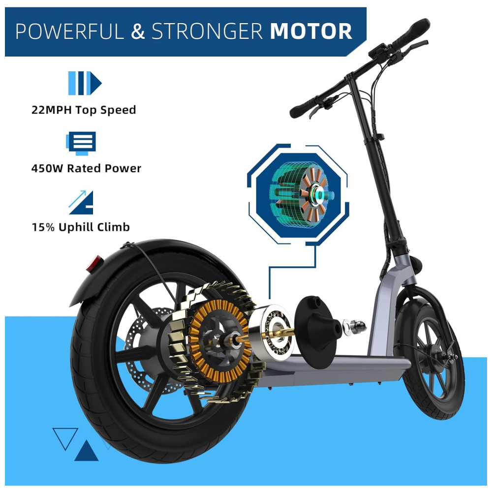 Motor de engrenagem de alta velocidade Ao contrário dos motores de cubo, esta scooter elétrica ECOM 14 equipada com motores de engrenagem de alta velocidade pode fornecer mais potência e subir colinas de 15 graus com facilidade. O motor de tração traseira de 450 W oferece velocidade máxima de 35 km.